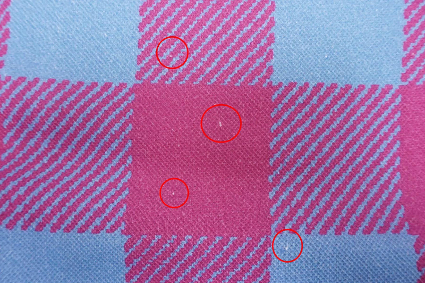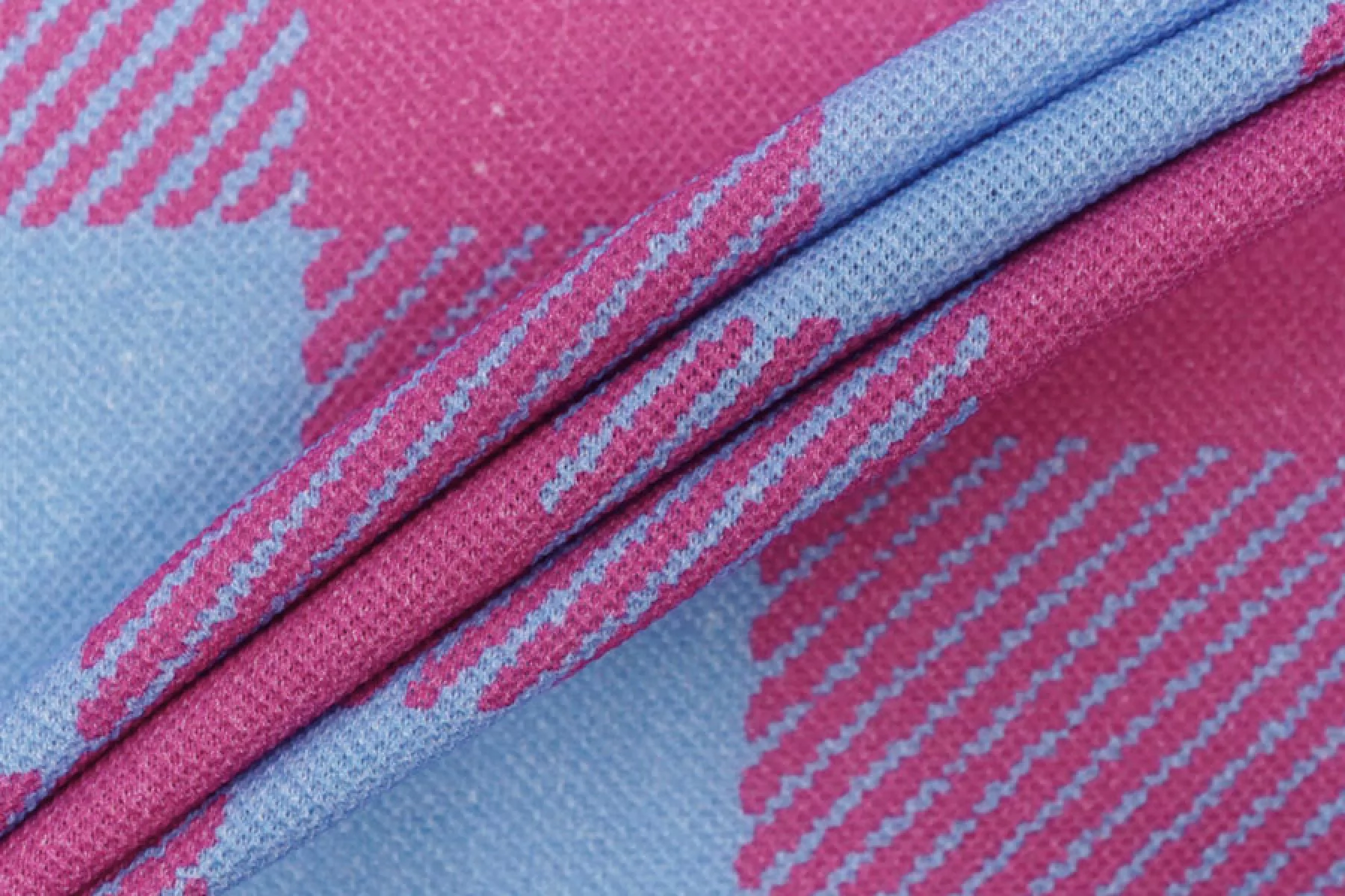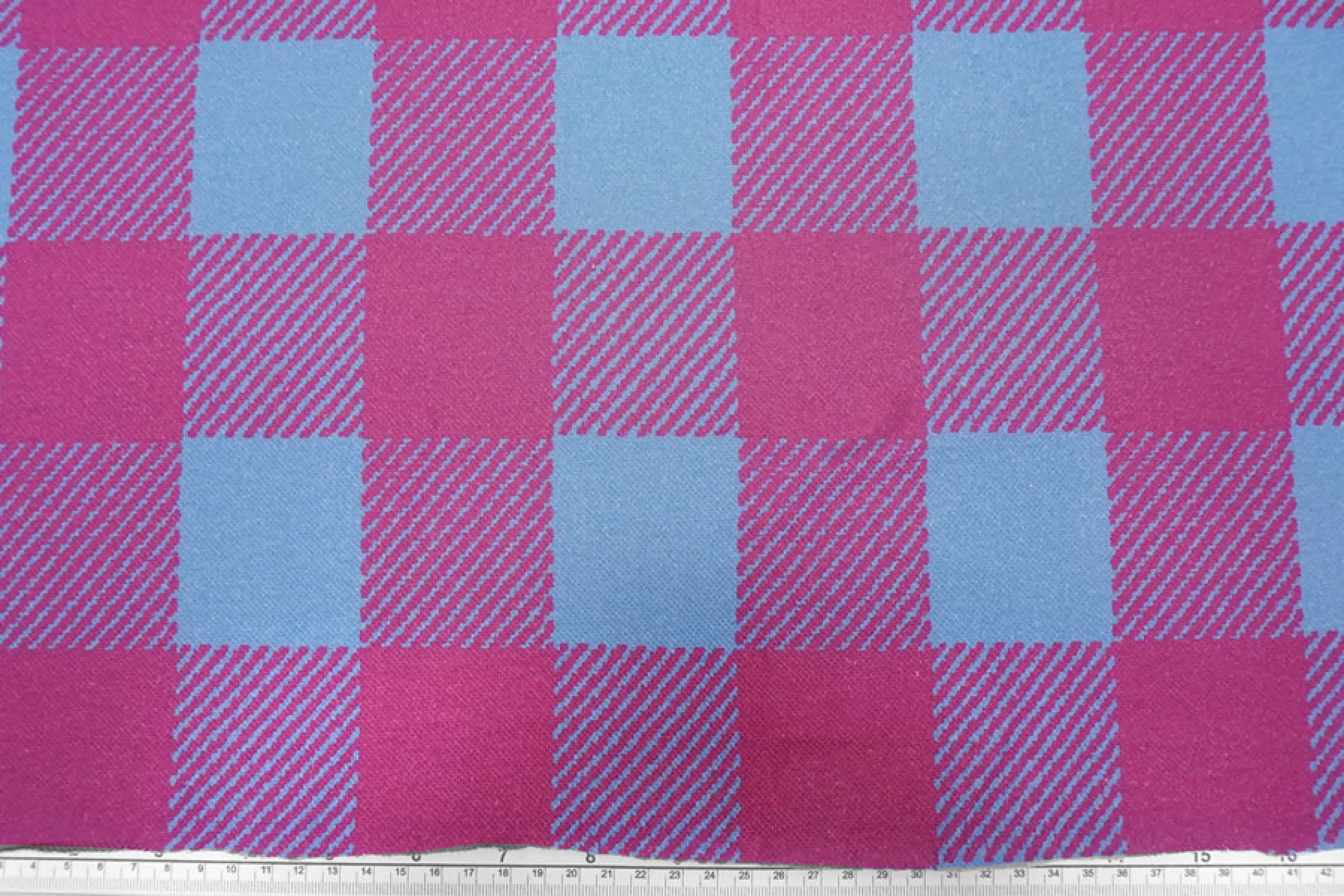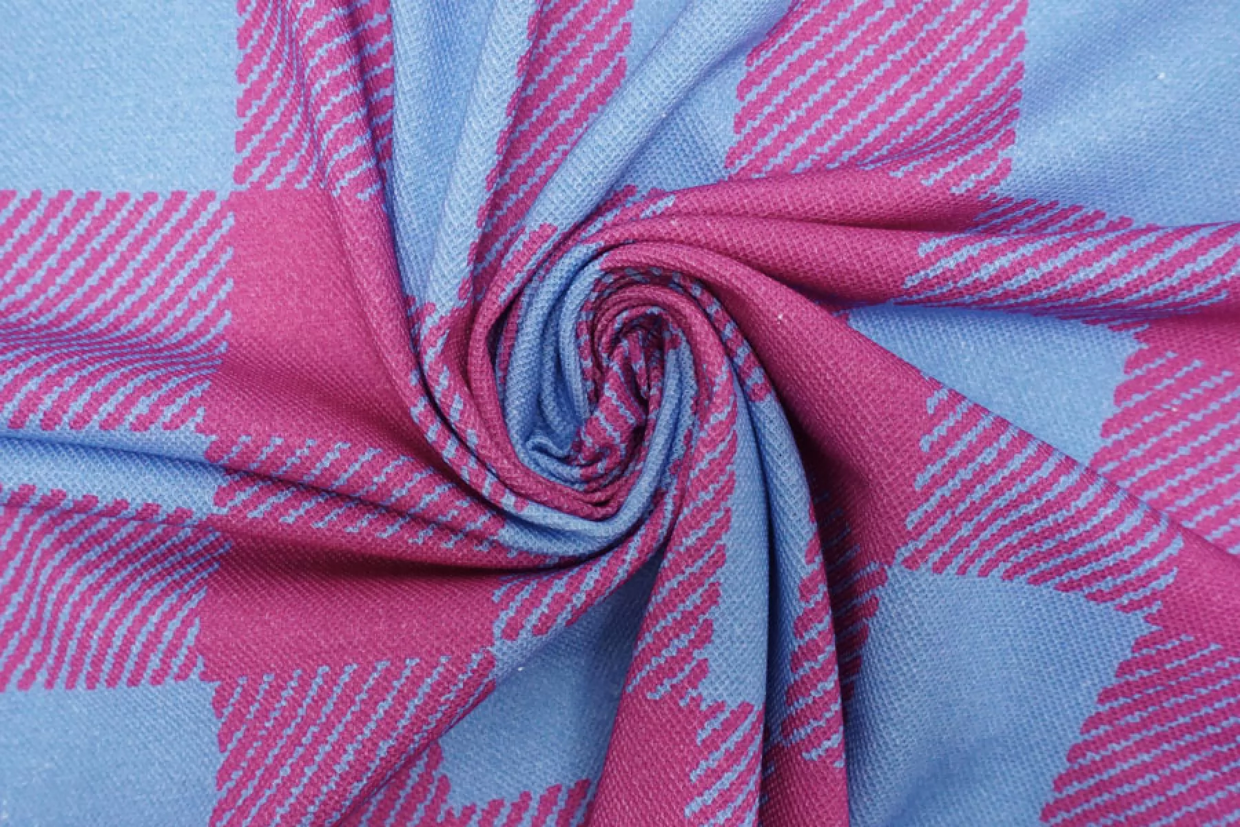 Внимание! Присутствуют белые точки (непрокрас)! Трикотаж пике из хлопка в интересной яркой расцветке в виде крупной розово-голубой клетки. Материал тактильно очень приятный, немного суховатый, ощущается фактура плетения с лицевой стороны, с изнанки ткань гладкая и скользящая. Тоненький, просвечивает силуэт на просвет. Хорошо тянется благодаря плетению. Материал имеет очень хорошую пластику, красиво драпируется и держит форму. Сминается, но быстро восстанавливается. Идеальный вариант для пошива рубашек и футболок-поло.