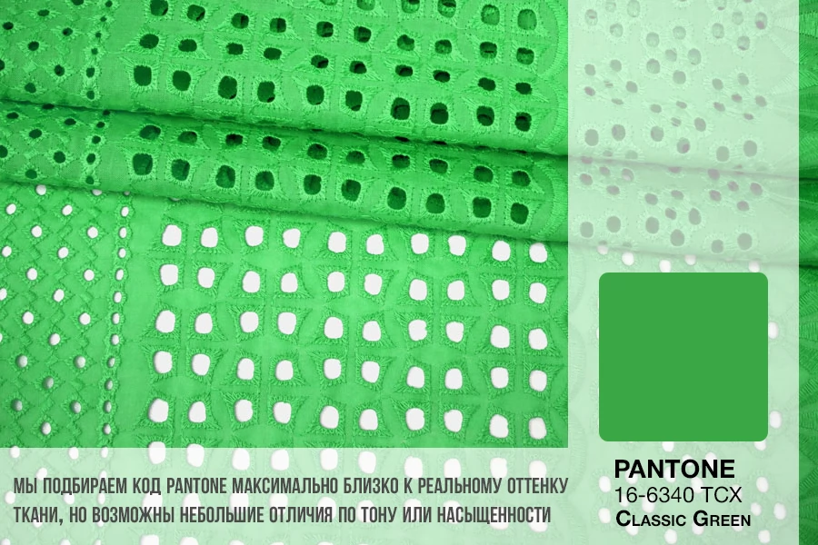 ЦЕНА УКАЗАНА ЗА ОТРЕЗ! (При заказе в метраже указывать 1) Очень красивое хлопковое шитье зеленого цвета с цветочным и геометричным орнаментом. В основе ткани хлопок. У материала фестонный край с двух сторон. Материал немного жестковатый, держит форму. Просвечивает. Слегка мнется. Не тянется. Прекрасный вариант на платья, сарафаны, блузки и юбки. Для однослойных изделий при необходимости используйте подкладочный материал.