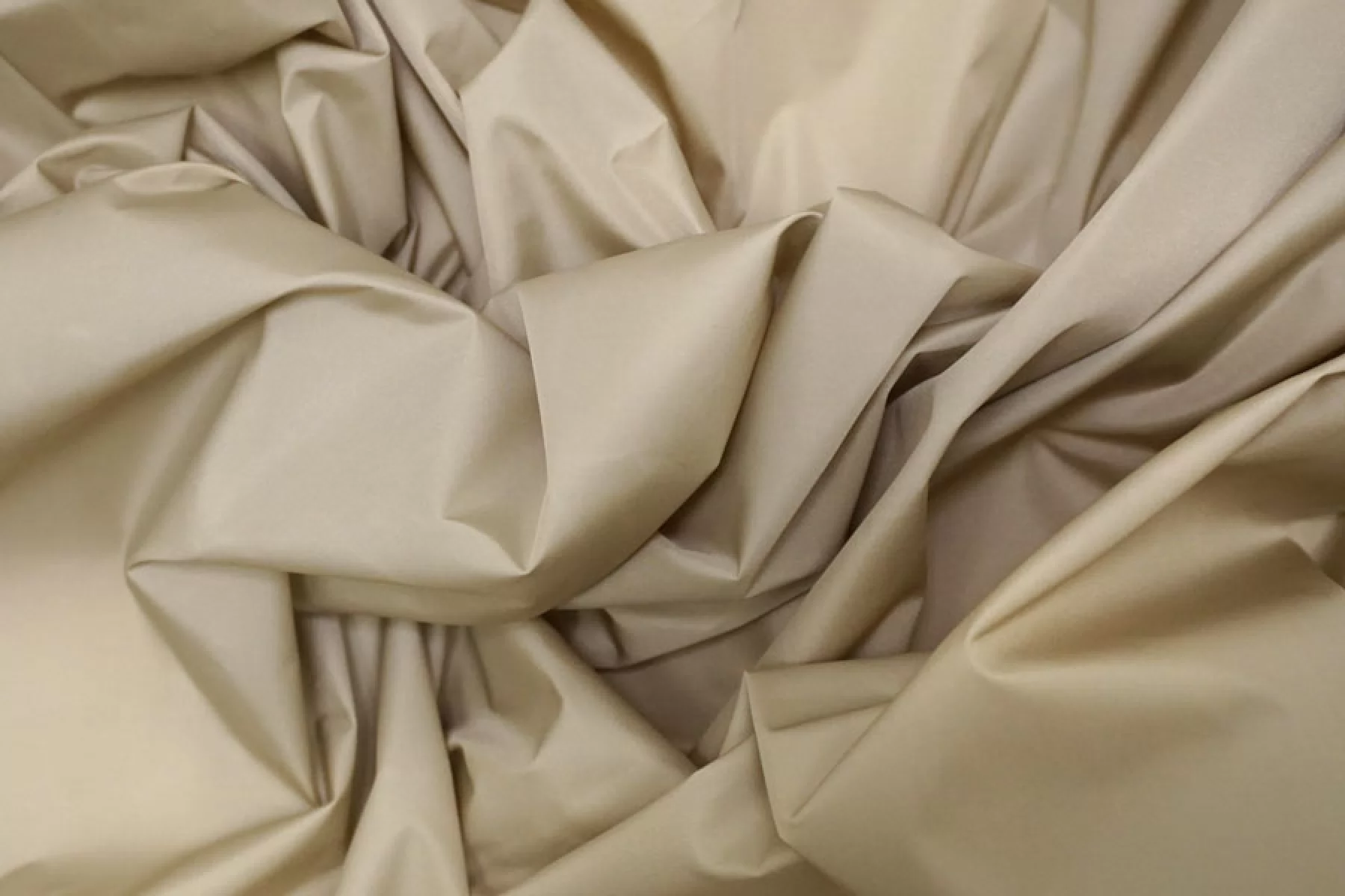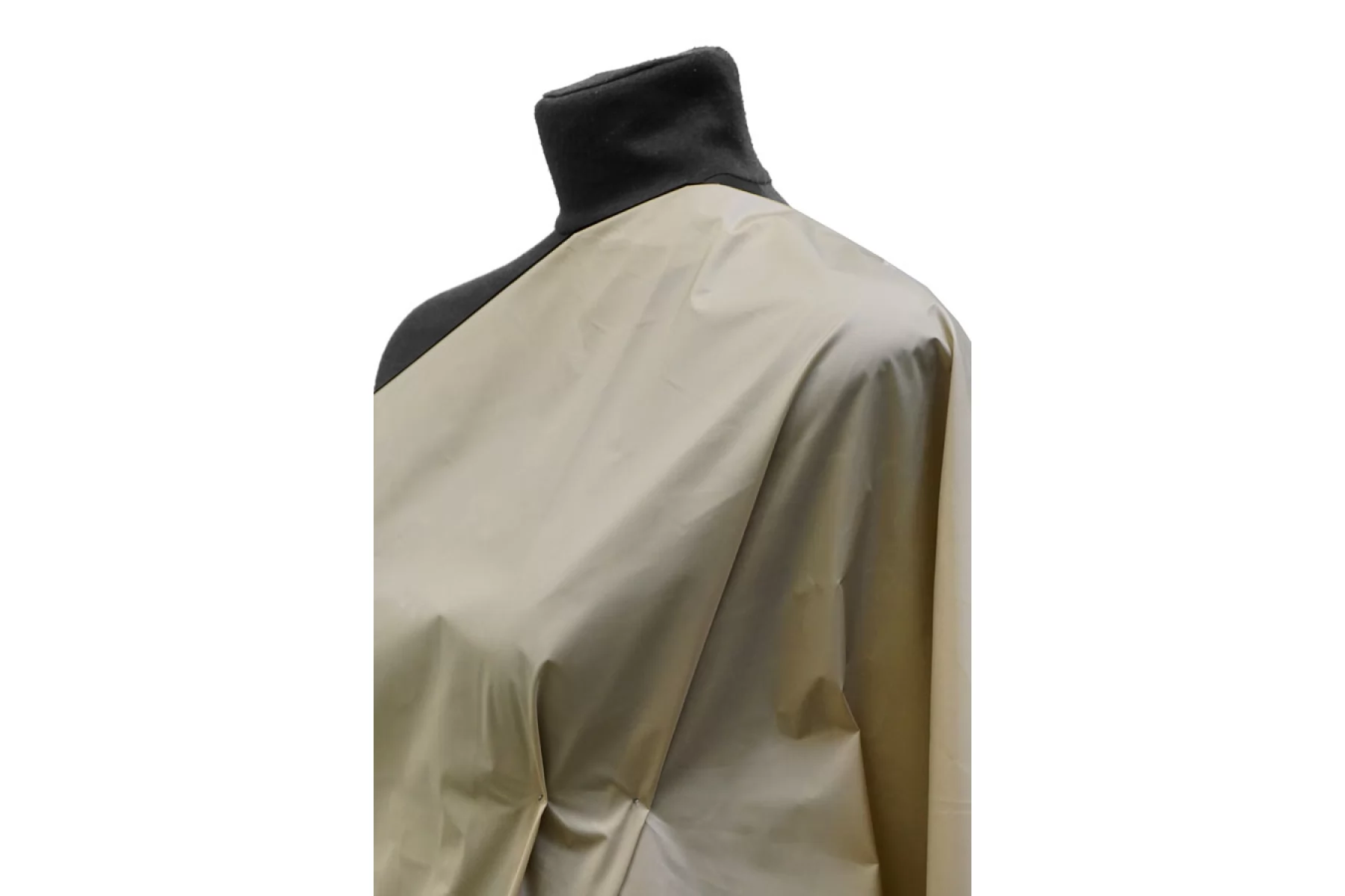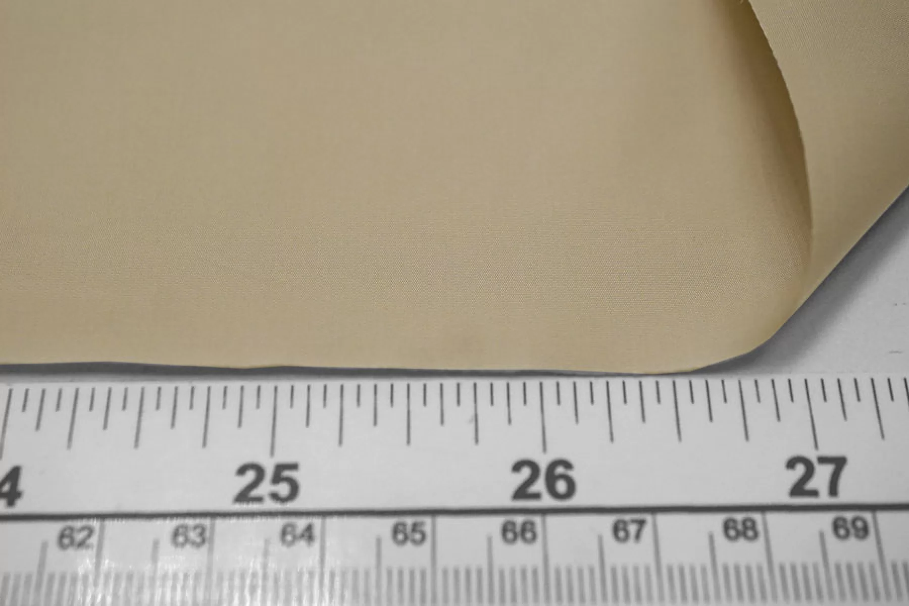 На отрезе заломы! Плащевка тонкая, в светлом песочном серо-бежевом оттенке от MAX MARA. Обладает матовым отблеском. Гладкая, шуршащая. Плотная, легкая. Похрустывает. Ветрозащитная, вода скатывается с поверхности. Сминается. Может слегка просвечивать силуэт. Немного держит форму но при этом пластичная. Прекрасно подойдет для пошива дождевика, куртки, плаща, жилета (простегать с наполнителем и подкладкой).