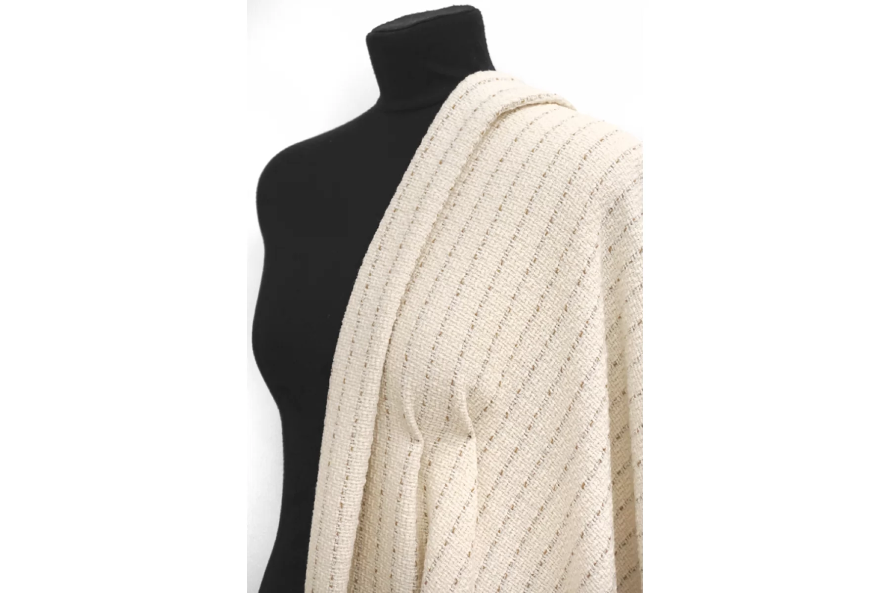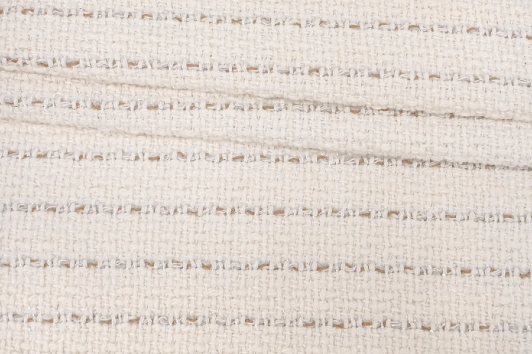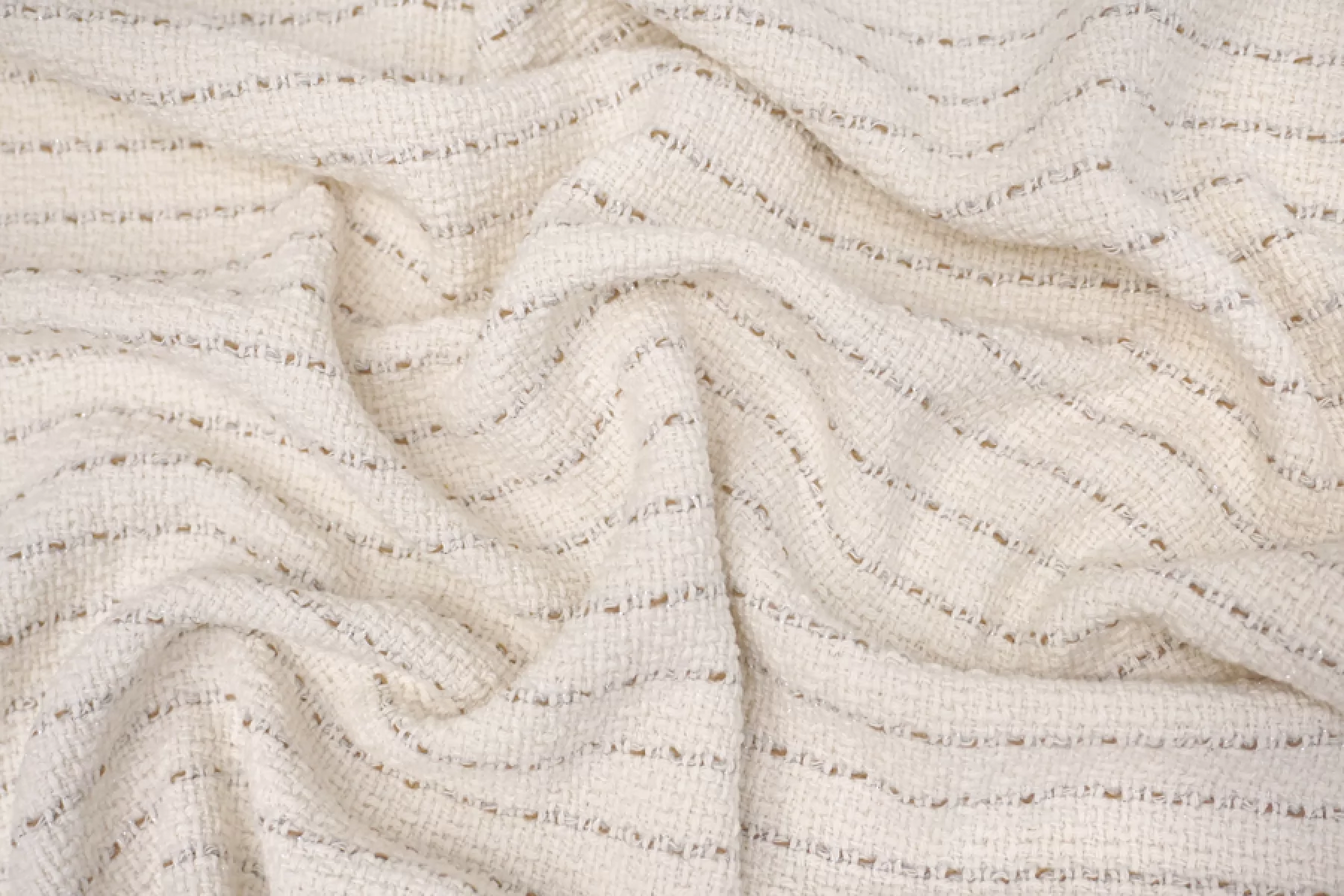 ЦЕНА УКАЗАНА ЗА ОТРЕЗ! (При заказе в метраже указывать 1) Твид шанель в нежном молочном оттенке с добавлением люрекса. Мягкий, фактурный, приятный наощупь. Примерно 2 мм толщиной. Не тянется. Не просвечивает. Плетение немножко рыхловатое, не слишком плотное. Практически не мнется. Хорошо драпируется, немного держит форму. Прекрасно подойдет на костюмные варианты, жакеты, юбки, платья, а благодаря люрексю подойдет и на нарядную группу.