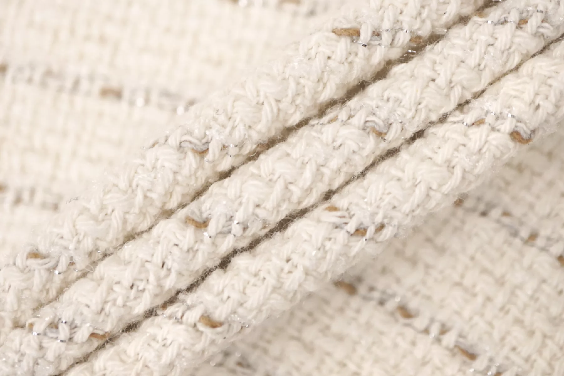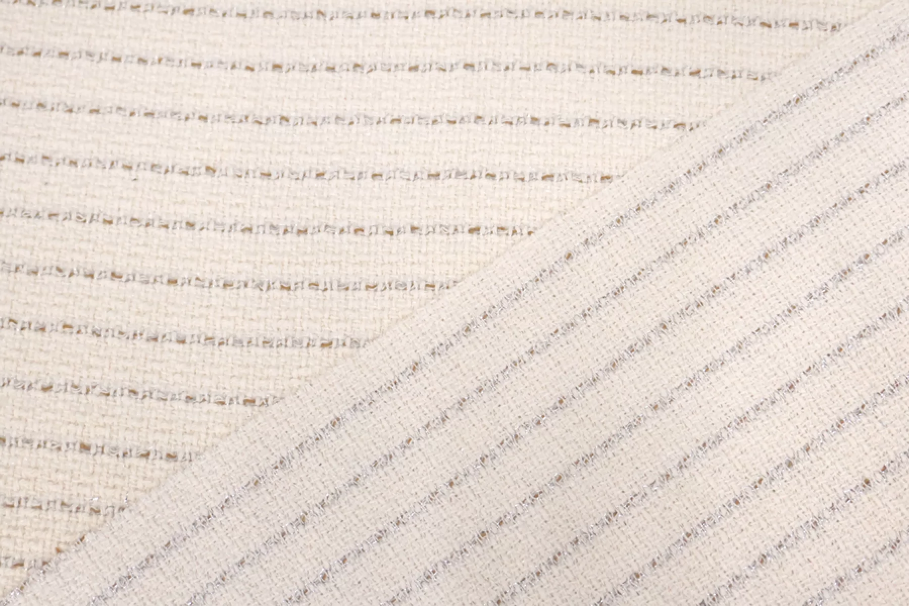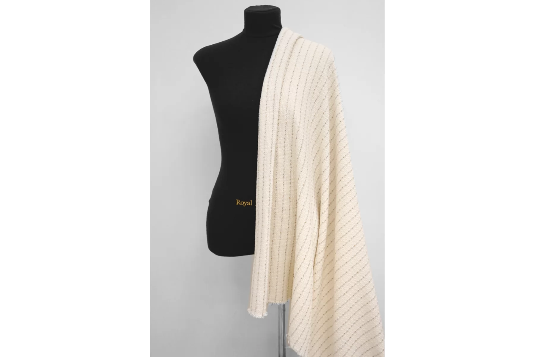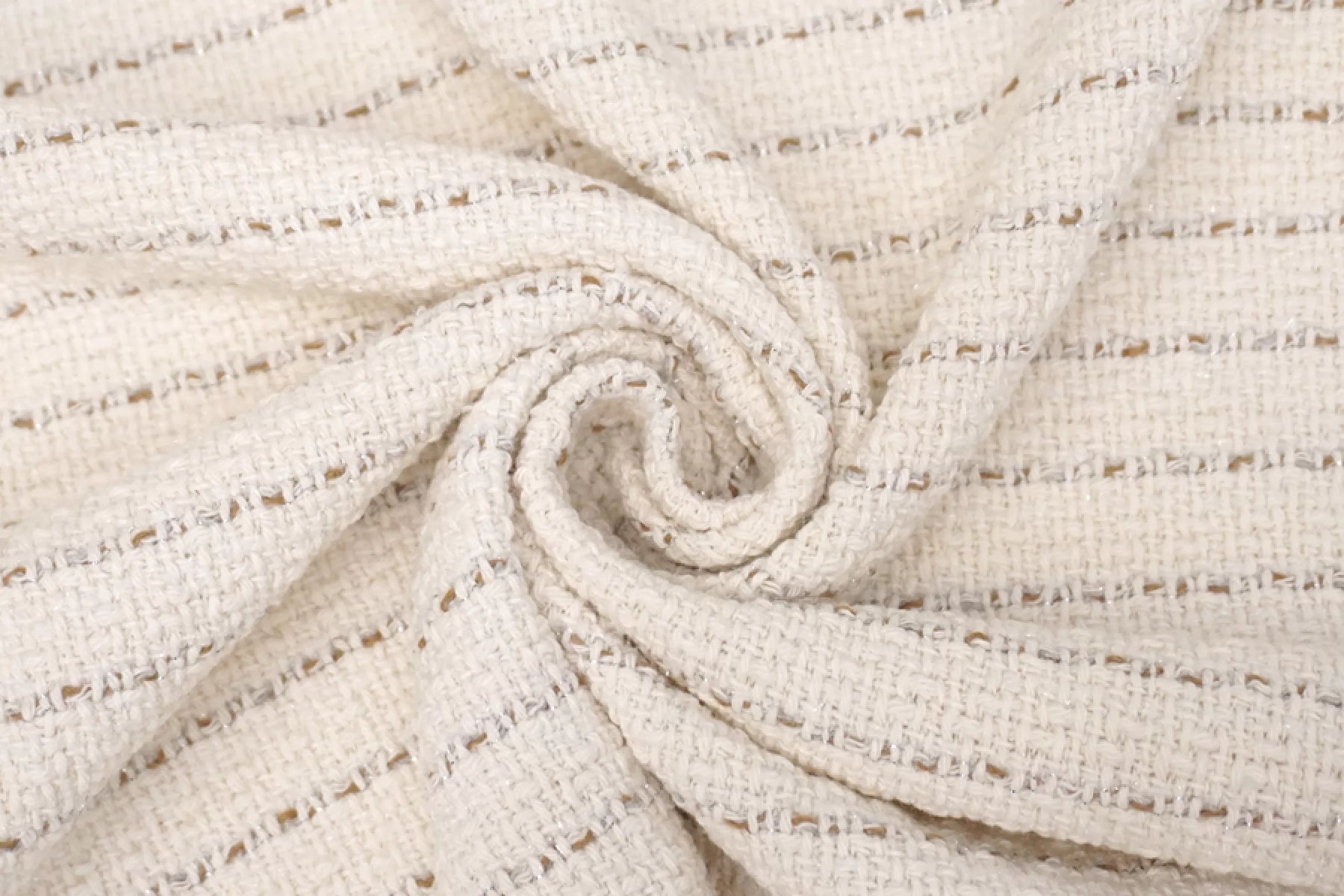 ЦЕНА УКАЗАНА ЗА ОТРЕЗ! (При заказе в метраже указывать 1) Твид шанель в нежном молочном оттенке с добавлением люрекса. Мягкий, фактурный, приятный наощупь. Примерно 2 мм толщиной. Не тянется. Не просвечивает. Плетение немножко рыхловатое, не слишком плотное. Практически не мнется. Хорошо драпируется, немного держит форму. Прекрасно подойдет на костюмные варианты, жакеты, юбки, платья, а благодаря люрексю подойдет и на нарядную группу.