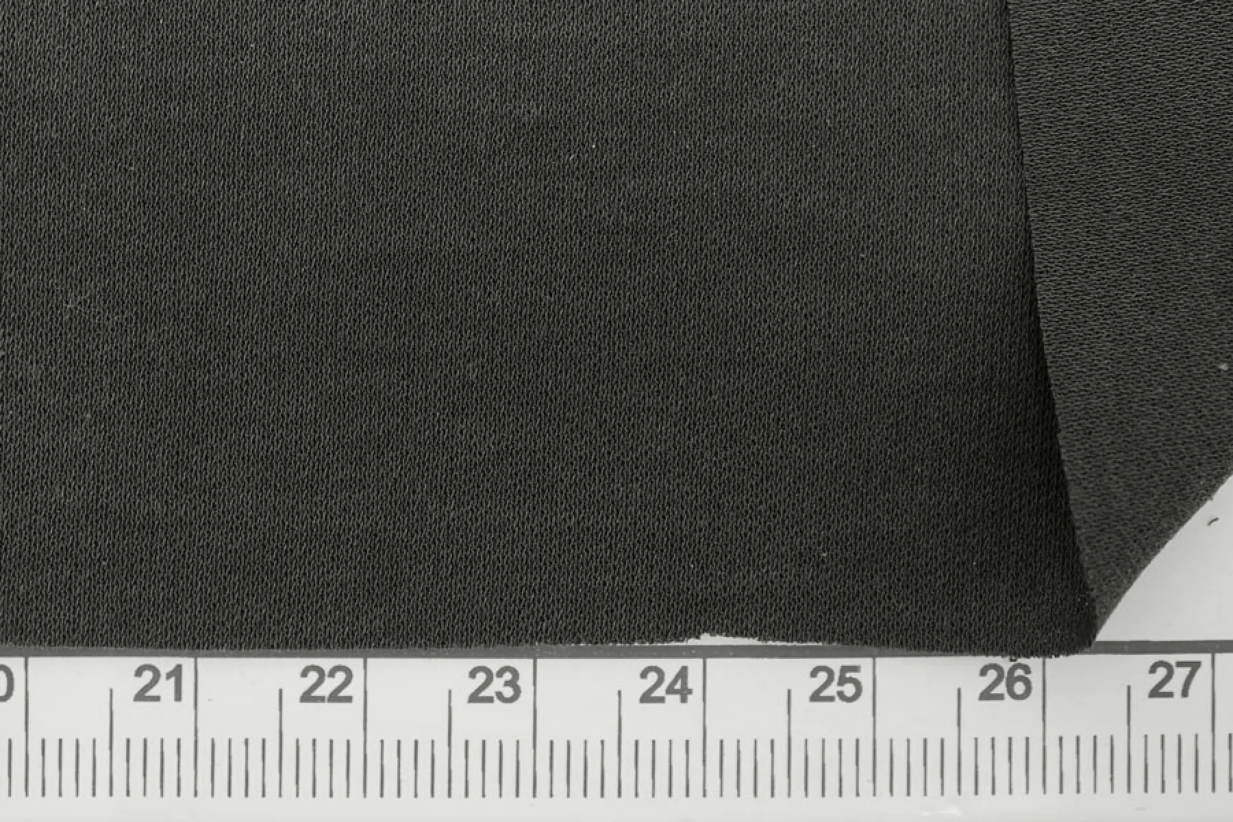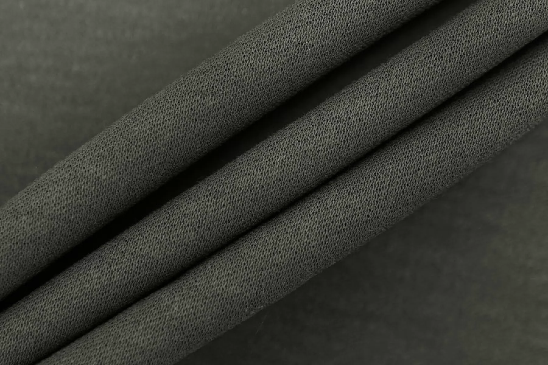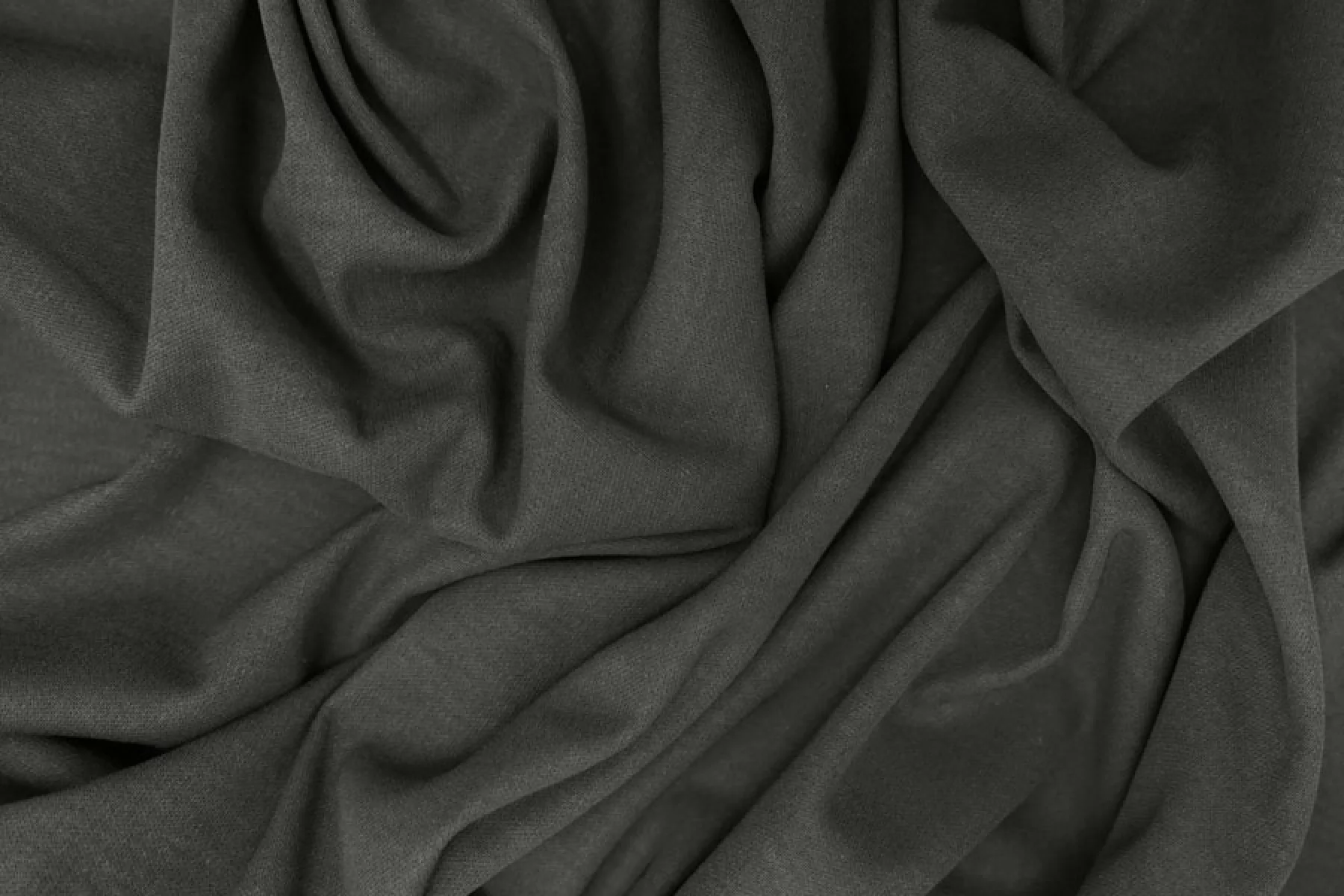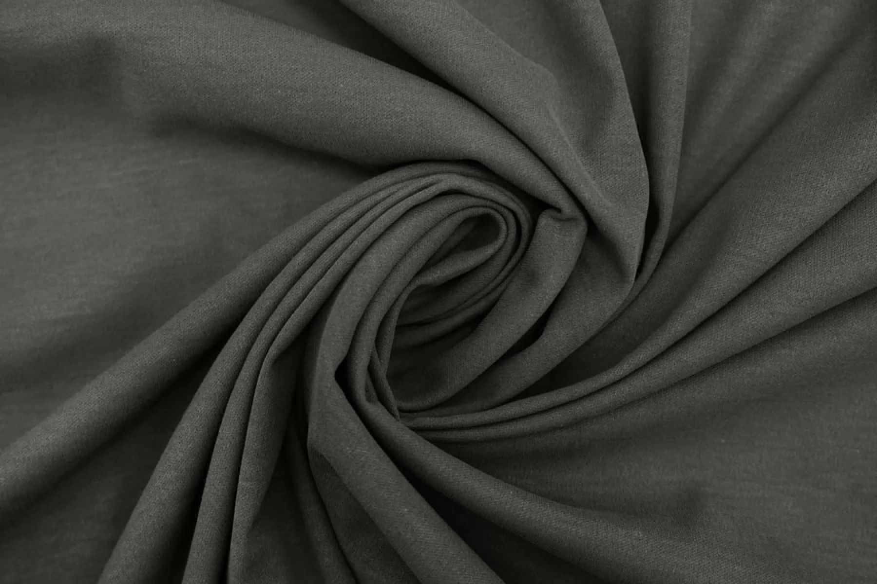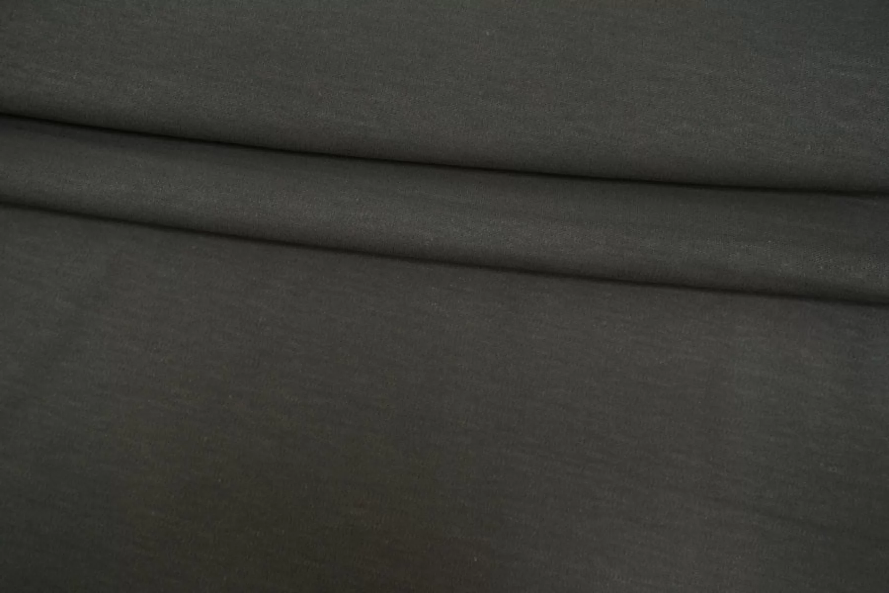 Вдоль всего отреза проходит стрелка в 40 см. от кромки! Креповый вискозный трикотаж в тёмно-сером цвете. Тонкий. Слегка холодящий, но не такой скользящий, как классические холодные трикотажи. Шероховатый тактильно, ниспадающий. Эластичный, просвечивает, не мнется. Подойдет для пошива платья (нужна подкладка или многослойность), юбки, футболки, майки, можно использовать в качестве подкладочного материала.