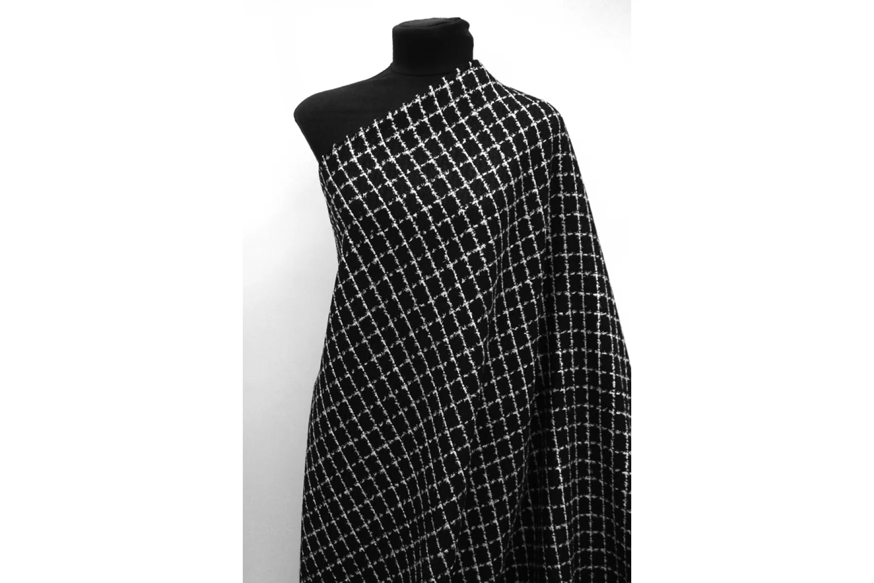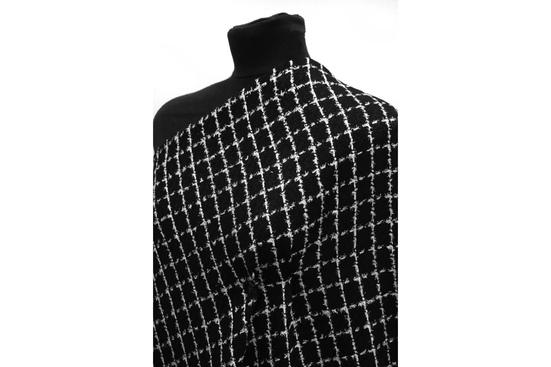 ЦЕНА УКАЗАНА ЗА ОТРЕЗ! (При заказе в метраже указывать 1) Прекрасный шерстяной твид шанель черного цвета в бело-серую клетку с люрексом. Шероховатый и суховатый наощупь. Чувствуется фактура. Слегка колется. Немного светит. Не тянется. Примерно 1,5 мм толщиной. Не мнется. Хорошо драпируется и держит форму. Прекрасно подойдет на костюмные варианты, жакеты, юбки, платья. Уход деликатный.
