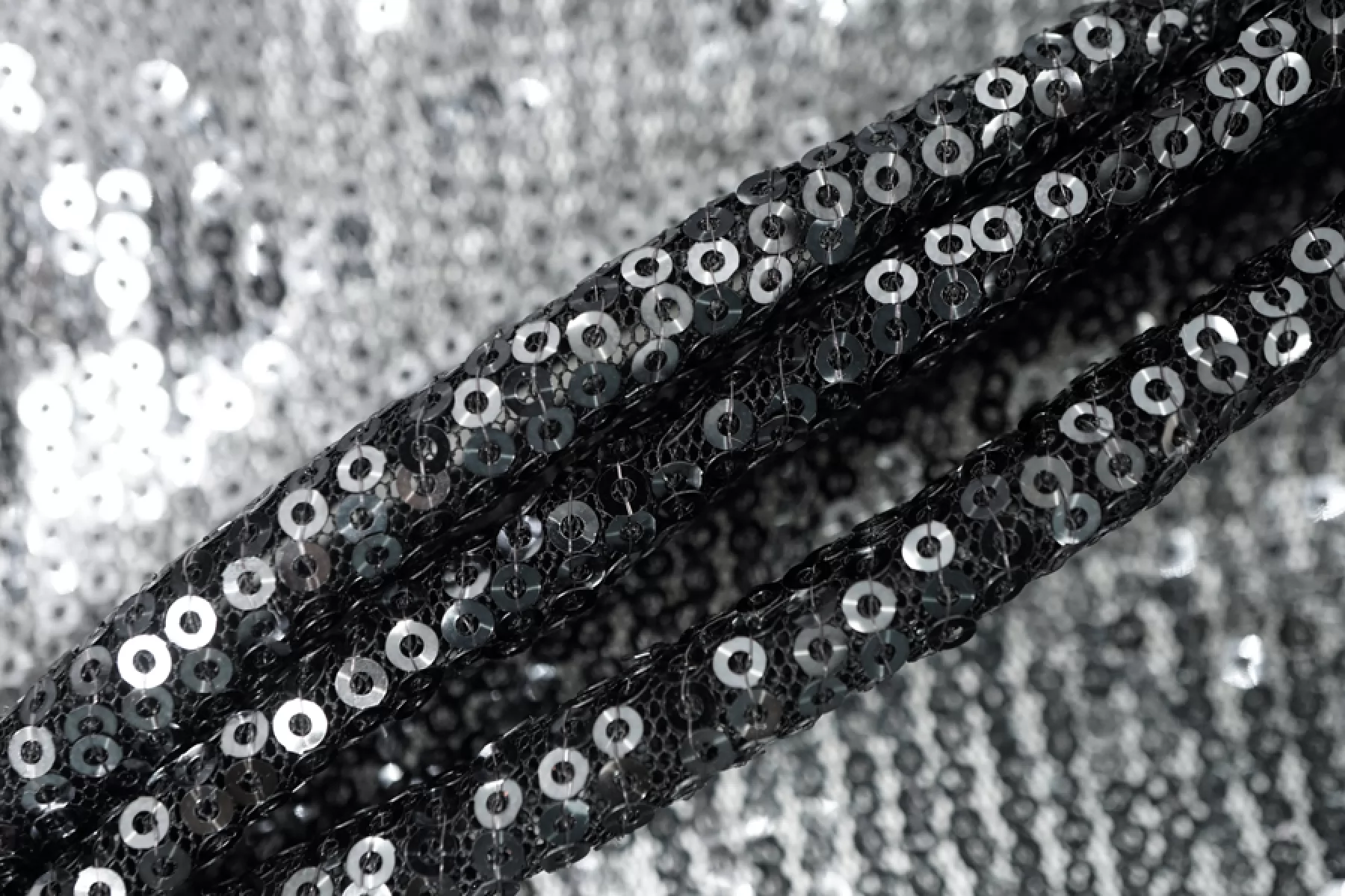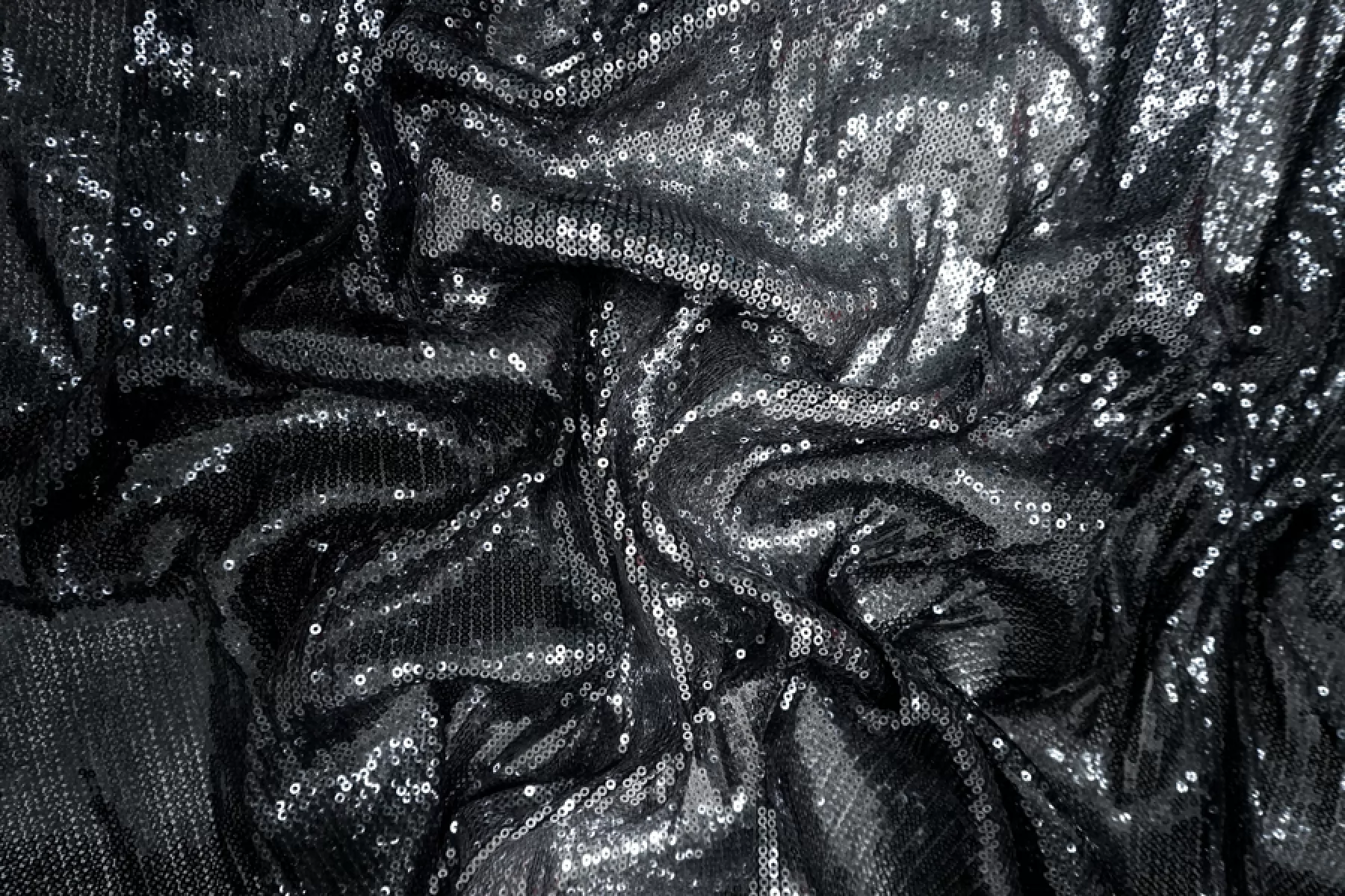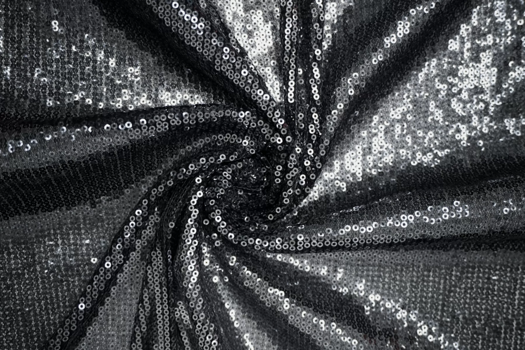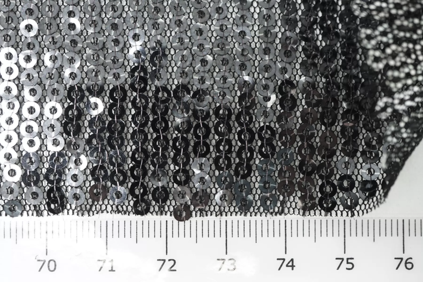 Внимание! Встречаются зацепки заметно с изнанки, а так же встречаются не пришитые пайетки см. фото. Очень классная нарядная сетка с пайетками, нашитыми тонкой прозрачной леской вдоль длины. У материала есть эффект деграде - очень красивый и плавный переход от черного к серебряному и от серебряного оттенка пайеток к черному ( цвет нанесен на серебряную основу пайеток). Обратите внимание, что зона пайеток 130 см, темная рабочая зона - 122 см ( по краям идут серебряные полосы неравномерной ширины, можно использовать, например, на воротнички и манжеты). В основе мягкая мелкая сетка в черном оттенке. Просвечивает. Обладает приятным выраженным блеском. Тактильно жестковатая за счет пайеток, но пластичная. Неплохо тянется по ширине. Красива в складках. Прекрасно подойдет для пошива нарядного платья, юбки или костюма. При необходимости используйте подкладочный материал.