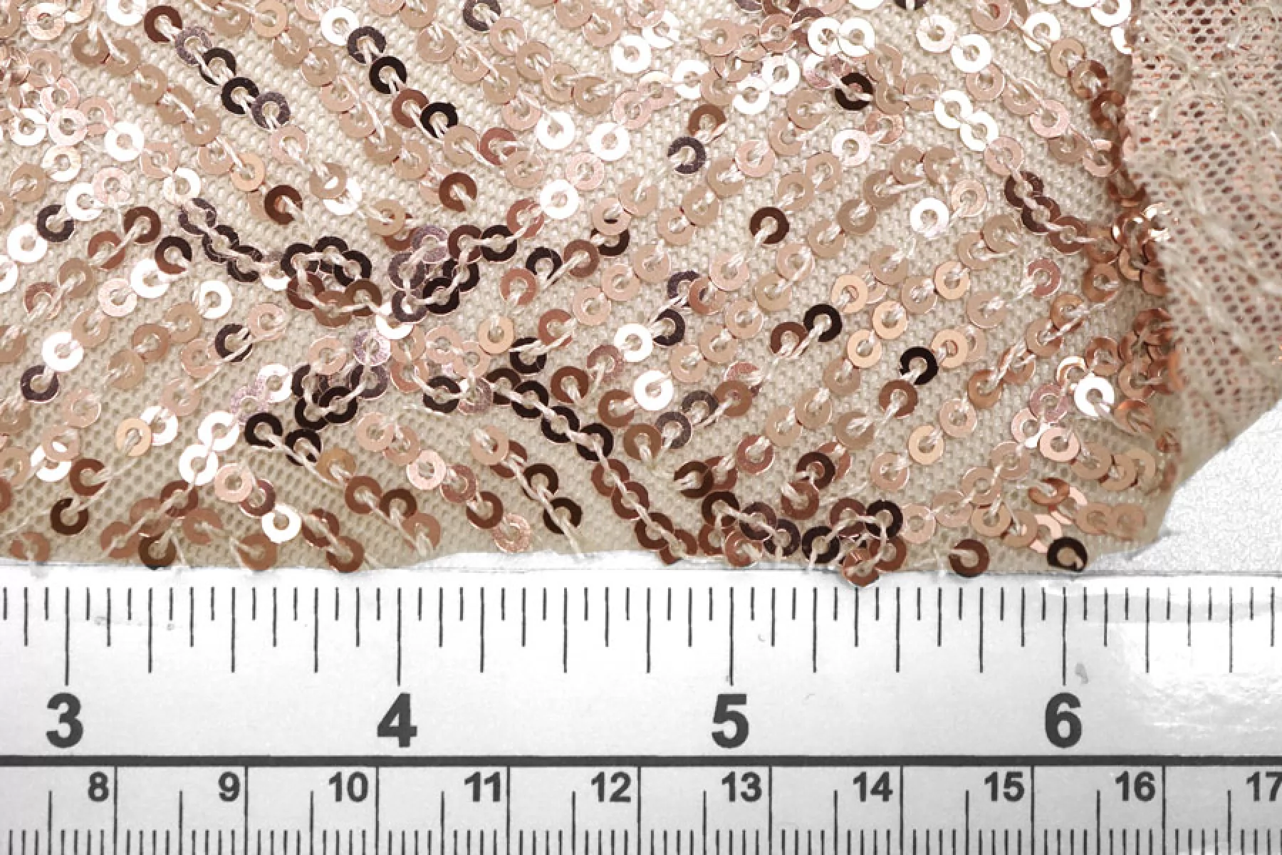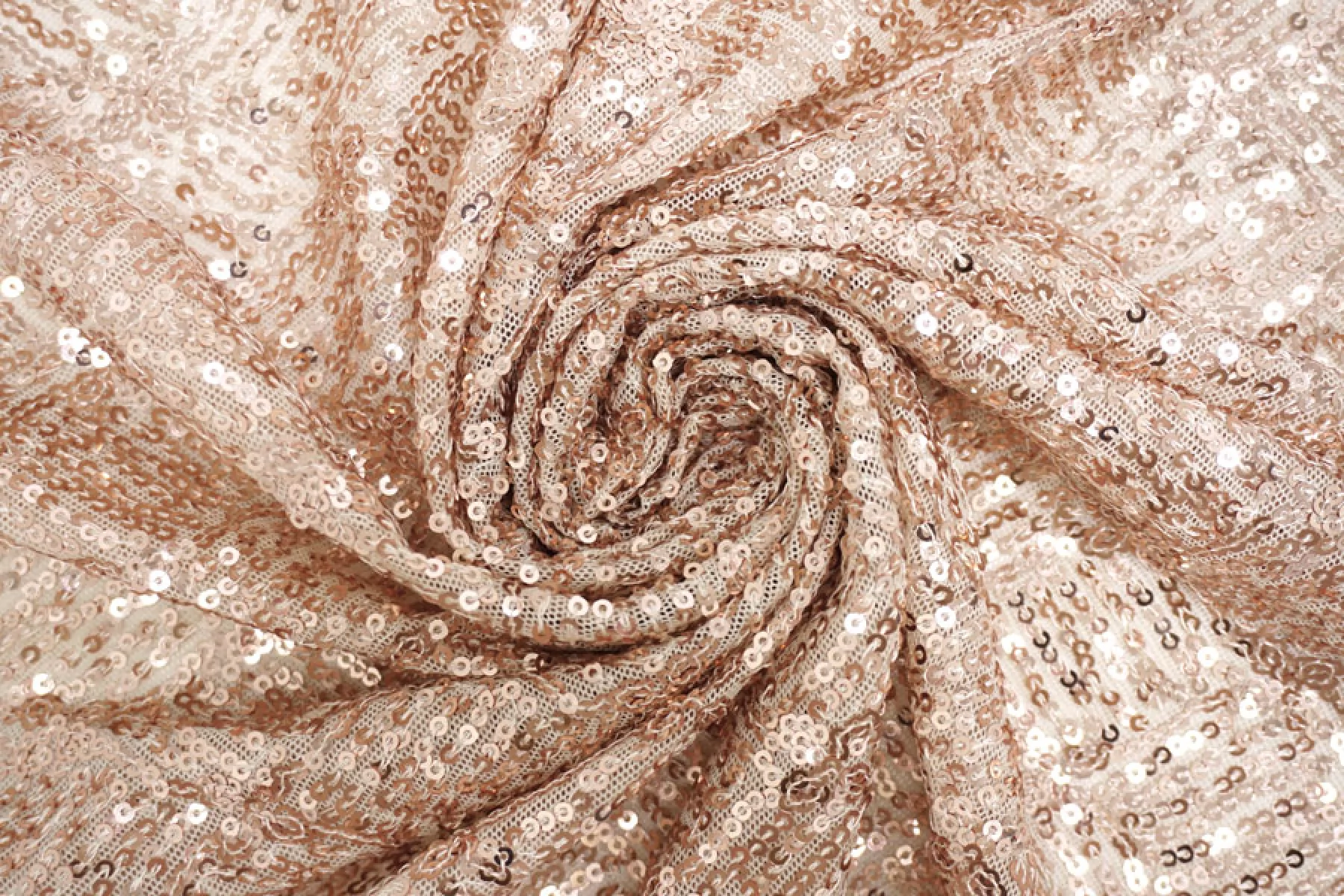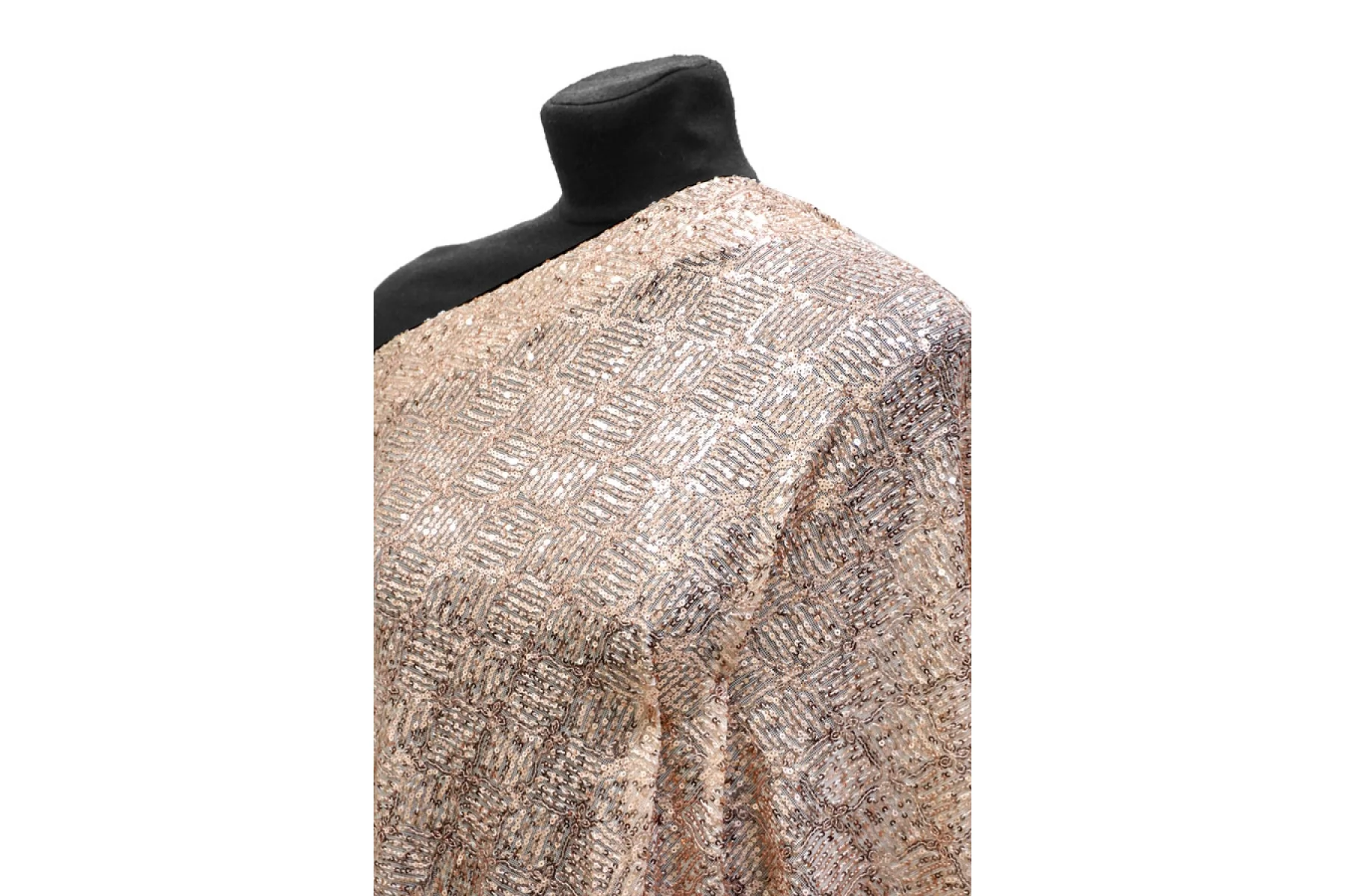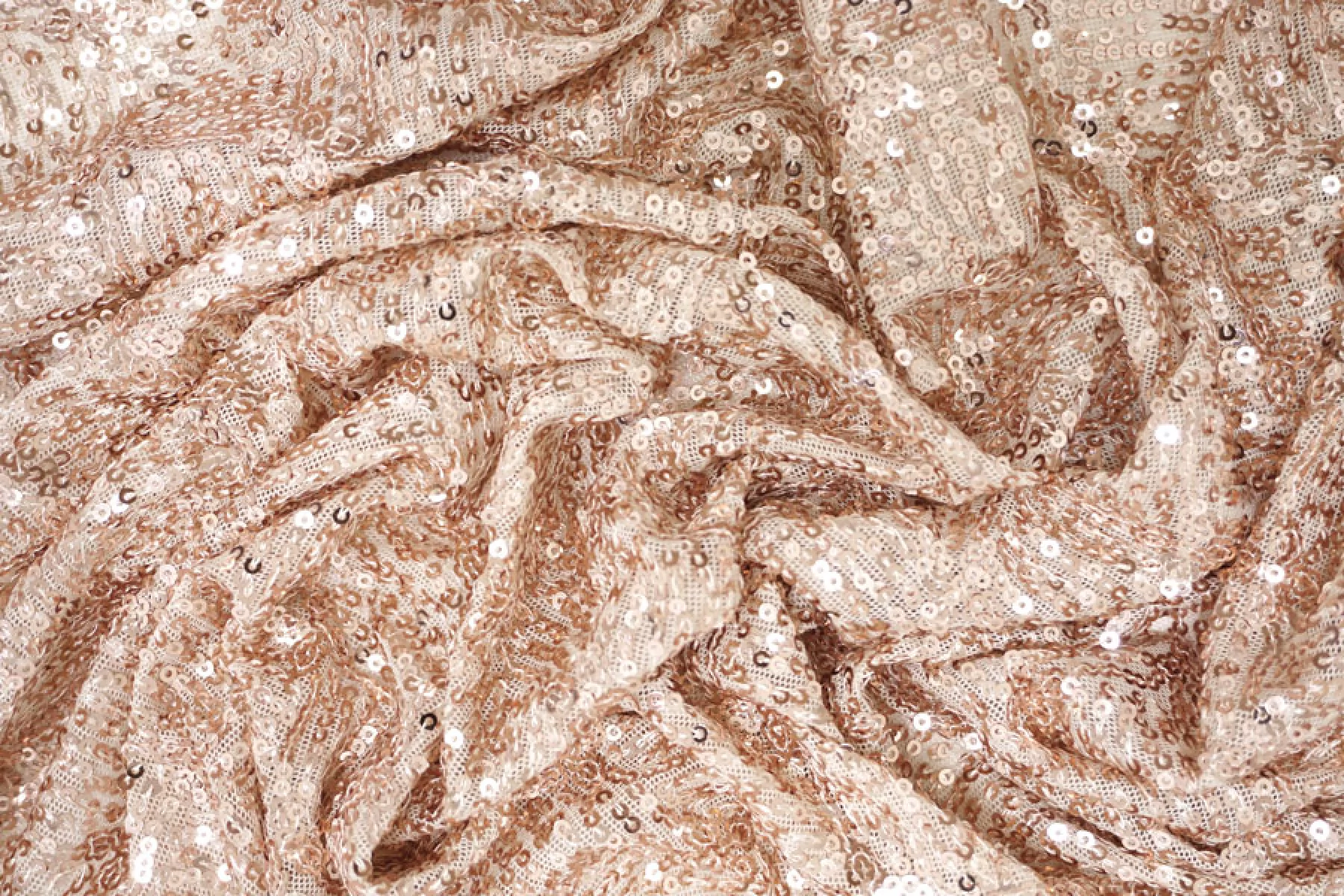 Нарядная сетка с пайетками, нашитыми нитью в тон основе. В основе мягкая мелкая сетка в светло-бежевом оттенке, пайетки цвета розового золота. Просвечивает. Обладает приятным выраженным блеском. Тактильно жестковатая за счет пайеток, но пластичная. Тянется во все стороны. Прекрасно подойдет для пошива нарядного платья, юбки или костюма. При необходимости используйте подкладочный материал.