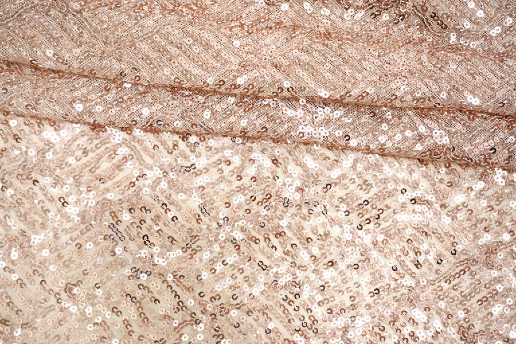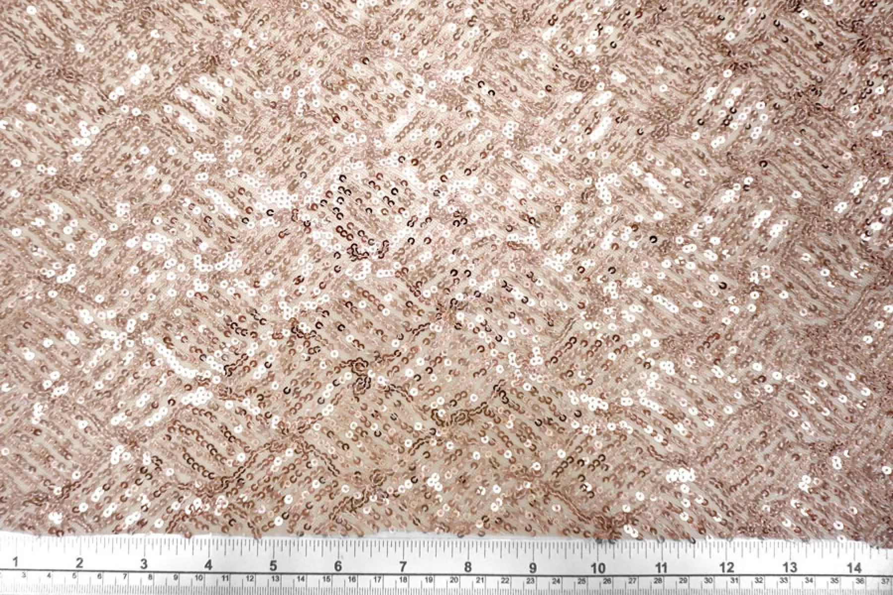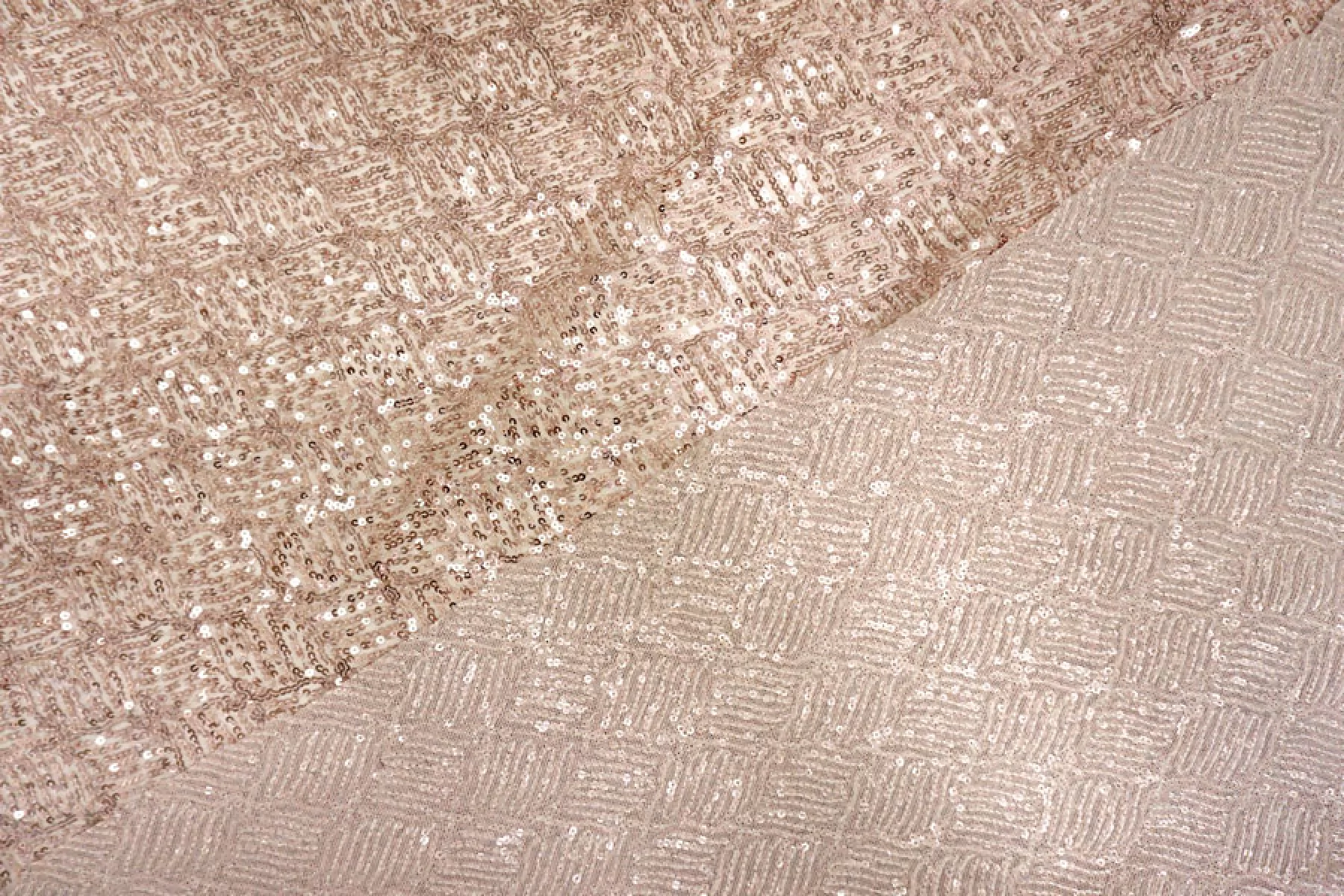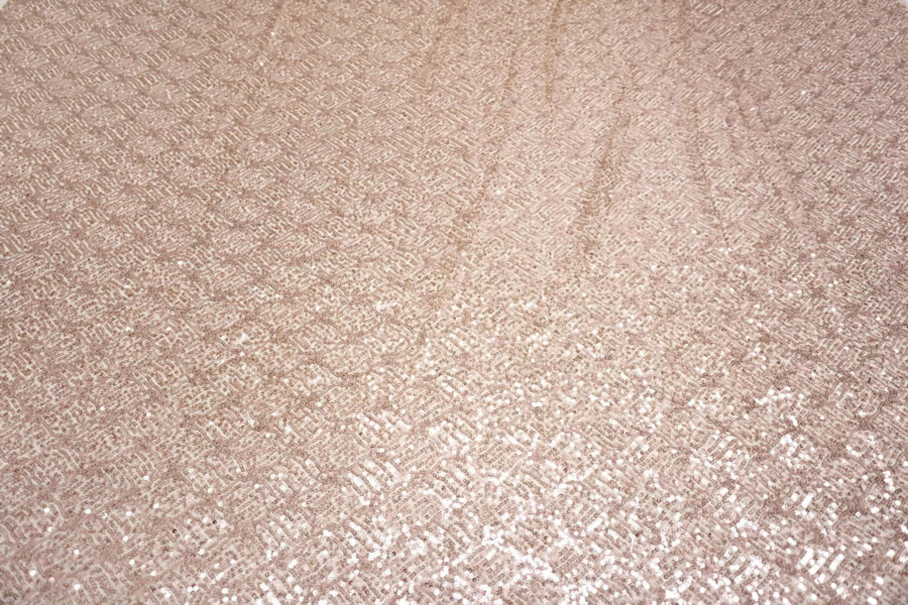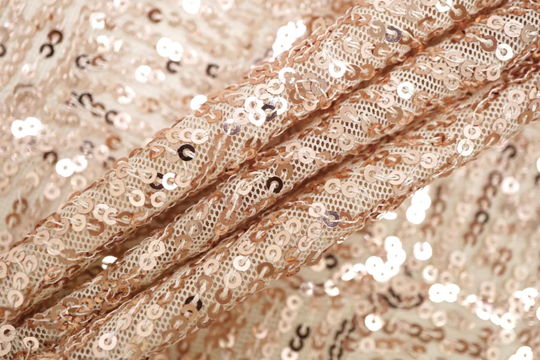 Нарядная сетка с пайетками, нашитыми нитью в тон основе. В основе мягкая мелкая сетка в светло-бежевом оттенке, пайетки цвета розового золота. Просвечивает. Обладает приятным выраженным блеском. Тактильно жестковатая за счет пайеток, но пластичная. Тянется во все стороны. Прекрасно подойдет для пошива нарядного платья, юбки или костюма. При необходимости используйте подкладочный материал.