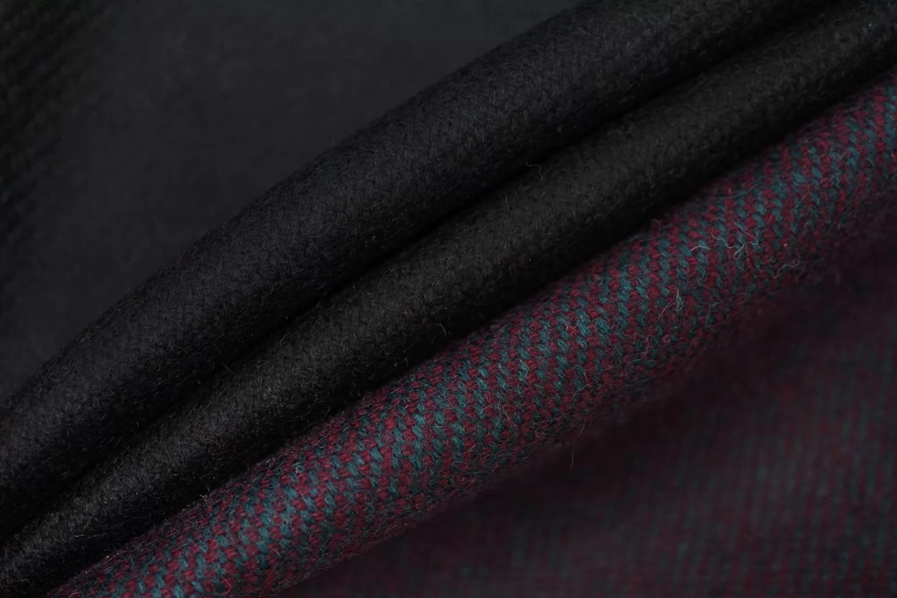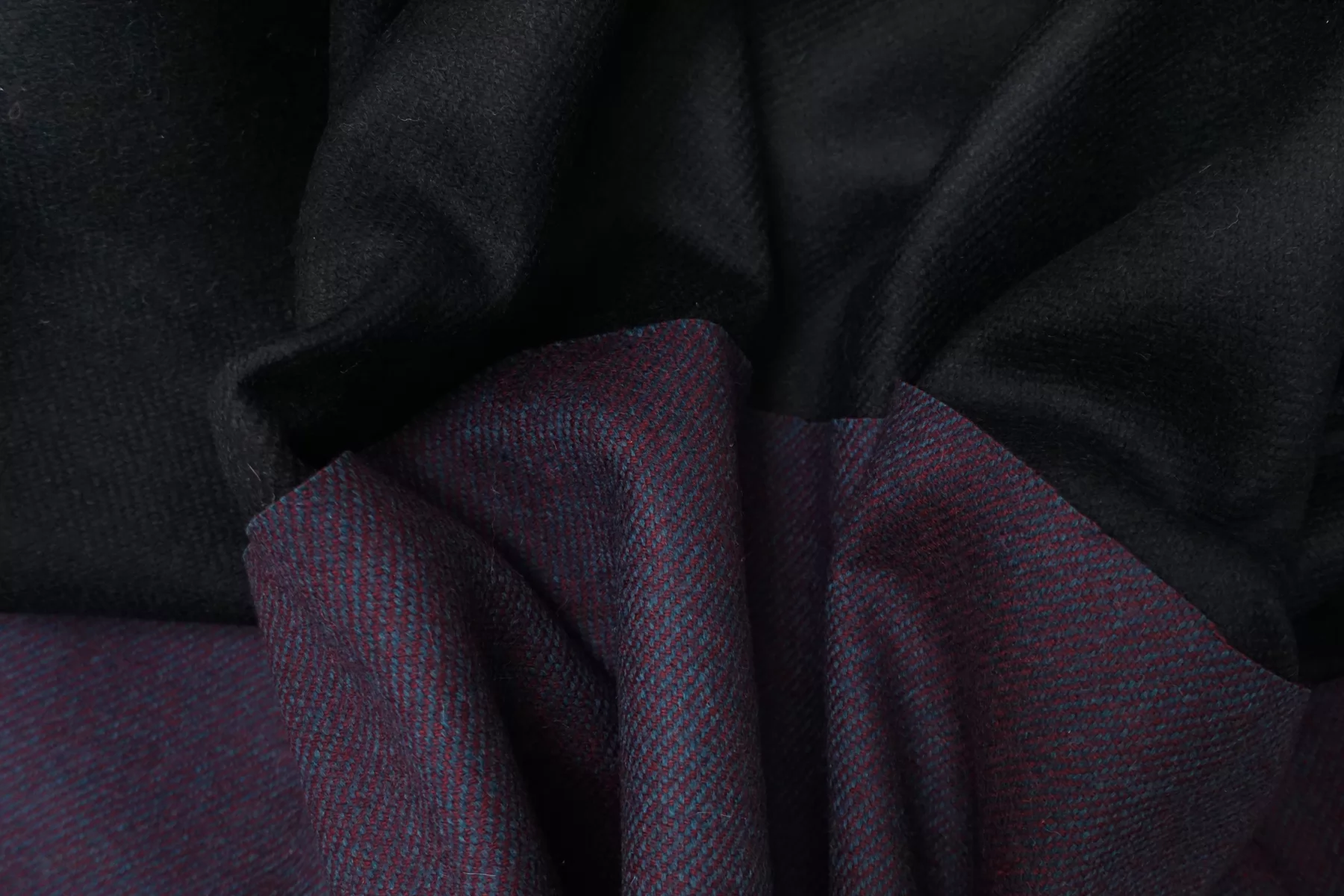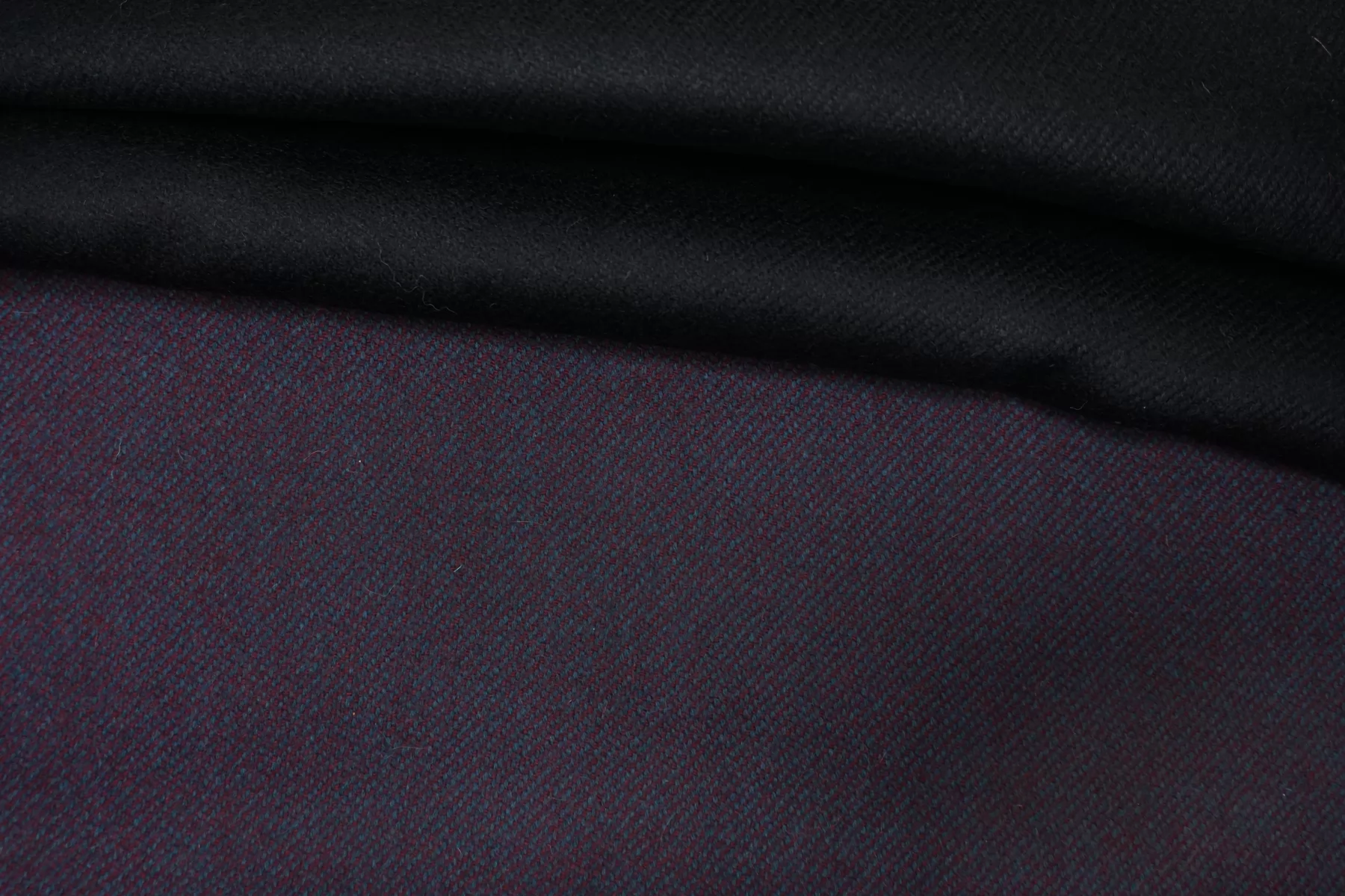 Шикарная пальтовая двуслойная шерсть, с одной стороны это диагональ из нитей цвета тёмной морской волны (сине-бирюзовые), и тёмно-винного цвета, другая сторона однотонная, иссиня-чёрная. Слегка сухая тактильно. Состоит из двух слоев, которые между собой сшиты и легко разделяются. Отлично держит форму. Не тянется, не просвечивает. Плотненький, толстенький, толщиной примерно 2,5 мм. Отличный вариант для пошива пальто. Уход деликатный.