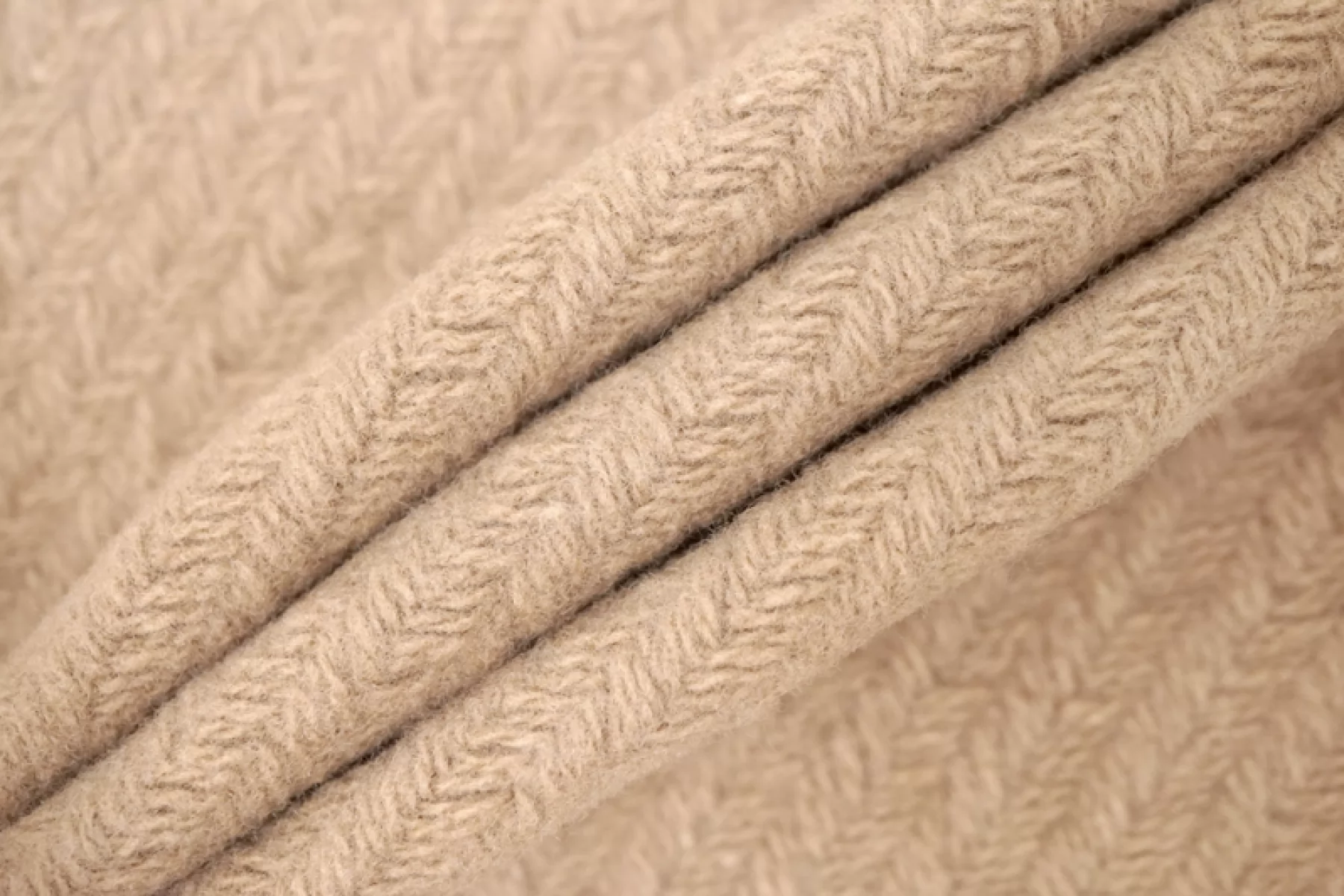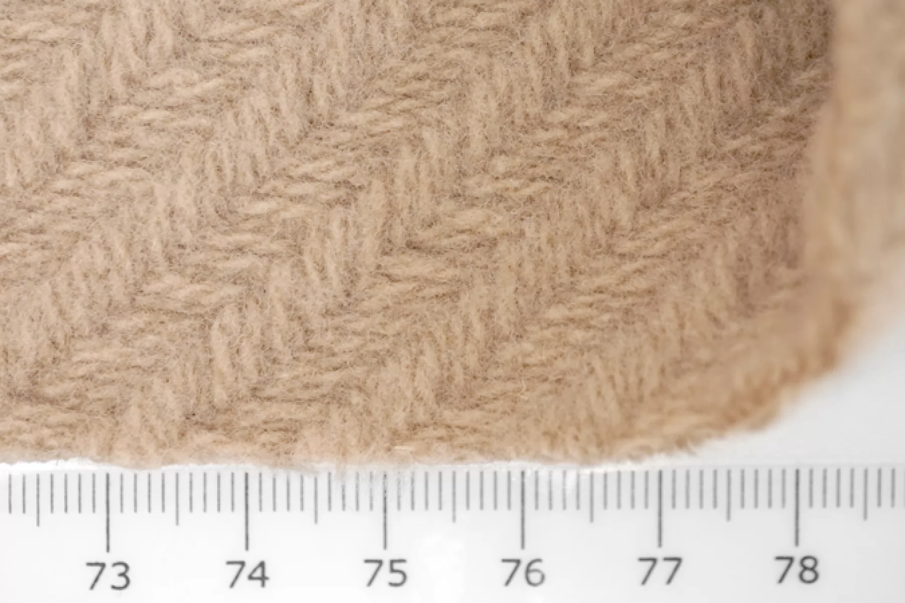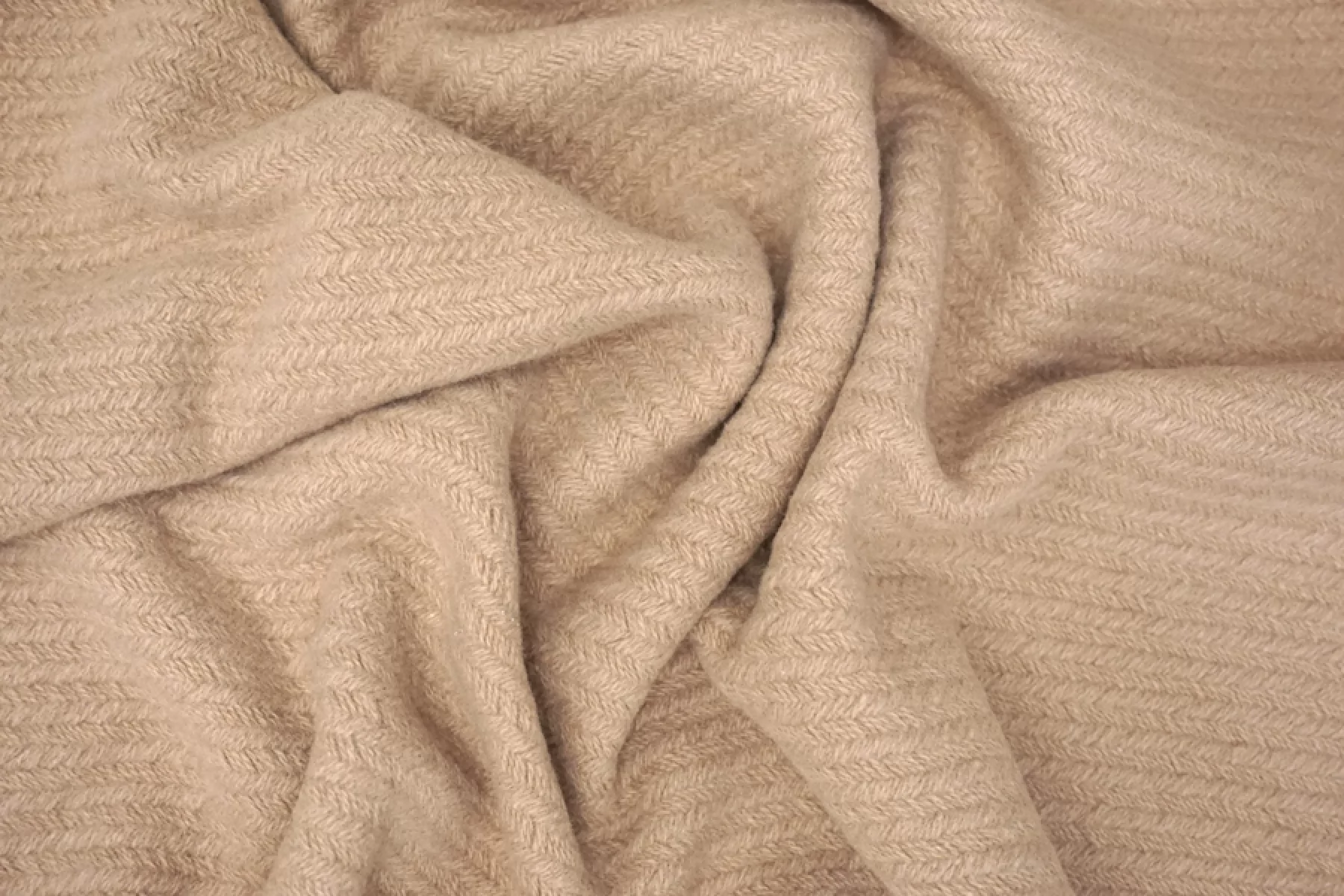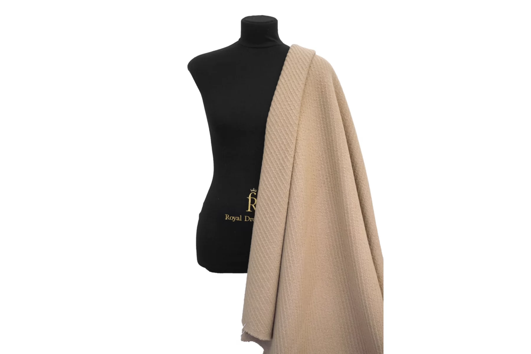 Очень классная пальтовая шерсть бежевого оттенка с фактурной, достаточно крупненькой, выработкой диагоналей. Тактильно очень приятная и мягкая. Слегка суховата, но приятна к телу. Плотненькая, около 4 мм толщиной. Не тянется. Слегка сминается, но восстанавливается. Не просвечивает. Неплохо держит форму и красива в своей пластике. Прекрасный вариант для пошива пальто любого кроя - от классического до пальто-рубашки.