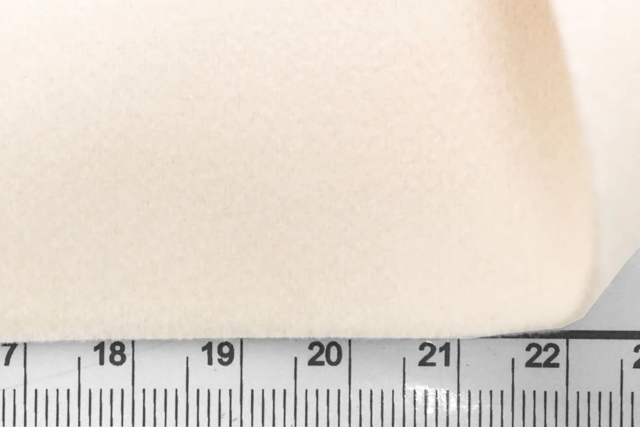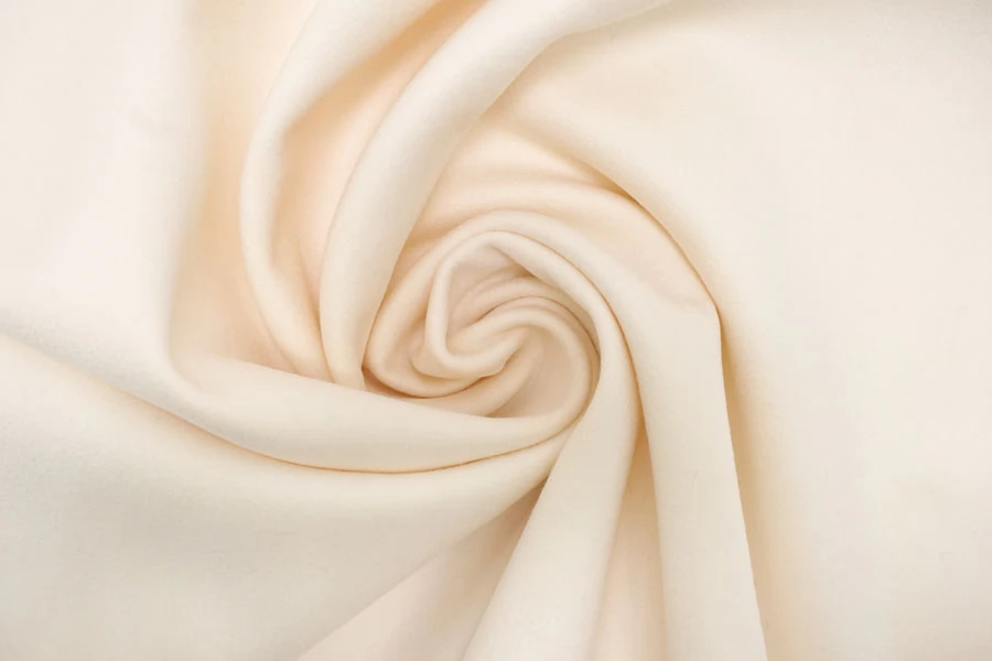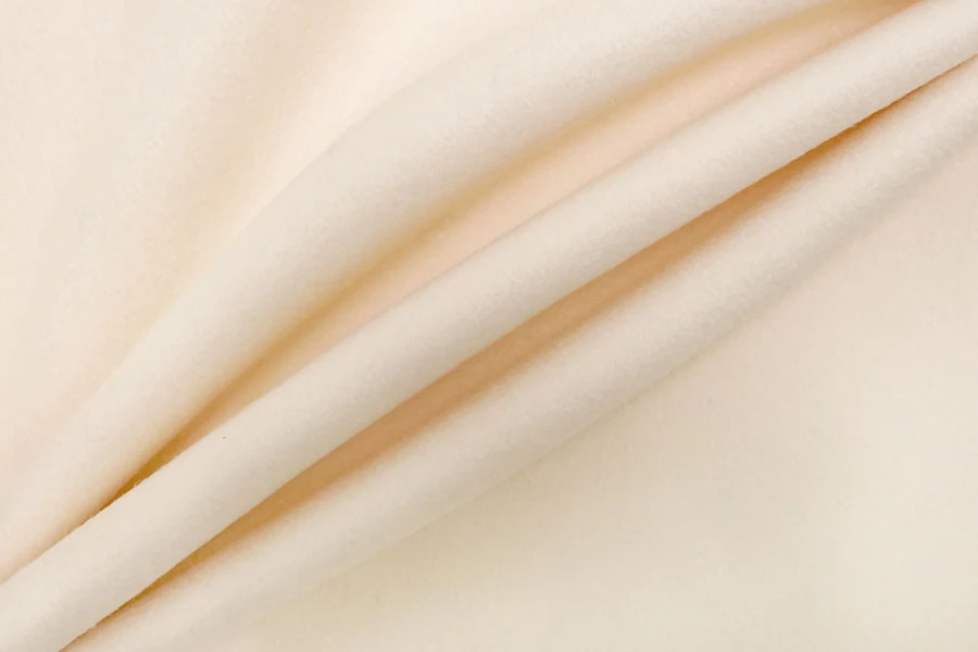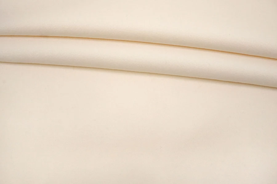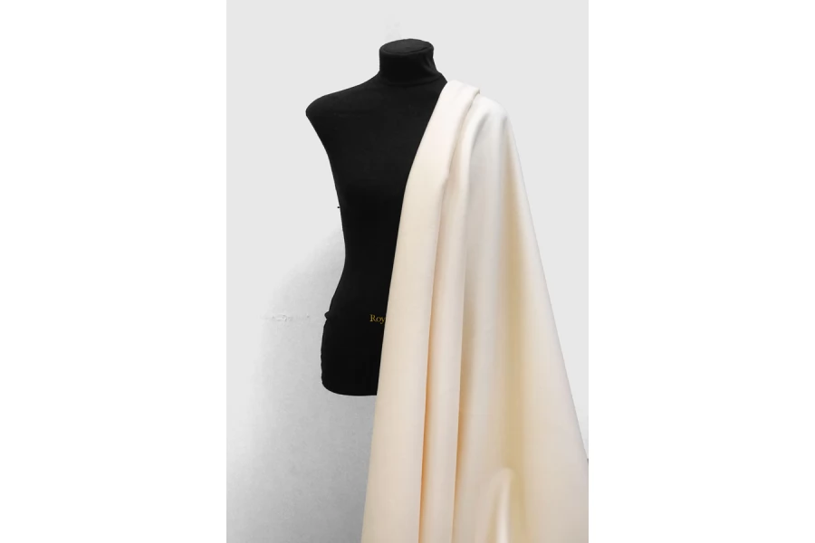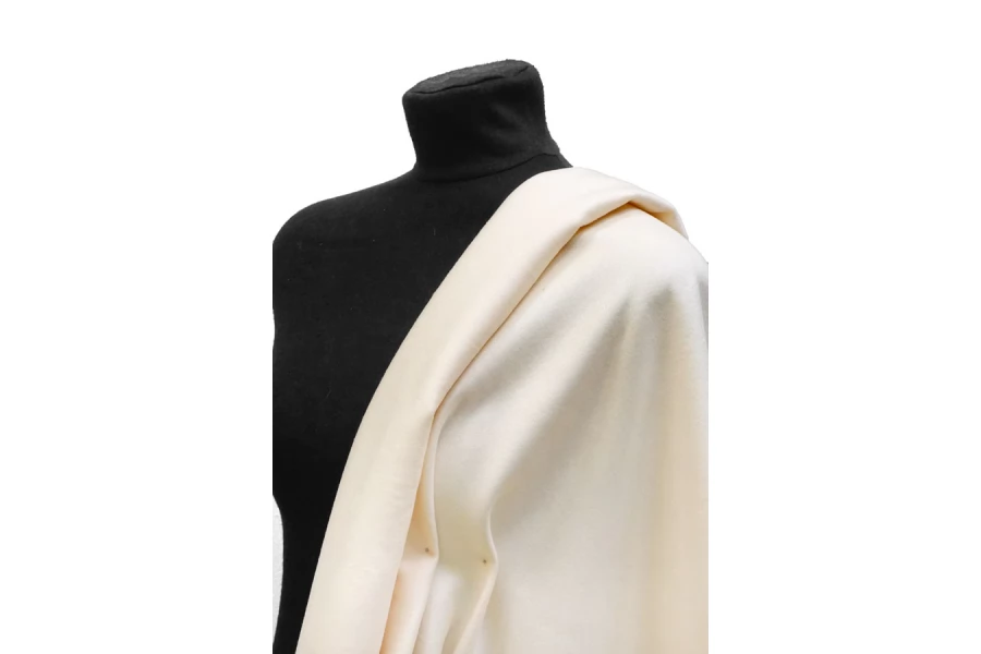 Шикарная двусторонняя дабл шерсть качества virgin пальтовой плотности с добавлением кашемира в нежном оттенке пломбир. Слои сшиты между собой, разделяются. Ворс не ярко выраженный, прижатый, есть направление. Очень мягкий, нежный и приятный наощупь. Не колется. Тонкий, примерно 1,5-2 мм толщиной. Форму держит, не мнется. Не тянется. Работать можно на обе стороны. Шьем теплые жакеты и демисезонные пальто. Уход - деликатный.