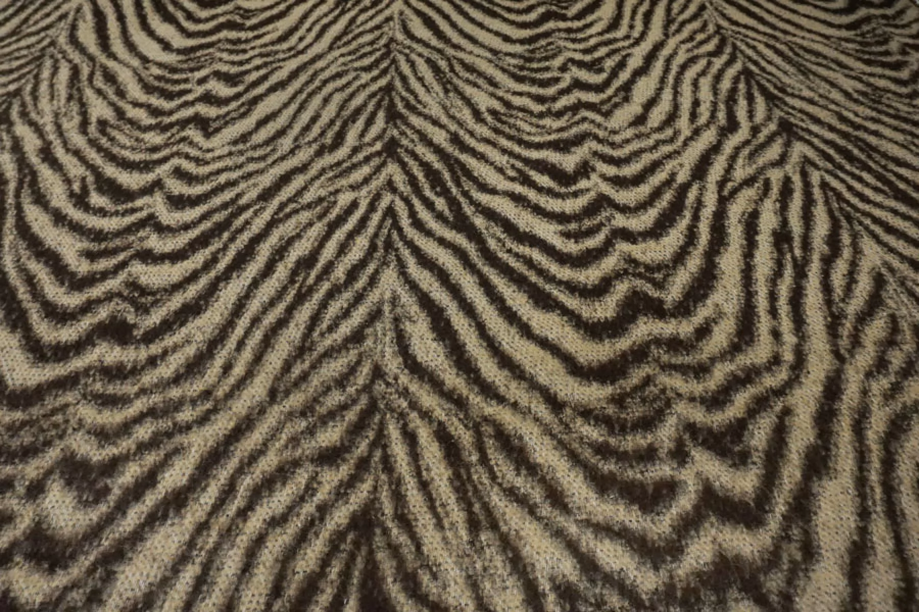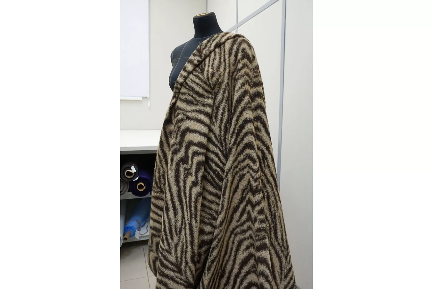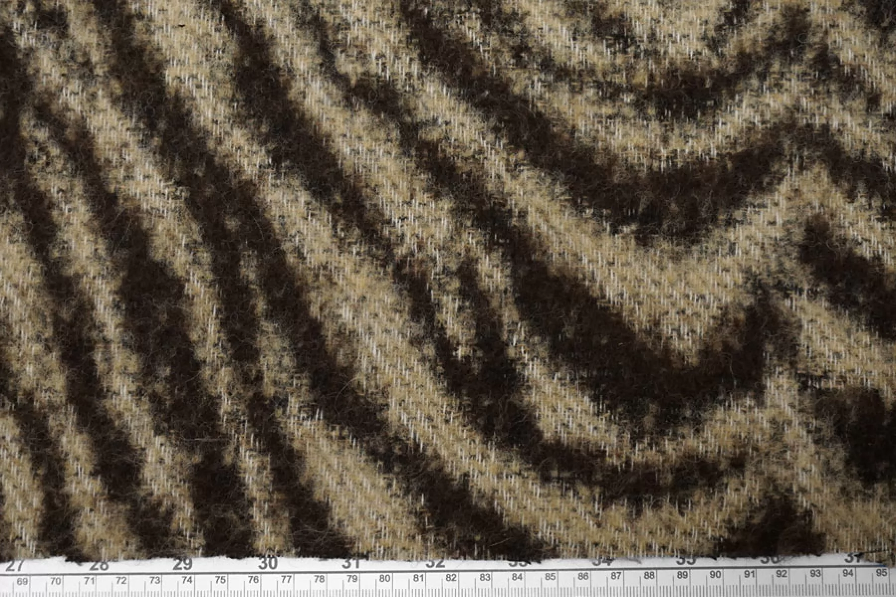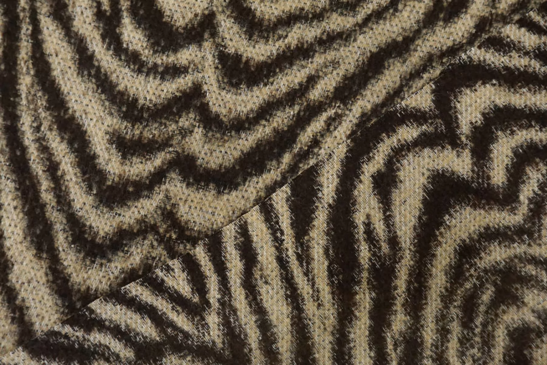 Интересная пальтовая шерсть в коричнево-бежевых оттенках с крупным волнообразным принтом. Ворсистая, но без направления. Материал мягкий и приятный, суховатый и немного колется. Толщина примерно 1 мм. Не тянется. Форму держит. Не мнется. Отличный вариант для пошива пальто. Уход деликатный.
