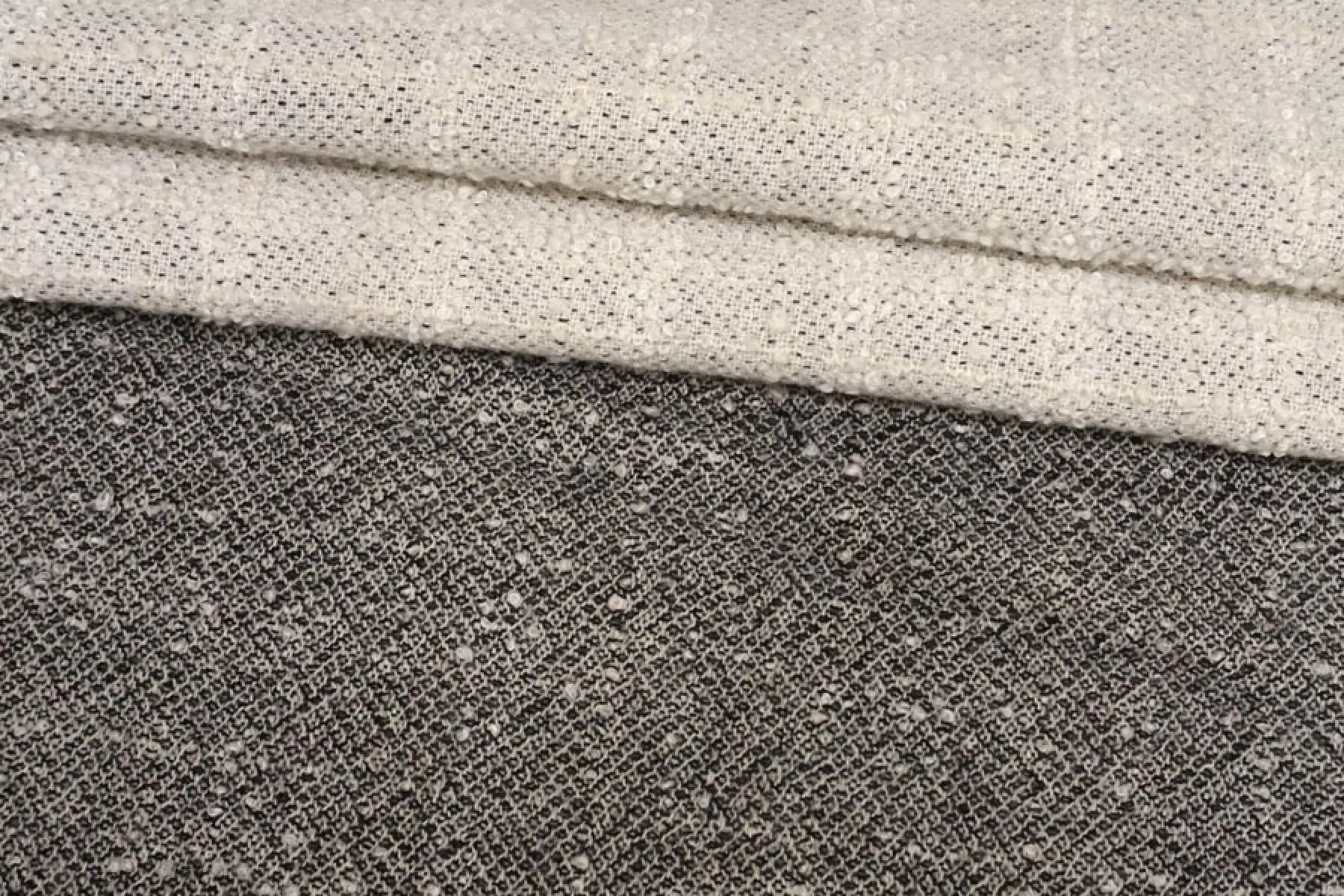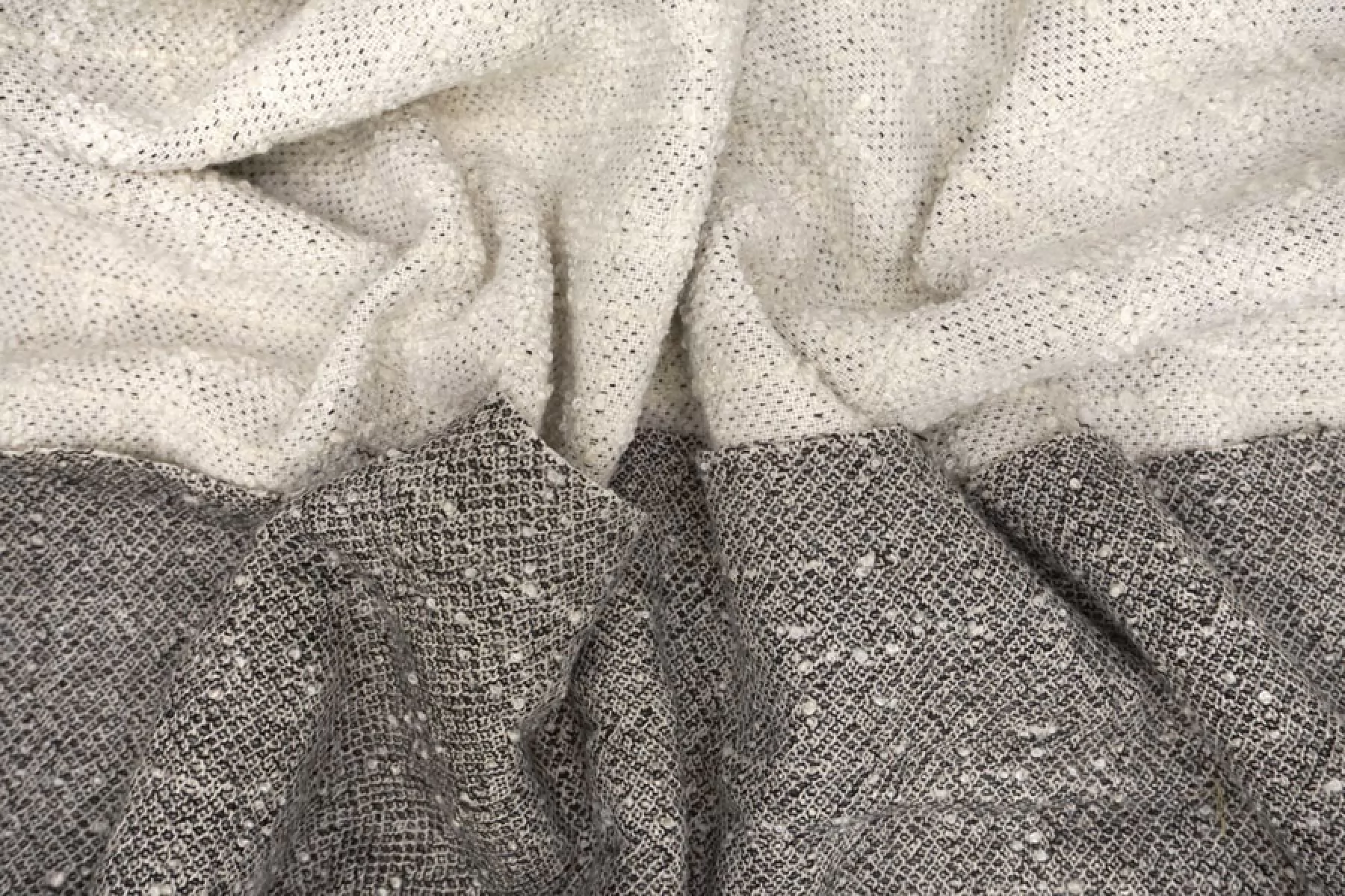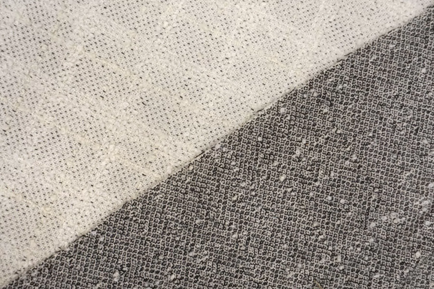 Классная костюмно-пальтовая двусторонняя шерсть с мохером. Слои разделяются, но при разделении деформируются. Одна сторона молочная в фактурную клетку среднего размера едва заметную. Другая сторона черно-молочная. Материал суховатый, не тянется. Немного колется. Неплохо держит форму. Не просвечивает.
