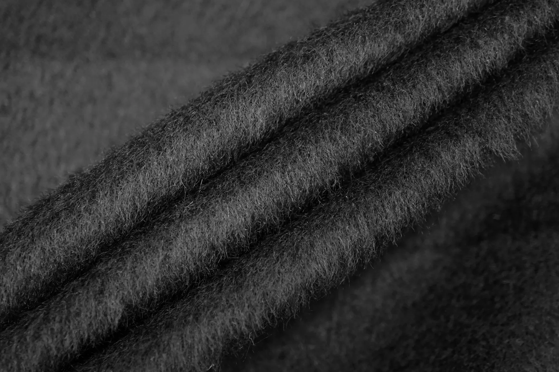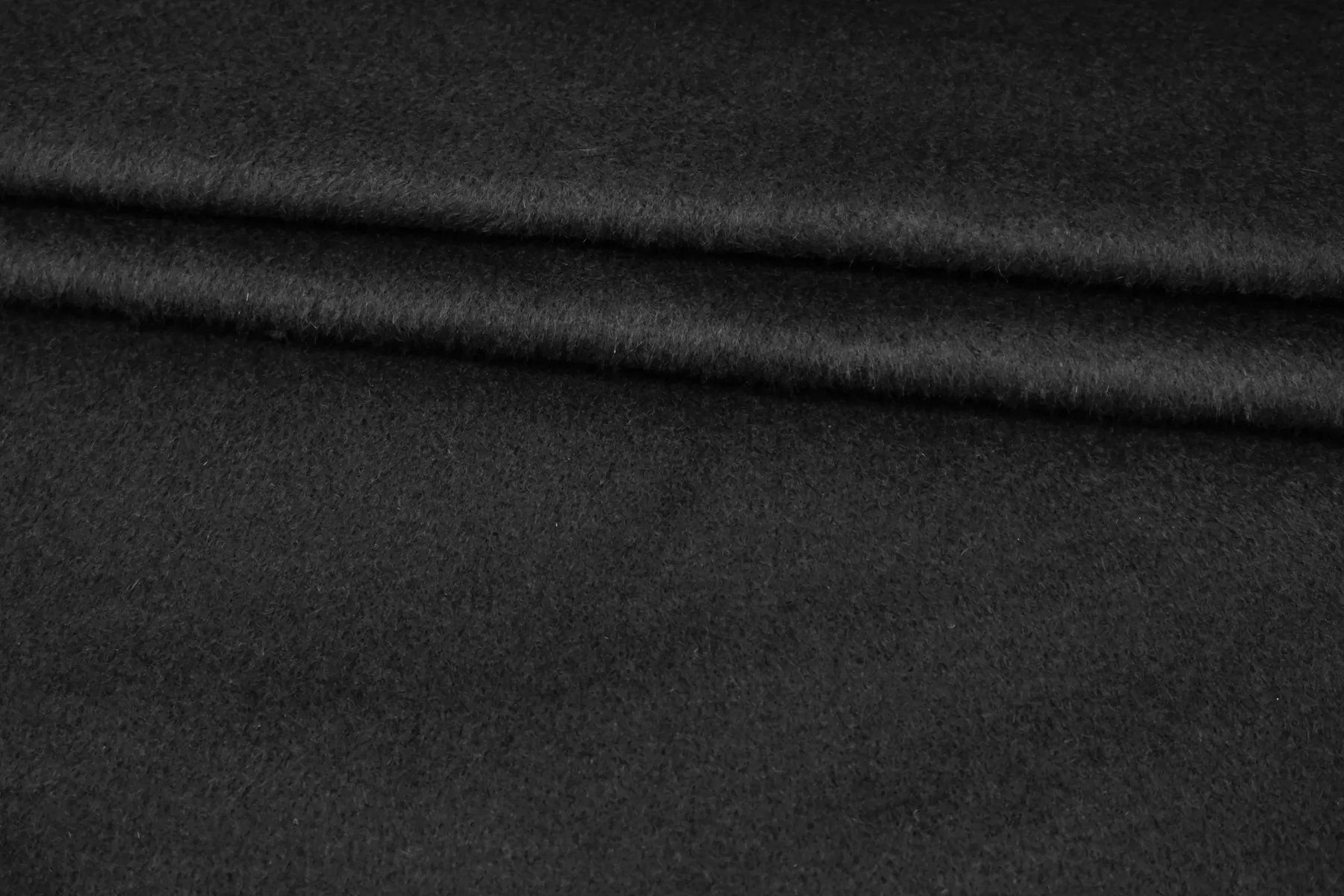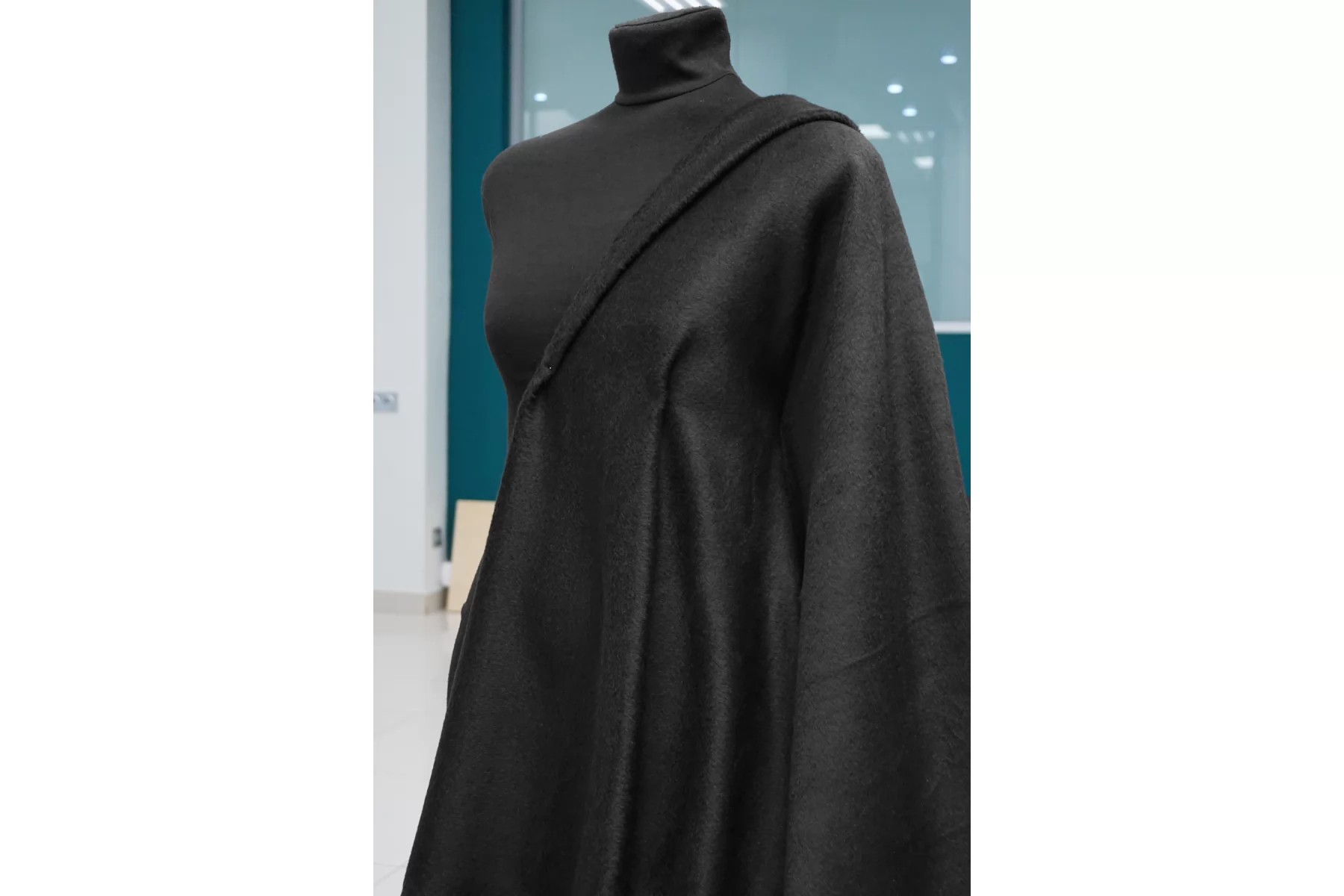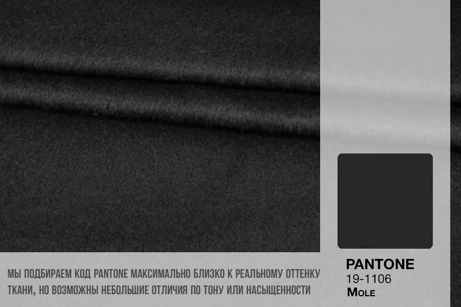 Пальтовая шерсть с альпакой и кашемиром шикарного качества, в тёмном, дымчато-графитовом оттенке. При определенном освещении кажется, что есть лёгкий коричневый подтон. Материал с направленным ворсом - длина около 3 мм. Красиво выглядит в сгибах и складках, с мягким лоском. Не колется. Не тянется. Хорошей плотности, толщина около 1,5 мм. Подойдет как на классические модели пальто, пальто-халата, двубортного пальто, так и для современной вариации пальто-рубашки. Подойдет и на мужское пальто. Уход за материалом деликатный. Рекомендуется химчистка.