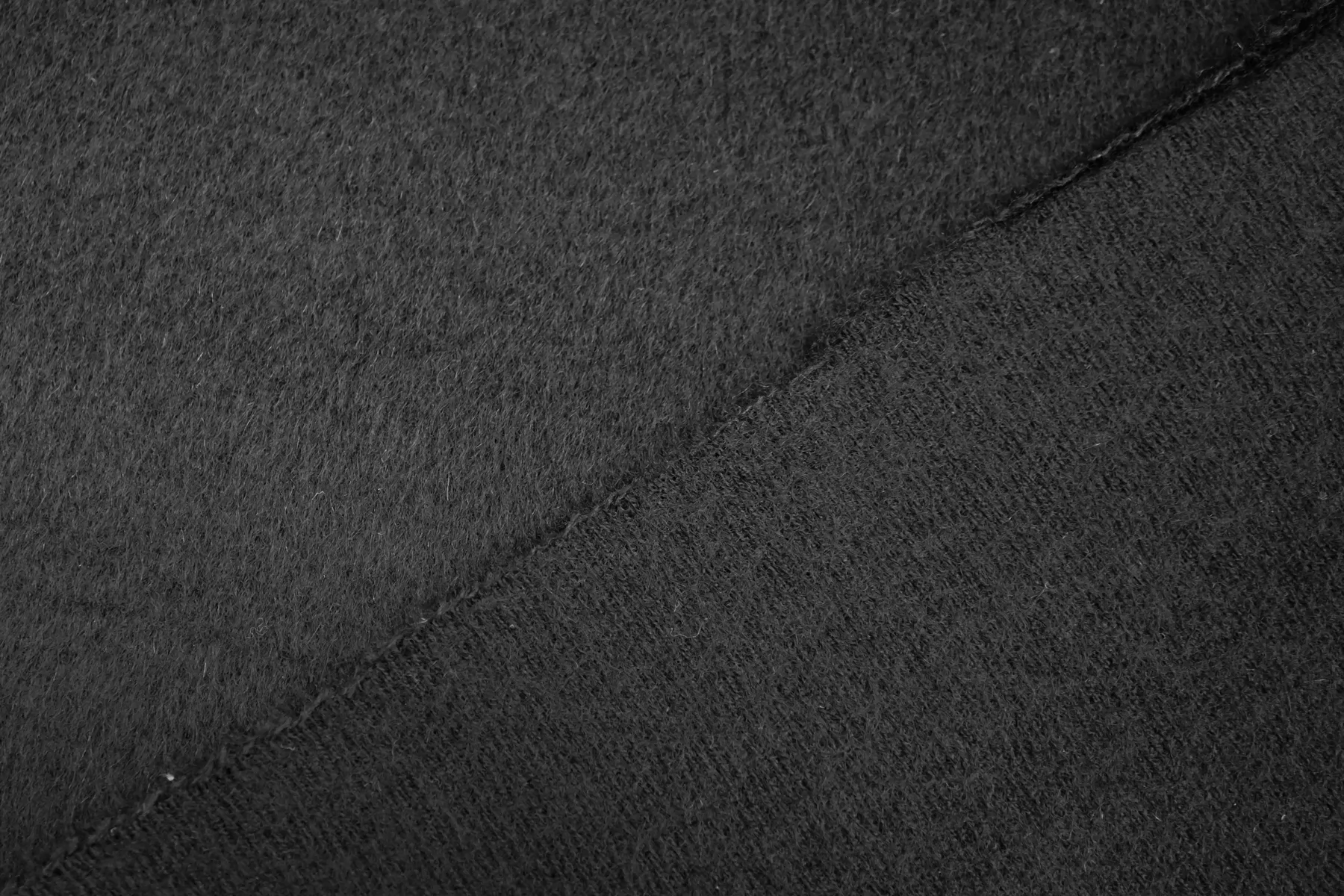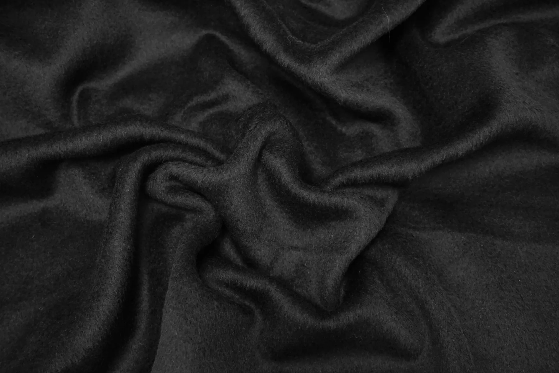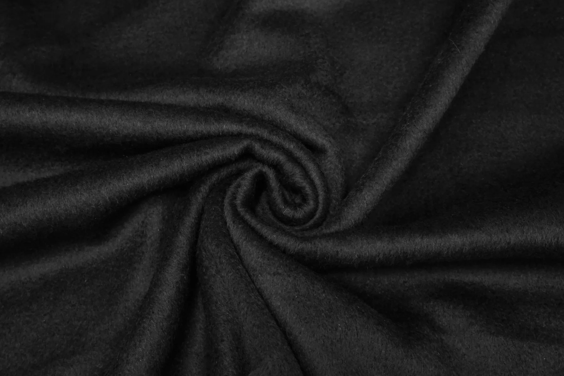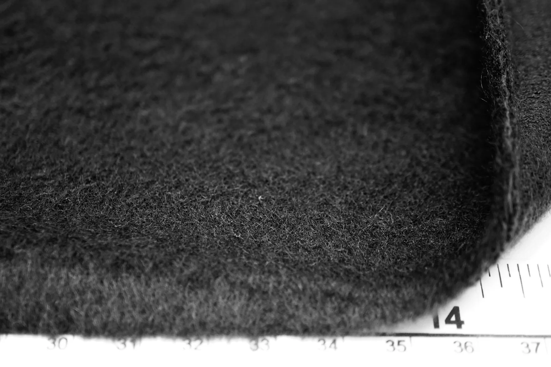 Пальтовая шерсть с альпакой и кашемиром шикарного качества, в тёмном, дымчато-графитовом оттенке. При определенном освещении кажется, что есть лёгкий коричневый подтон. Материал с направленным ворсом - длина около 3 мм. Красиво выглядит в сгибах и складках, с мягким лоском. Не колется. Не тянется. Хорошей плотности, толщина около 1,5 мм. Подойдет как на классические модели пальто, пальто-халата, двубортного пальто, так и для современной вариации пальто-рубашки. Подойдет и на мужское пальто. Уход за материалом деликатный. Рекомендуется химчистка.