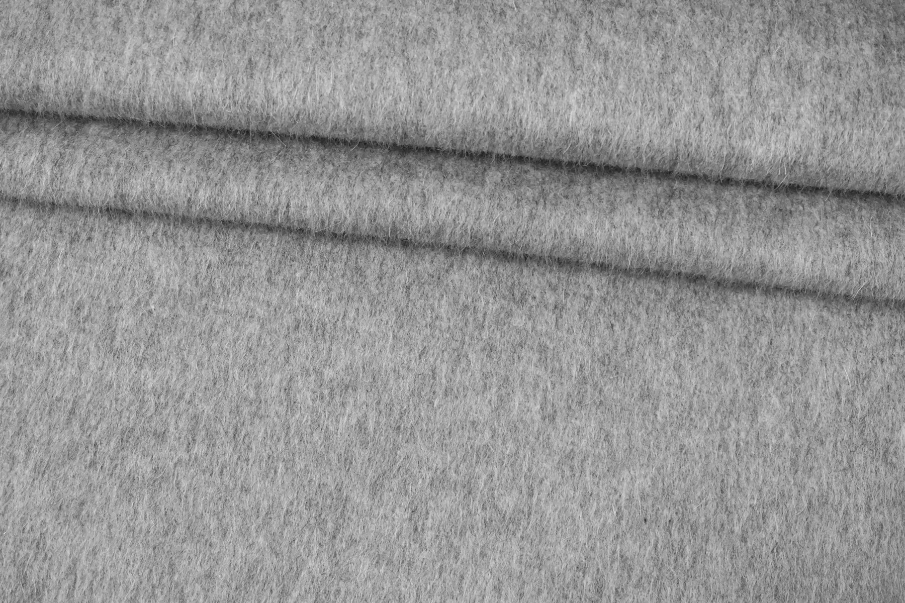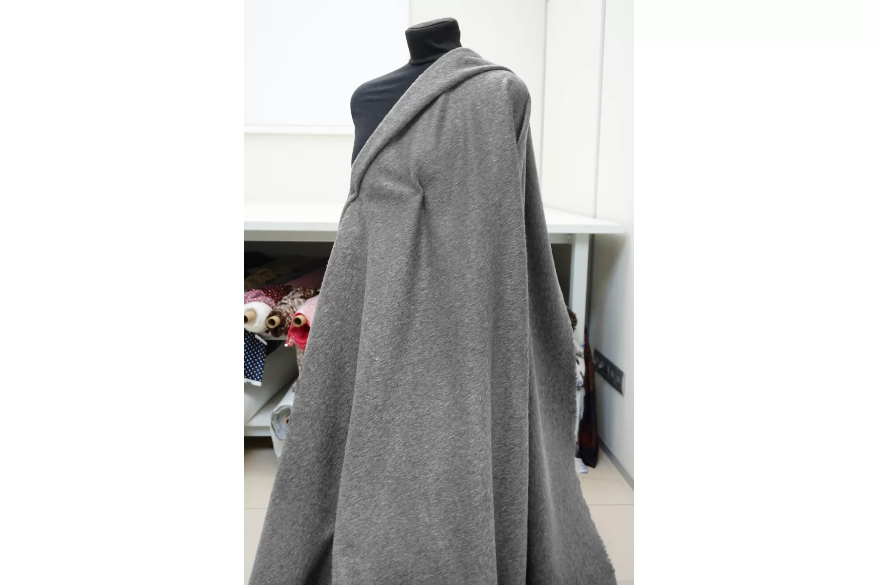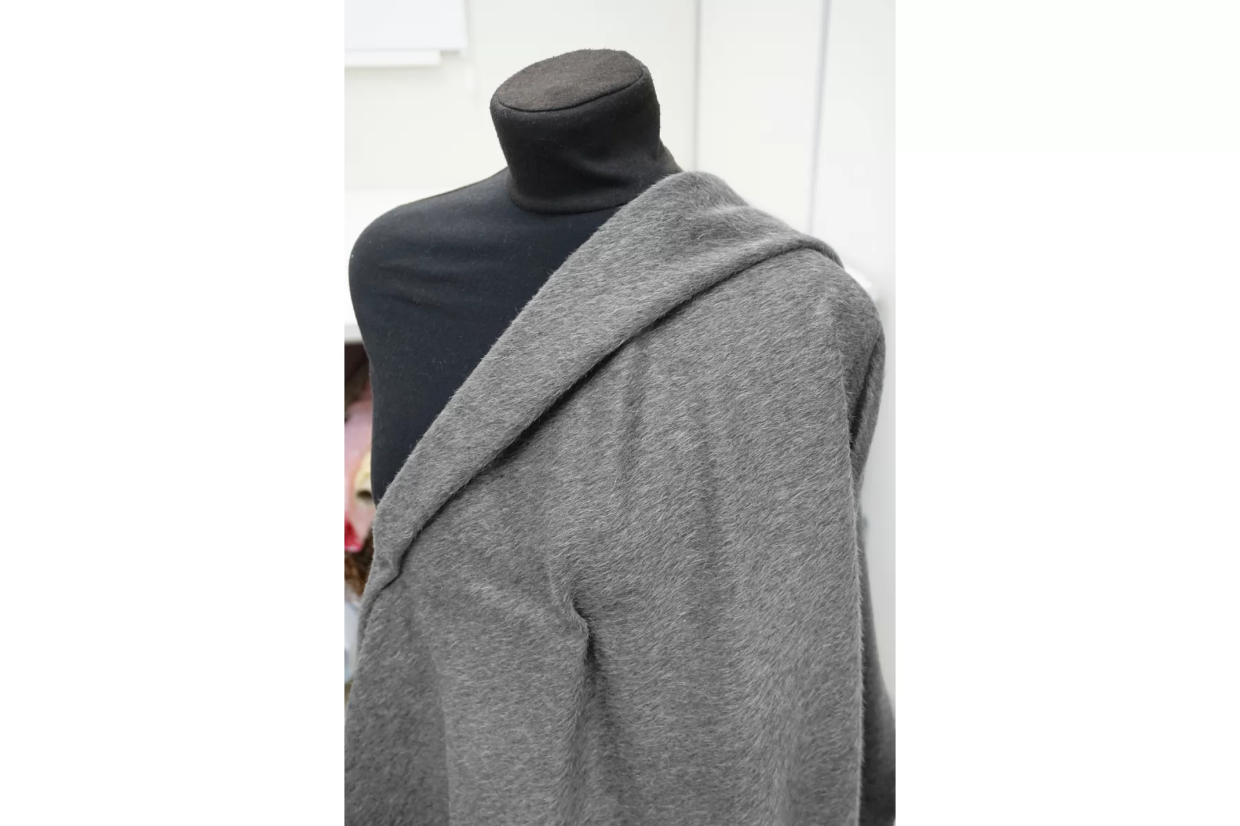 Пальтовая шерсть с альпакой в сером цвете. Материал с направленным ворсом - длина около 6 мм. Немножко покалывает. Не просвечивает. Держит форму и умеренной пластичности. Не тянется. Толщина около 1,5 мм. Подойдет как на классические модели пальто-халата, двубортного пальто, так и для современной вариации пальто-рубашки. Уход за материалом деликатный. Рекомендуется химчистка.
