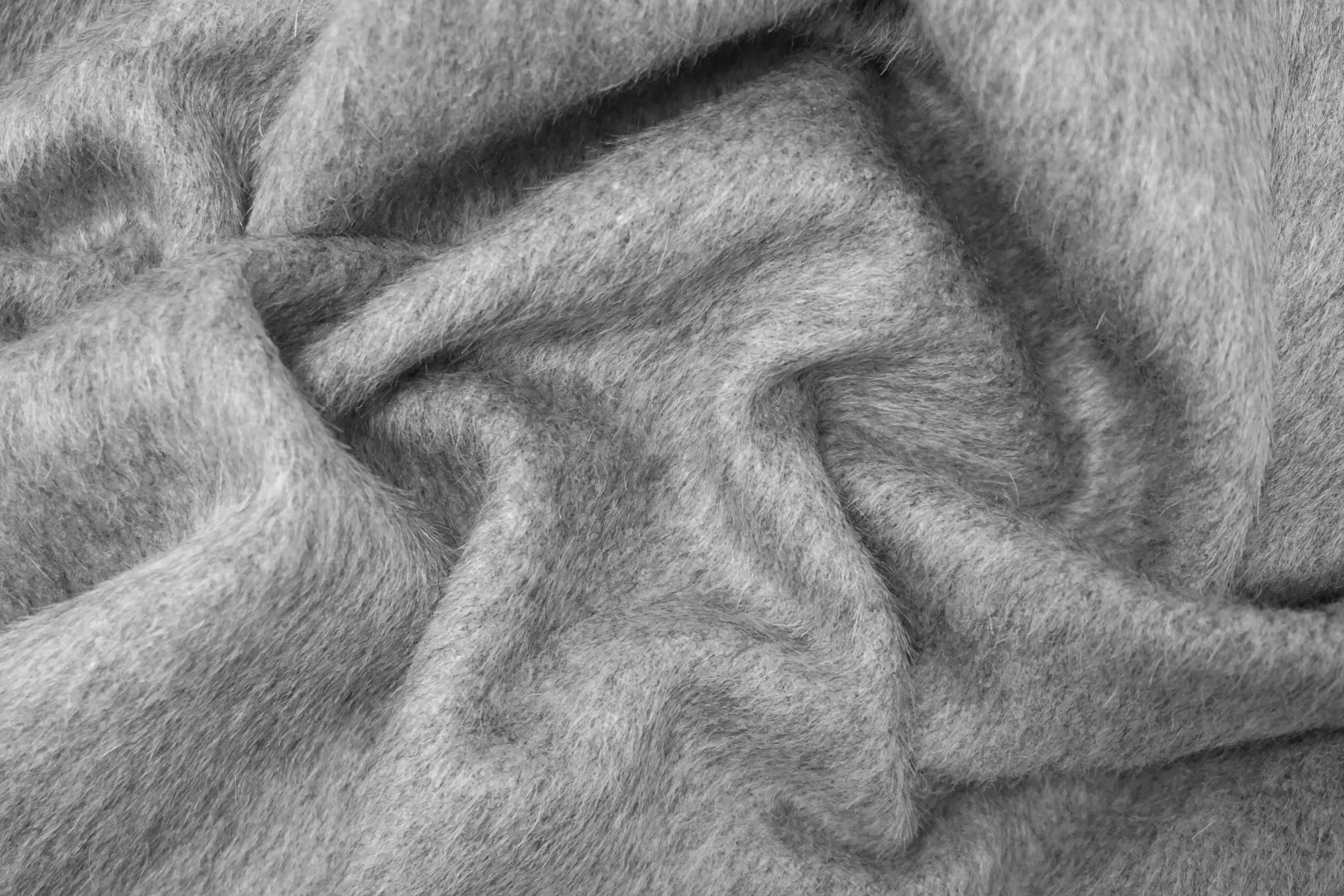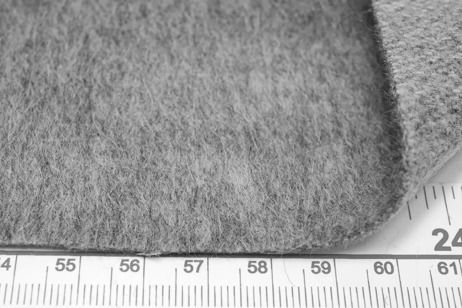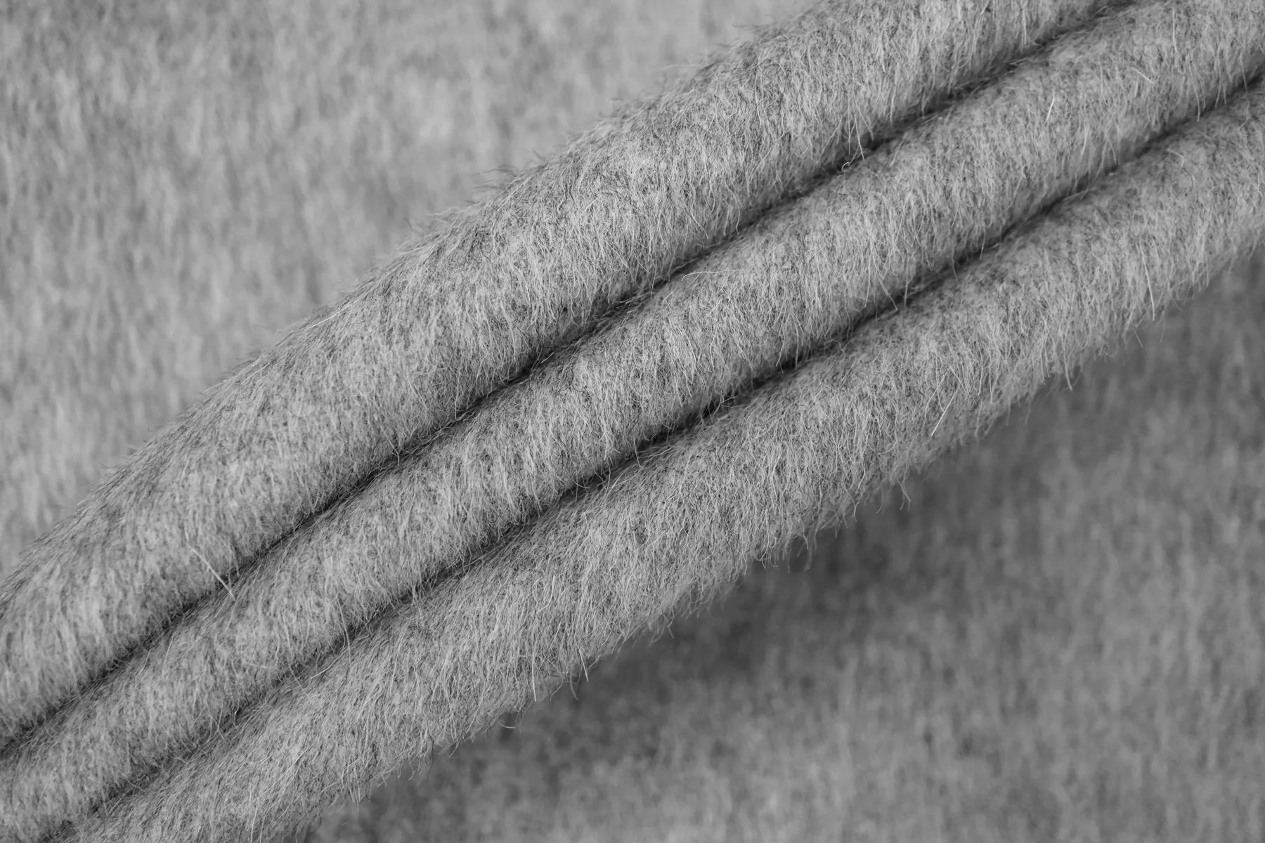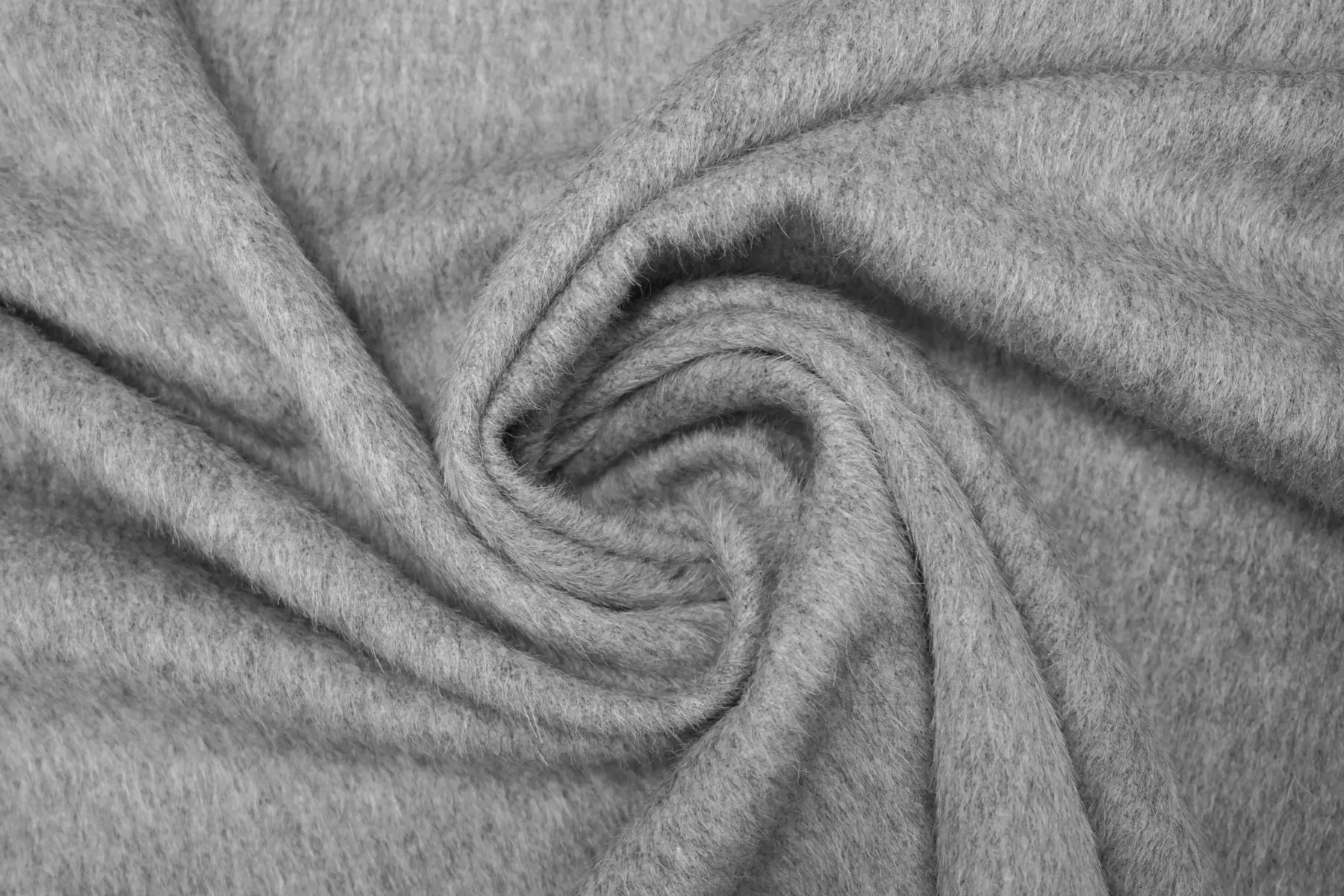 Пальтовая шерсть с альпакой в сером цвете. Материал с направленным ворсом - длина около 6 мм. Немножко покалывает. Не просвечивает. Держит форму и умеренной пластичности. Не тянется. Толщина около 1,5 мм. Подойдет как на классические модели пальто-халата, двубортного пальто, так и для современной вариации пальто-рубашки. Уход за материалом деликатный. Рекомендуется химчистка.