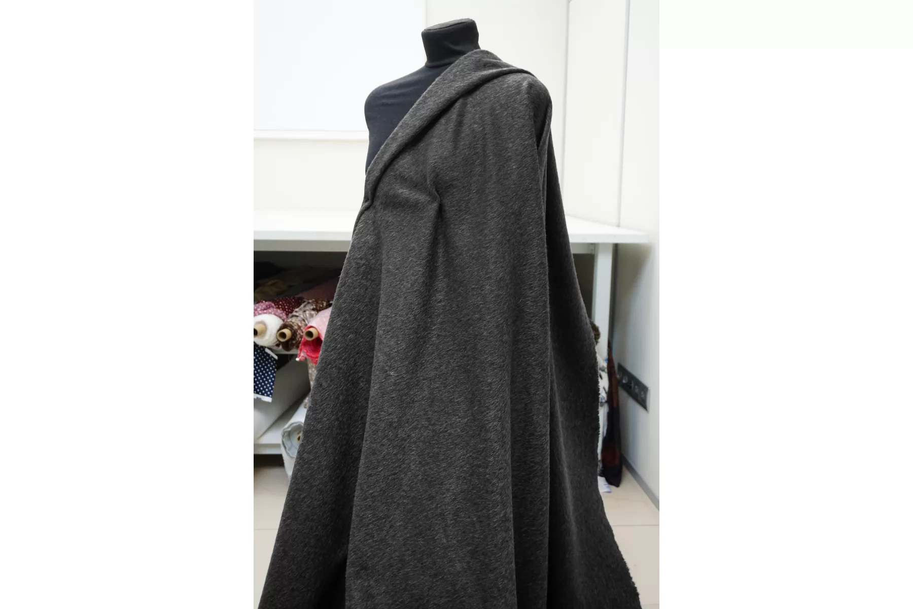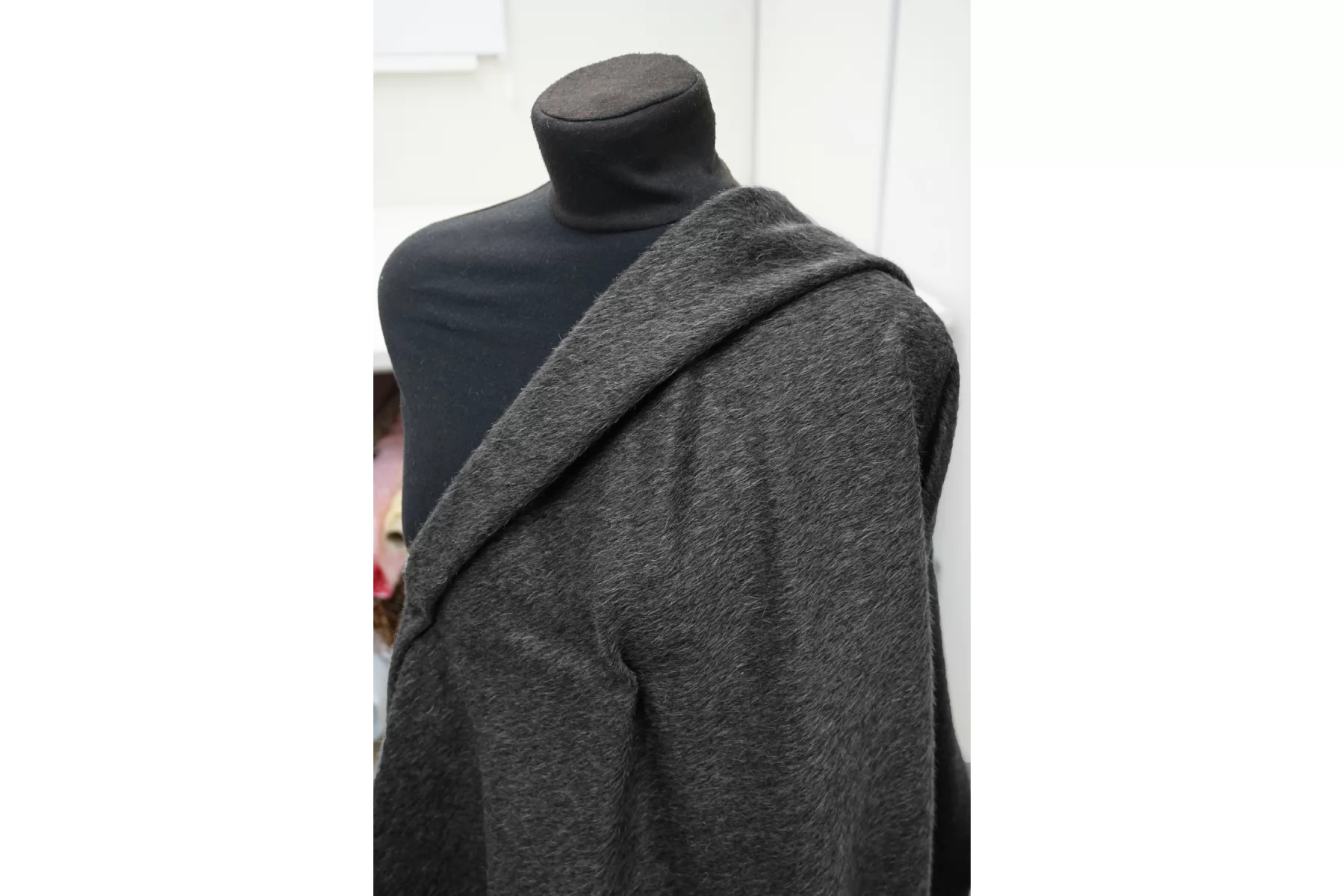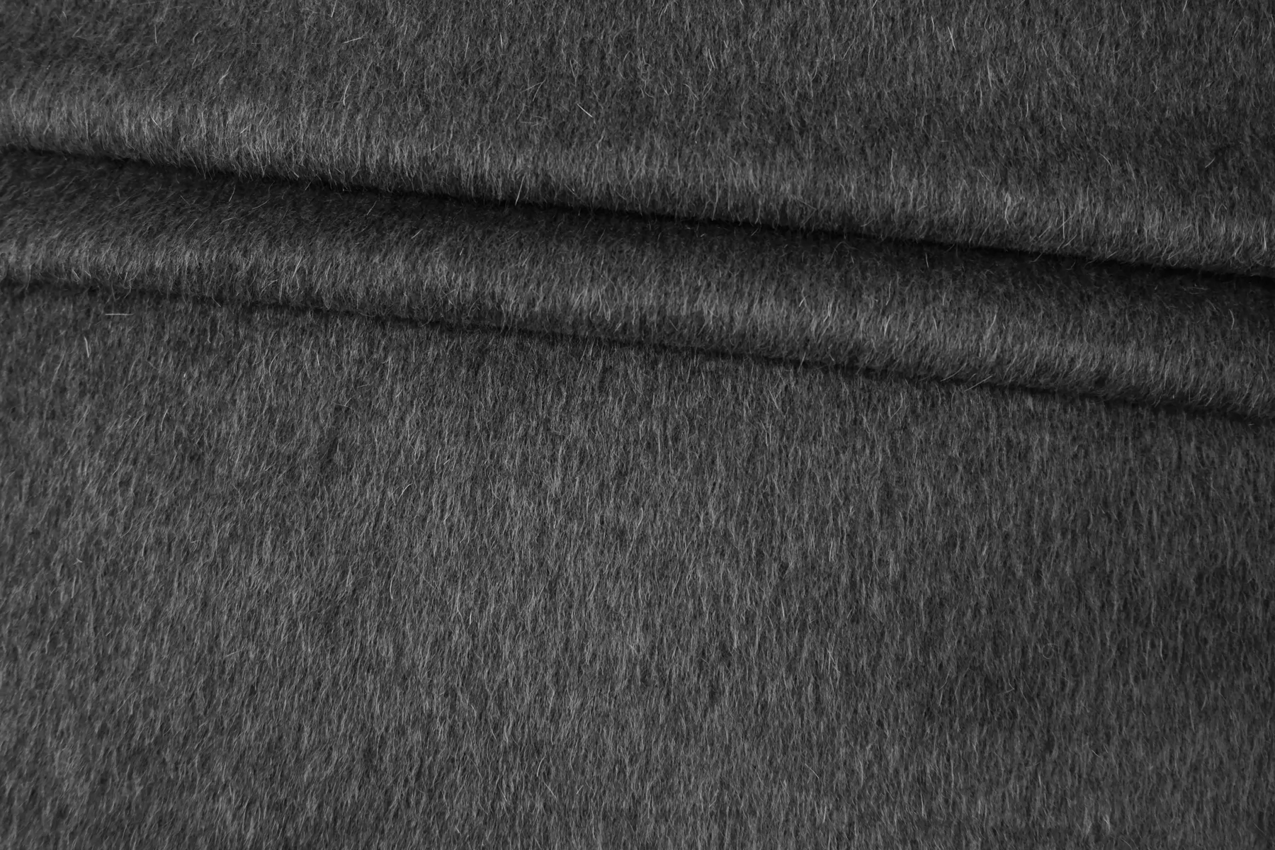 Пальтовая шерсть с альпакой в тёмном сером цвете. Материал с направленным ворсом - длина около 6 мм. Немножко покалывает. Не просвечивает. Держит форму и умеренной пластичности. Не тянется. Толщина около 1,5 мм. Подойдет как на классические модели пальто-халата, двубортного пальто, так и для современной вариации пальто-рубашки. Уход за материалом деликатный. Рекомендуется химчистка.