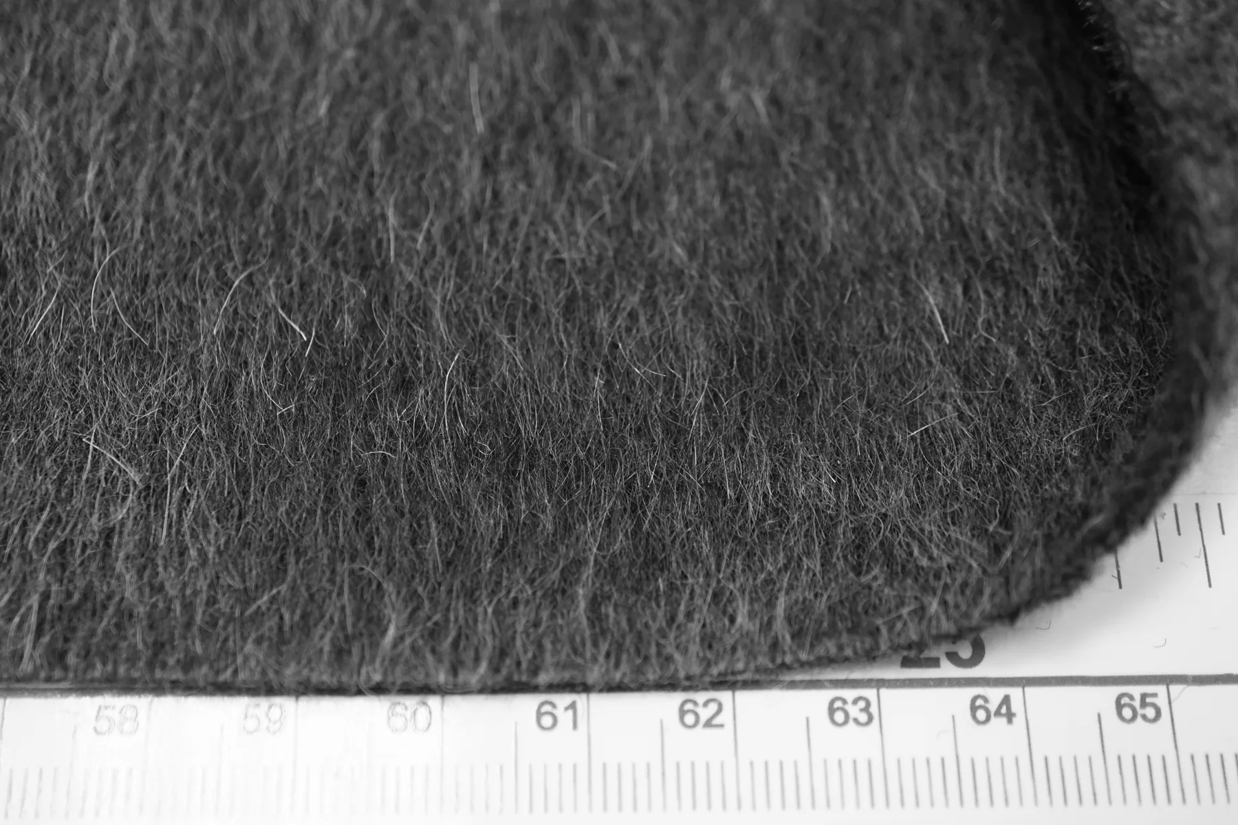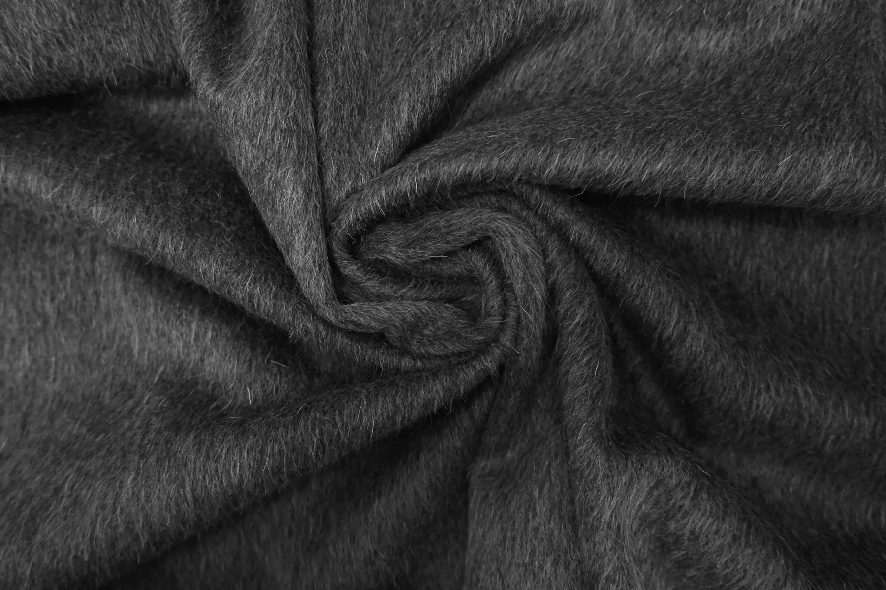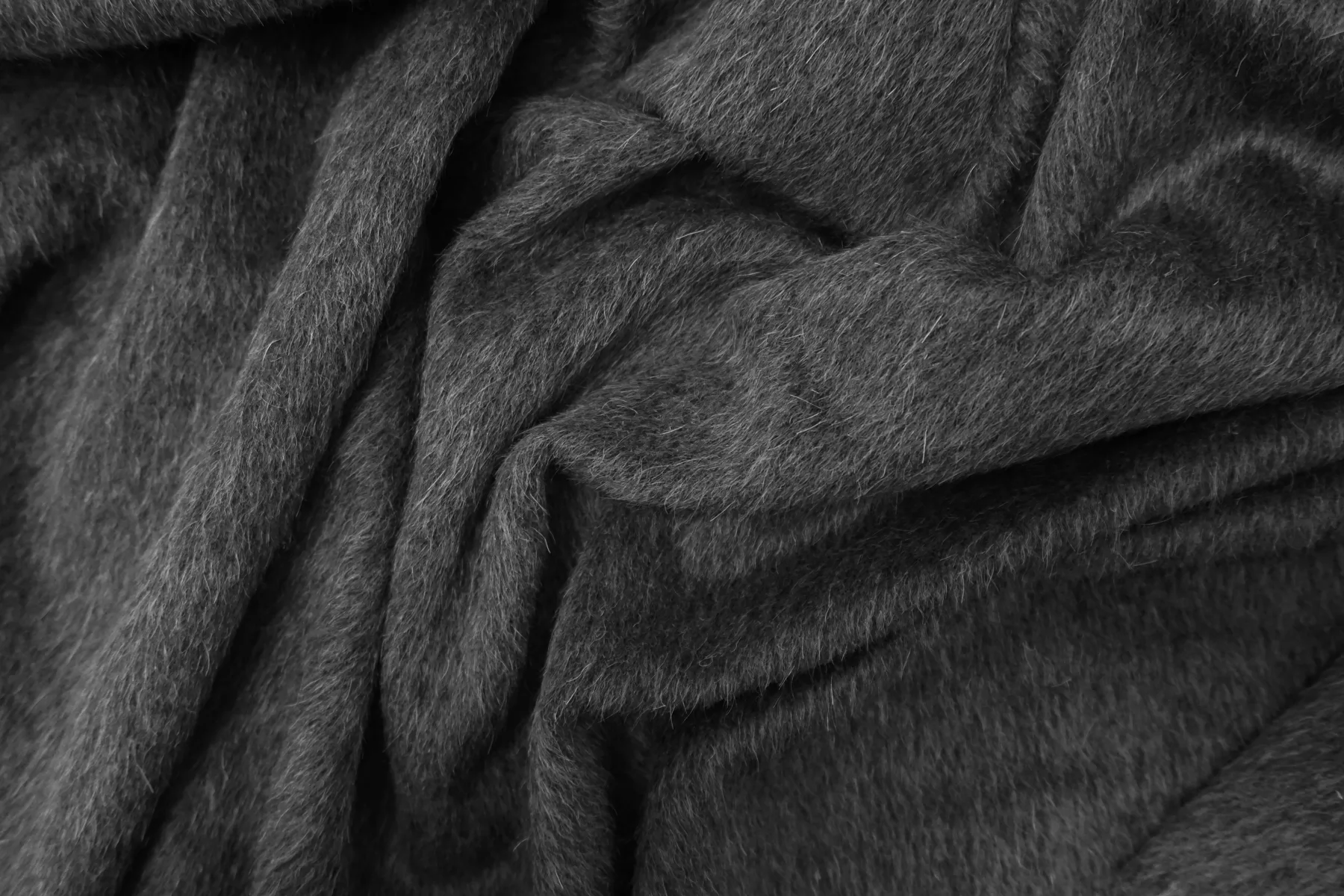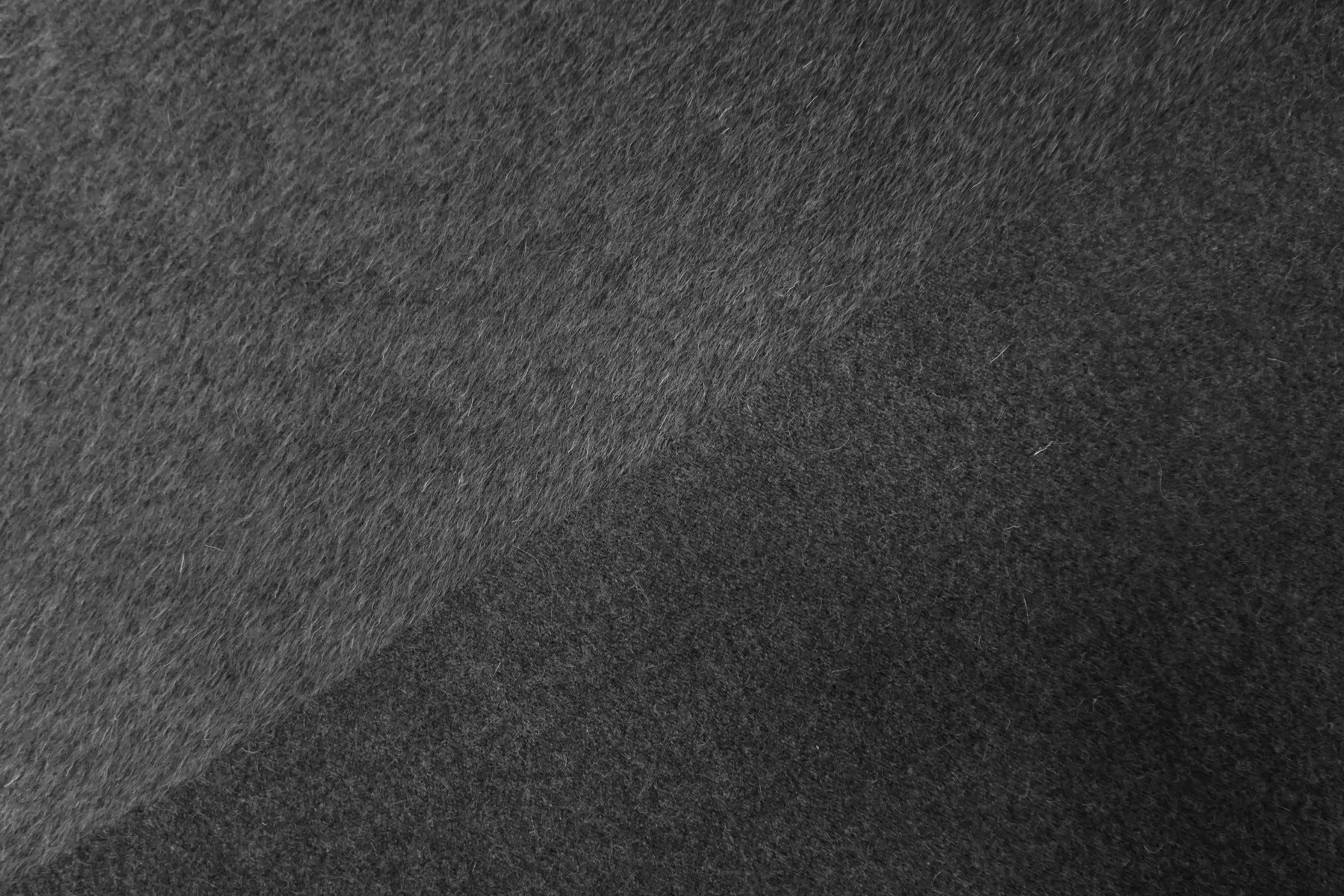 Пальтовая шерсть с альпакой в тёмном сером цвете. Материал с направленным ворсом - длина около 6 мм. Немножко покалывает. Не просвечивает. Держит форму и умеренной пластичности. Не тянется. Толщина около 1,5 мм. Подойдет как на классические модели пальто-халата, двубортного пальто, так и для современной вариации пальто-рубашки. Уход за материалом деликатный. Рекомендуется химчистка.