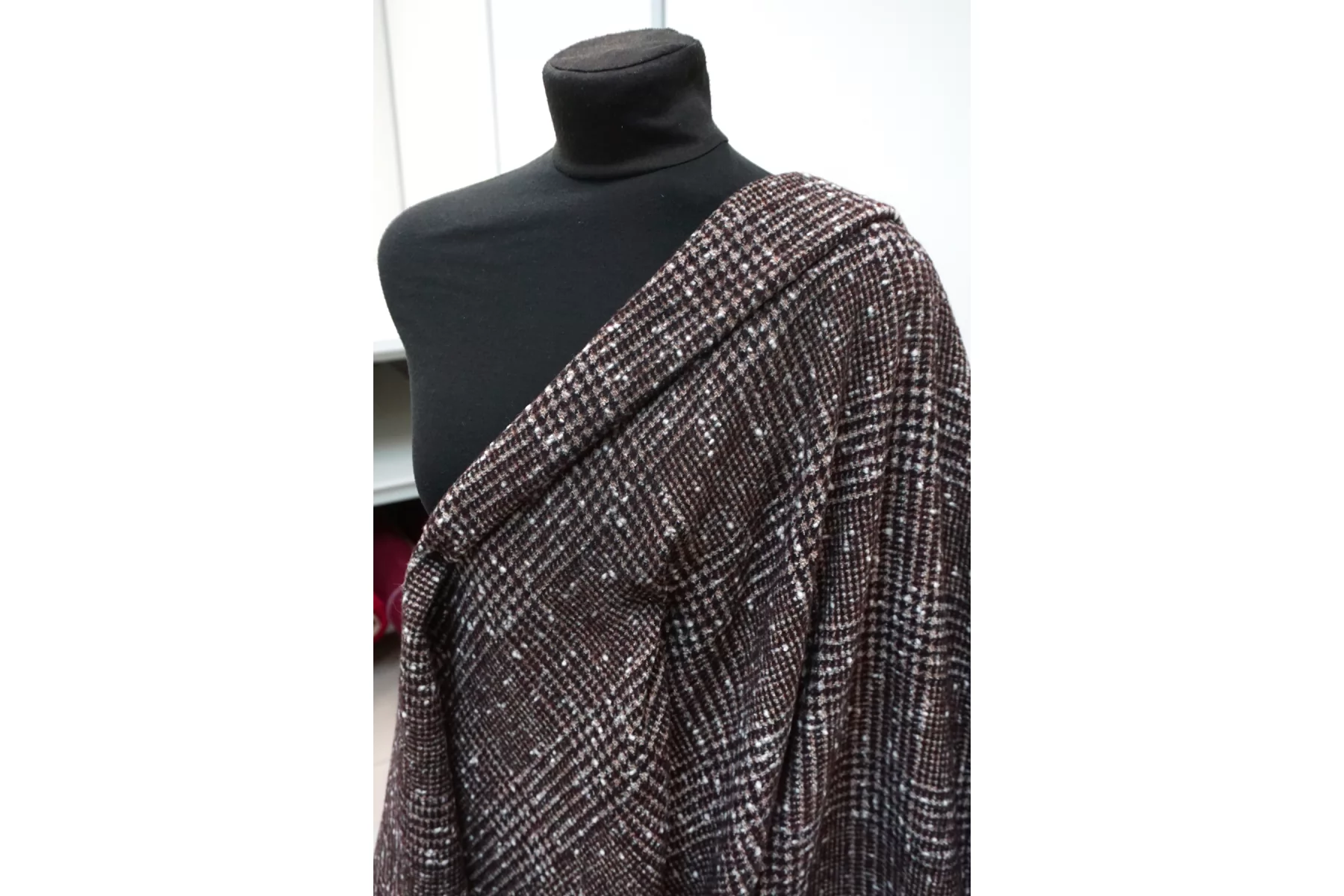 Пальтовая ткань из шерсти virgin и альпаки, с небольшой добавкой полиэстера. Нити белого, винного, чёрного и бежевого цвета. С фактурными узелками. Колется минимально. Не тянется. Не мнется. Не просвечивает. Немного рыхлая, так что лучше утеплять от продувания. Форму держит но при этом пластичная. Подойдет для пошива пальто. Уход деликатный.