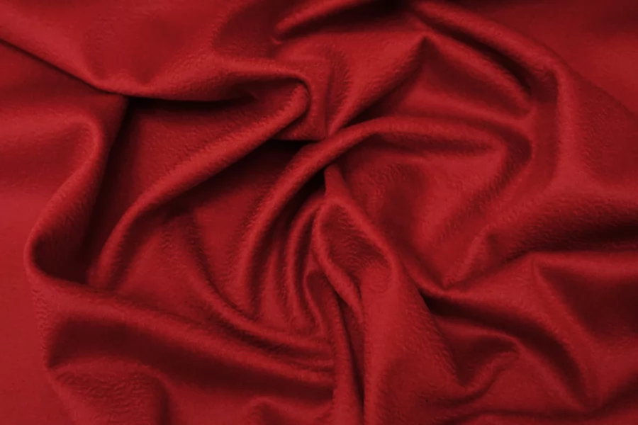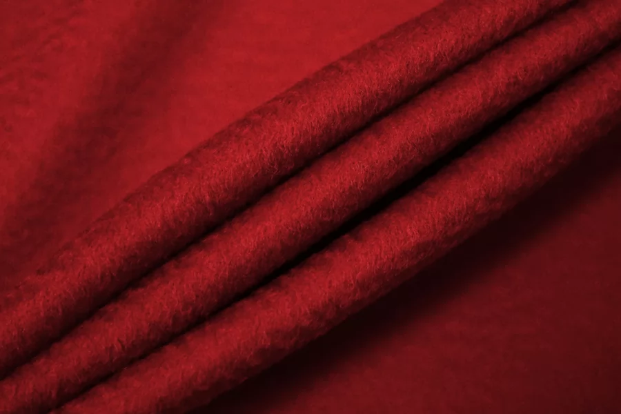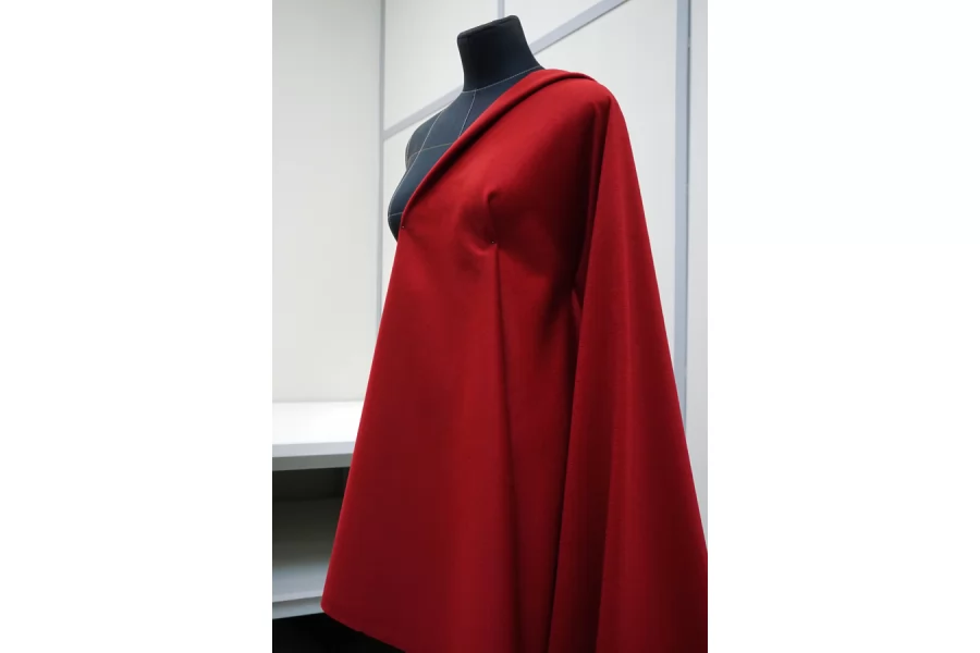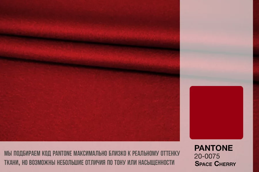Шикарная ткань из шерсти с кашемиром, в красивом красном цвете (с холодным, вишневым подтоном). Очень мягкая и приятная наощупь. Имеет короткий, прижатый направленный ворс (около 2 мм). Характерная для zibeline красивая волна на поверхности. Не колется. Не толстая, около 1 мм толщиной. Пластичный, форму держит, не мнется. Шьем пальто-рубашки, тёплые жакеты, облегчённые пальто. Уход - деликатный.
