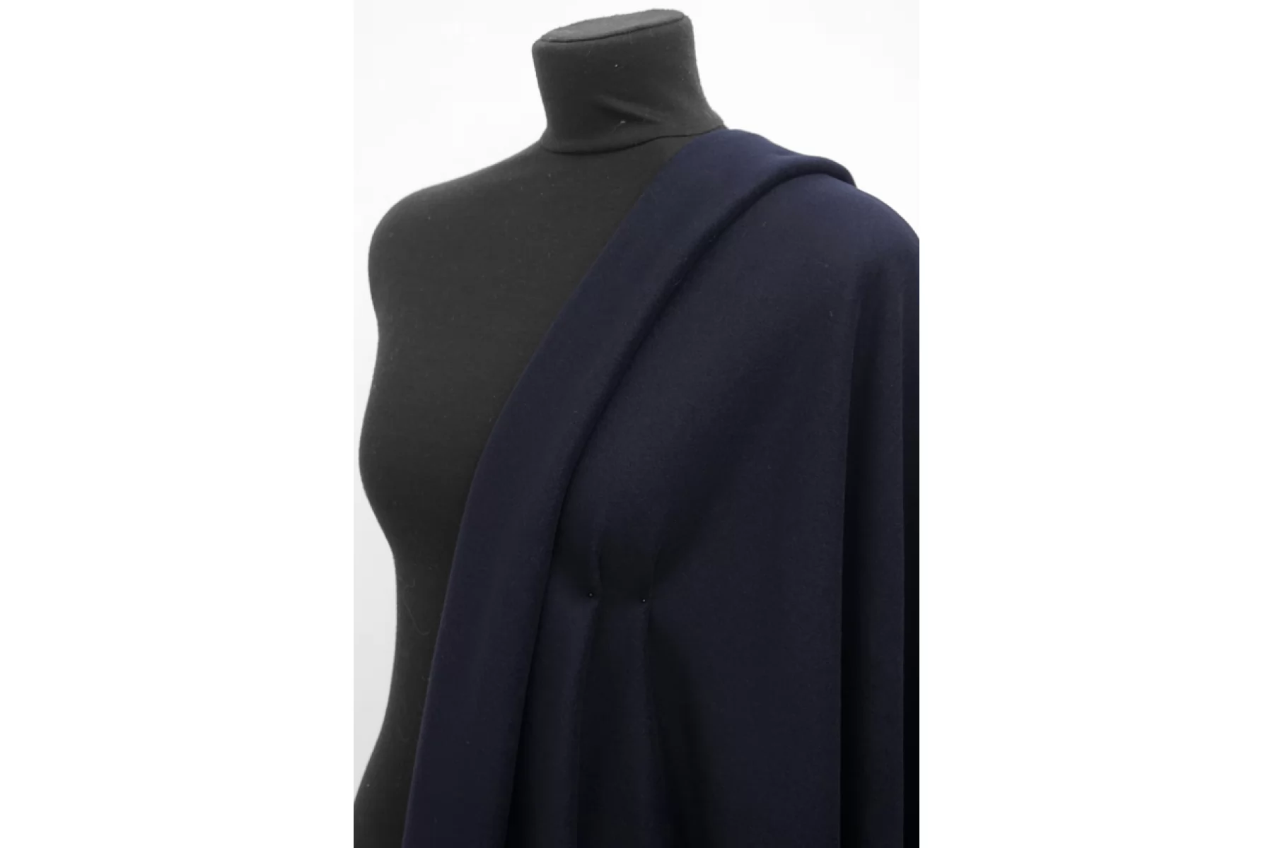 Очень приятная и мягкая пальтовая шерсть в очень темном синем оттенке. Чувствуется, что шерсть, но практически не колется. Лицевая сторона слегка ворсовая, но ворс прижат. Красива в пластике и складках. Не просвечивает. Не тянется. Материал плотненький ~1 мм толщиной. Немного держит форму. Сминается, но восстанавливается. Обладает приятным лоском. Отлично подойдет для пошива пальто любого кроя - от классического до пальто-рубашки.