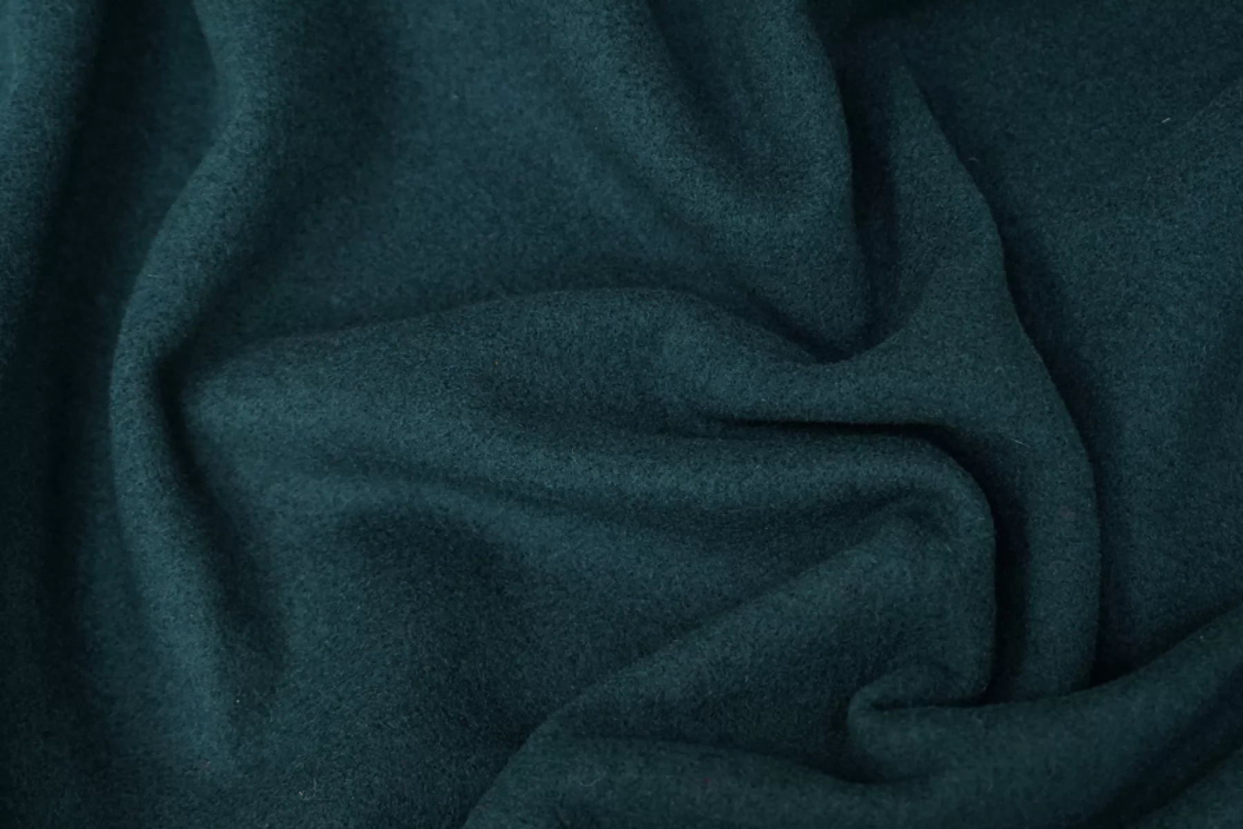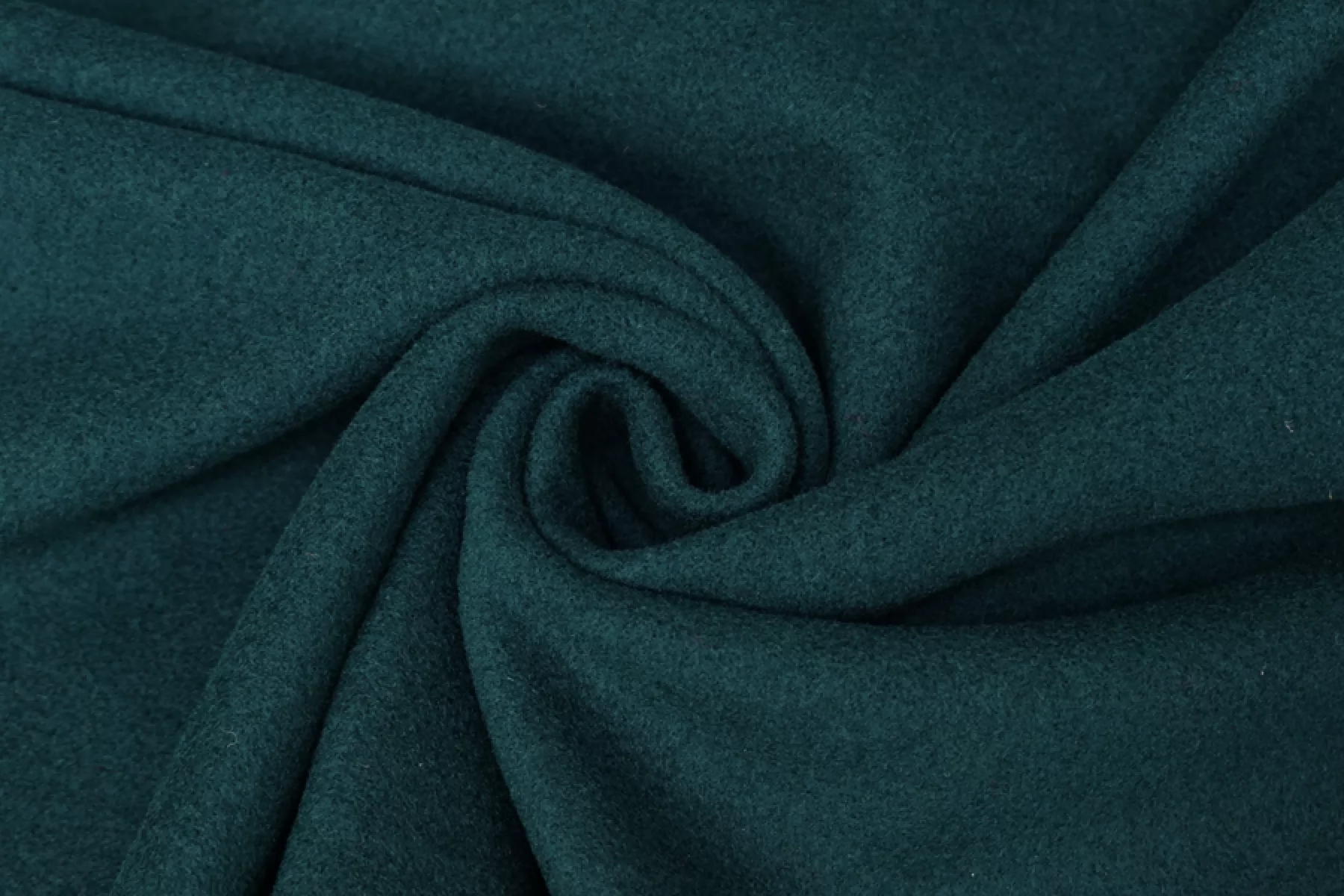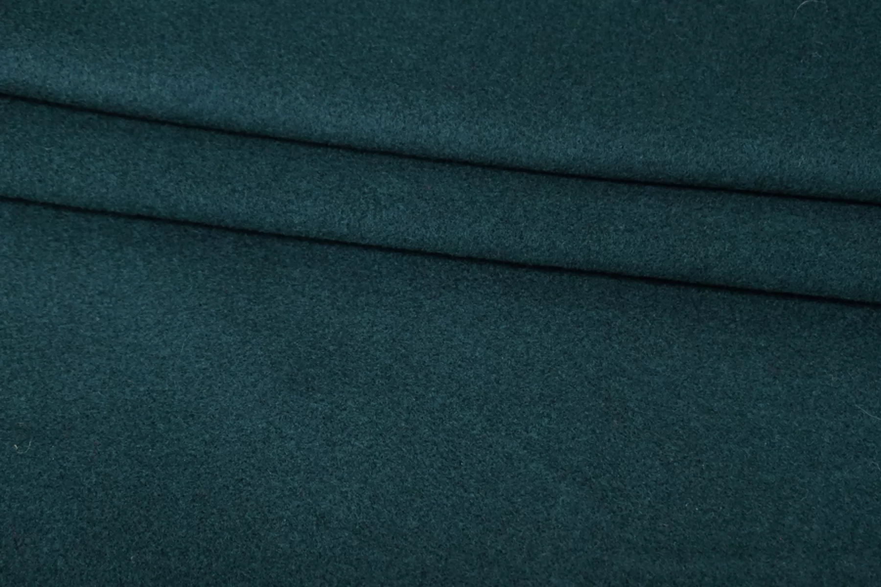 Прекрасный пальтовый велюр из шерсти красивого сине-зеленого оттенка. Ворс короткий ненаправленный. Материал очень мягкий и приятный наощупь. Толстенький , примерно 1 мм толщиной. Совсем немного суховата наощупь, не колется. Не тянется. Форму держит. Не мнется. Пластичный, не просвечивает. Красиво драпируется. Отличный вариант на пальто. Уход деликатный.