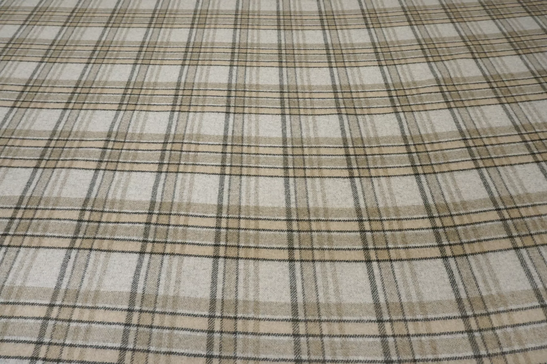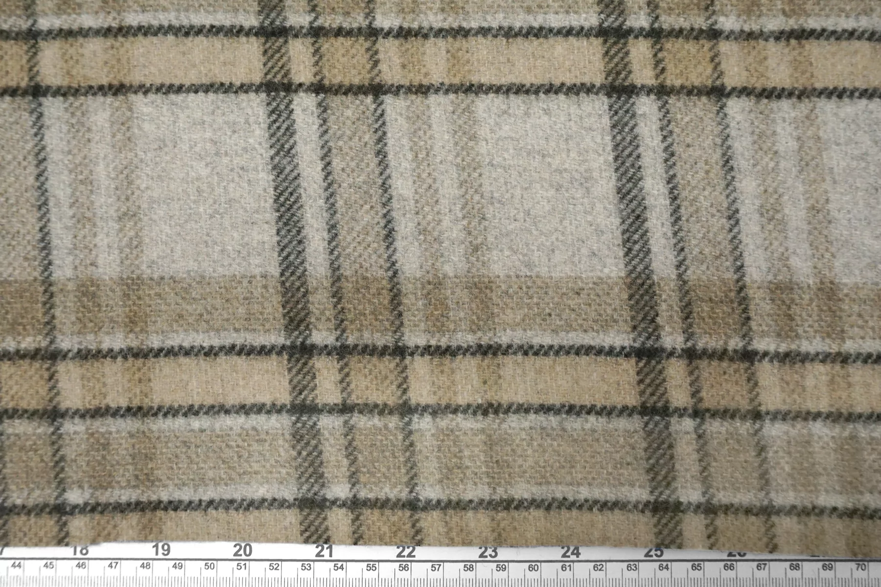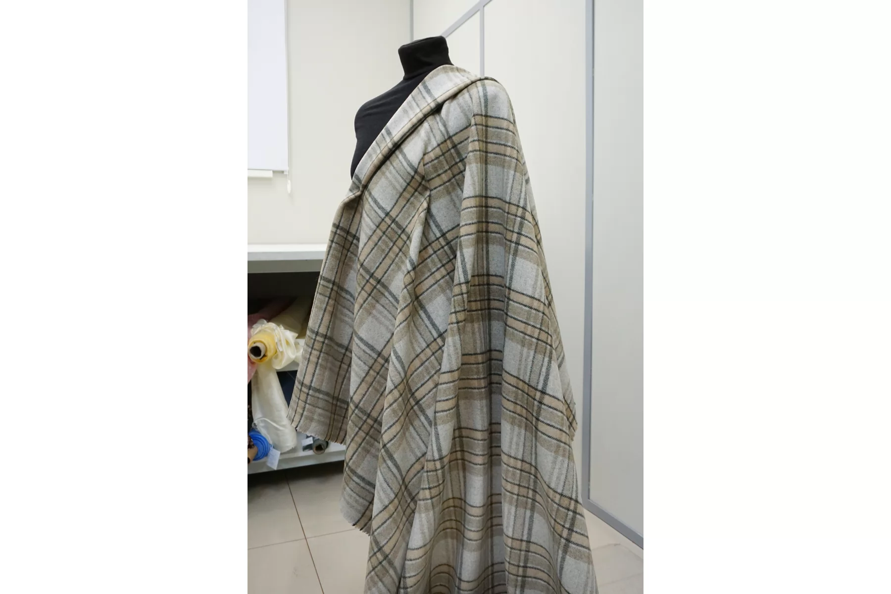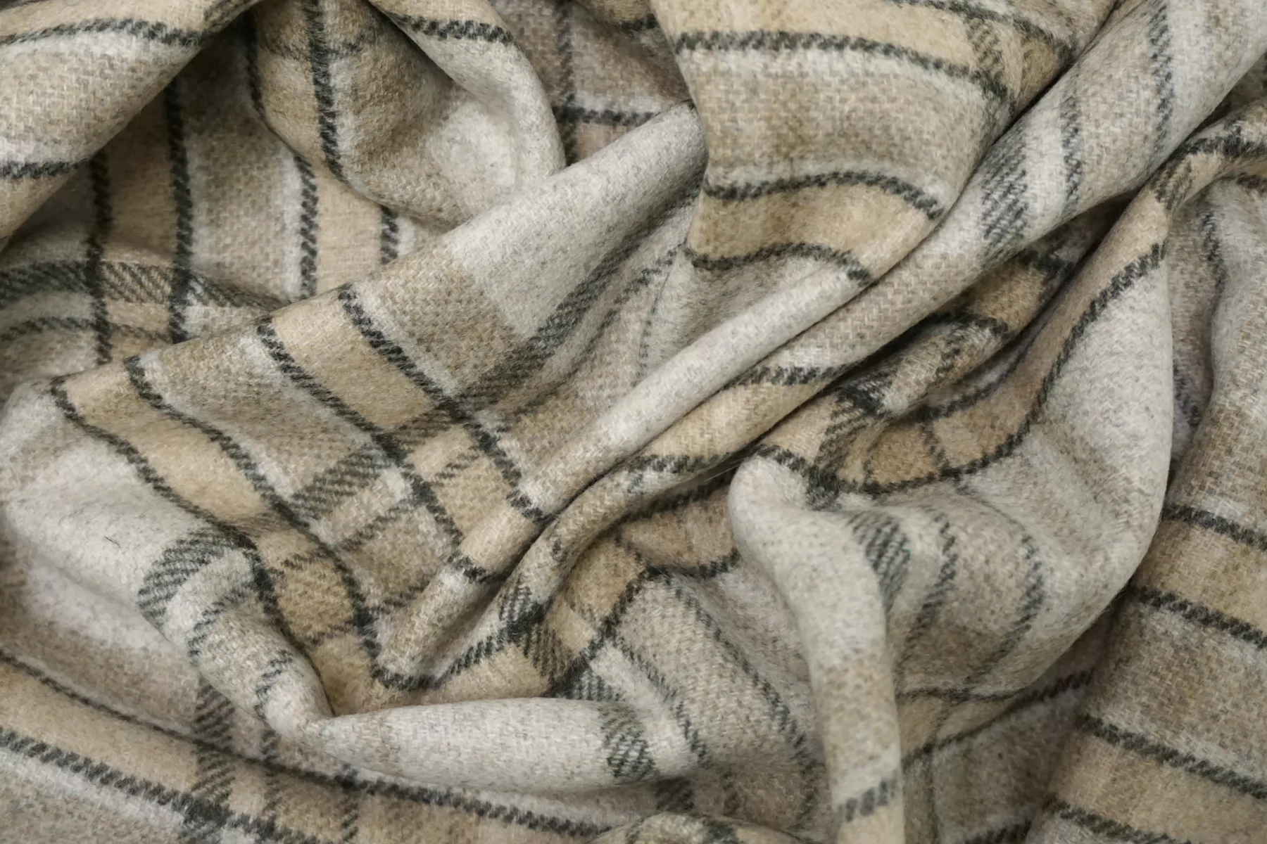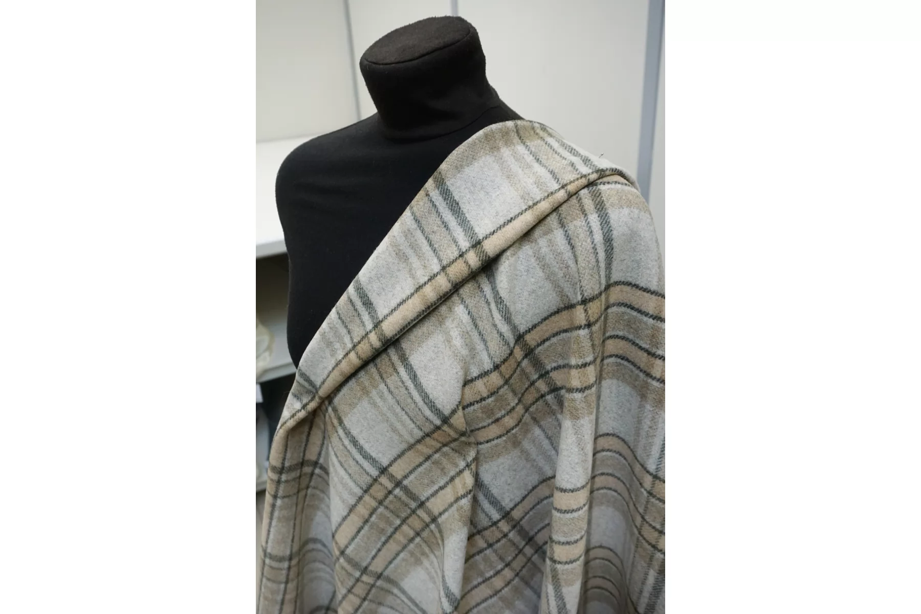 Пальтово-костюмная двухслойная шерсть качества virgin, слои разделяются. Обе стороны с одинаковым узором: клеткой, нити светло-серого, тёмно-серого и бежево-серого цвета. Одна сторона слегка ворсистая, без направленности. Тактильно мягкая, приятная, шерсть ощущается. Не тянется. Форму держит, умеренной пластичности. Не мнется. Отличный вариант для пошива пальто или тёплого жакета. Уход деликатный.