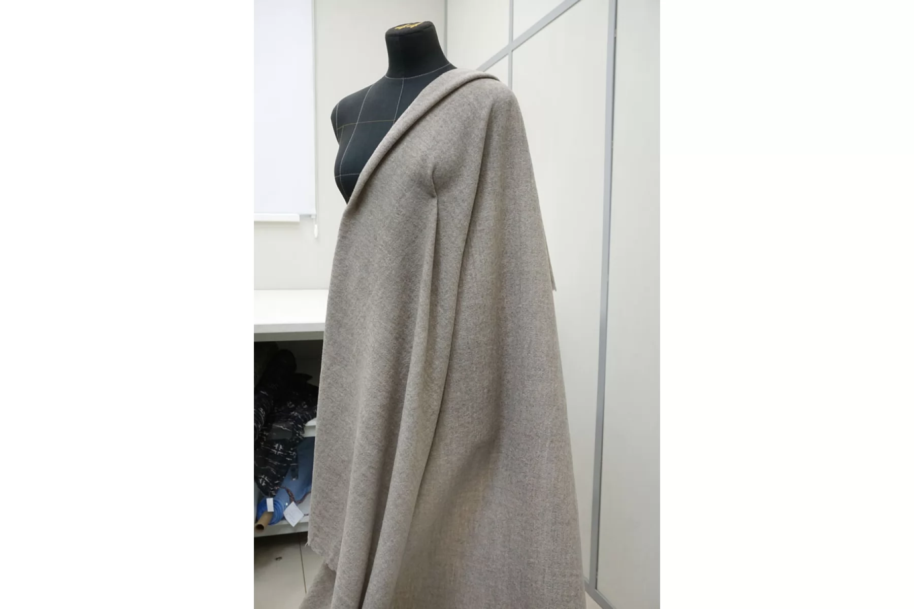 Пальтово-костюмная шерсть из шерсти и мохера. Плетение немного разреженное, нити ворсистые (без направленности). Тактильно суховата и мохер покалывает. Немного просвечивает в дырочки плетения. Пластичная. форму держит умеренно. Не тяжелая, продувается. Не тянется. Сминаемость слабая. Отличный вариант для пошива верхней группы одежды (лучше поставить на утеплитель, простёганную подкладку), а также костюмных вариантов и мягких жакетов.