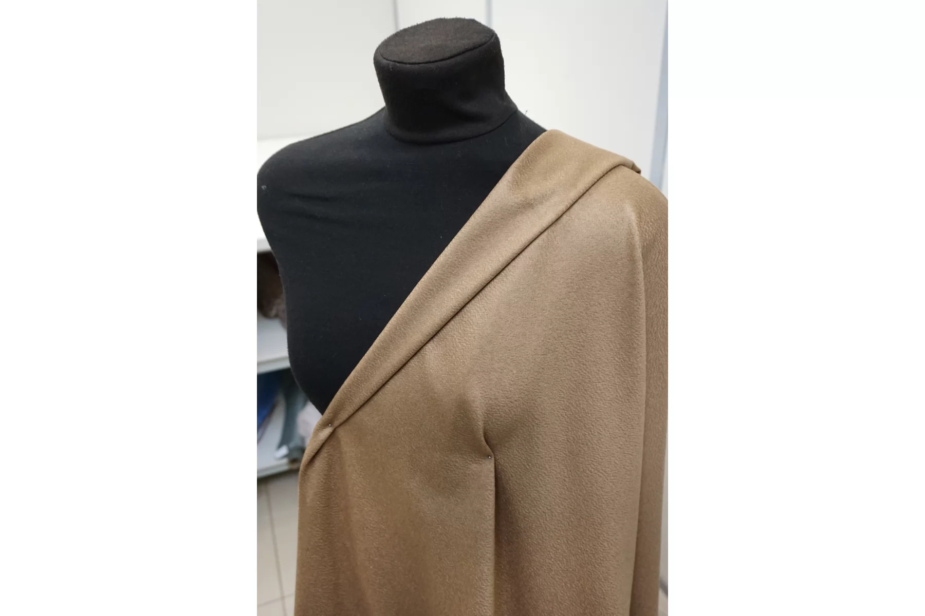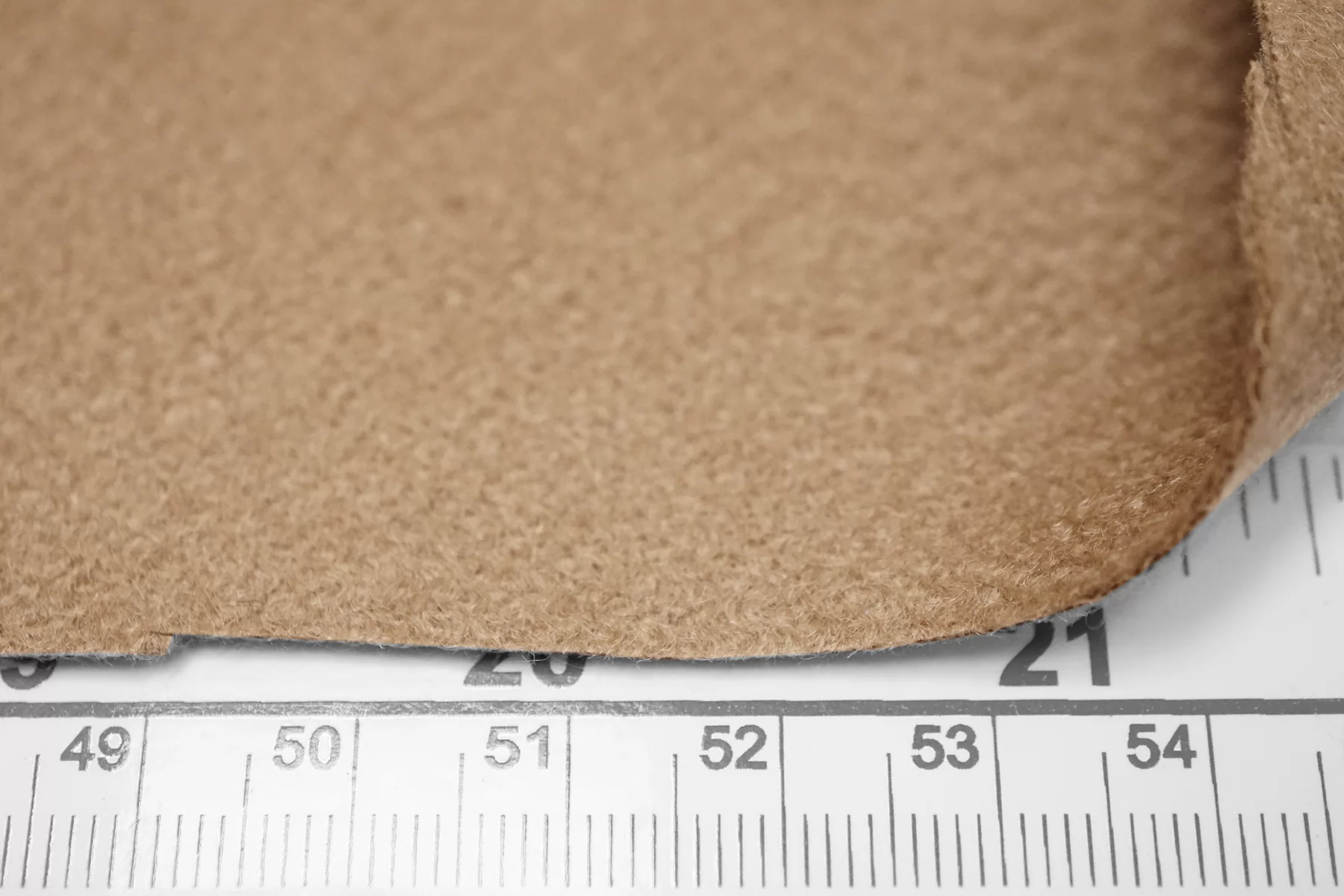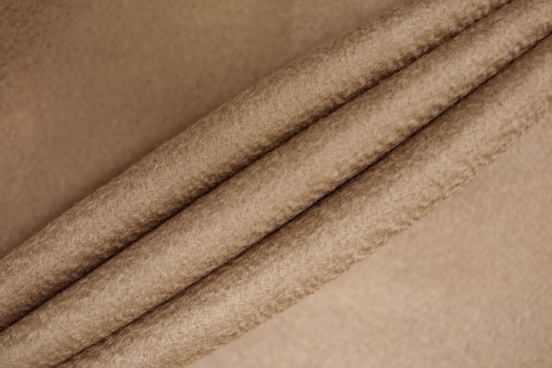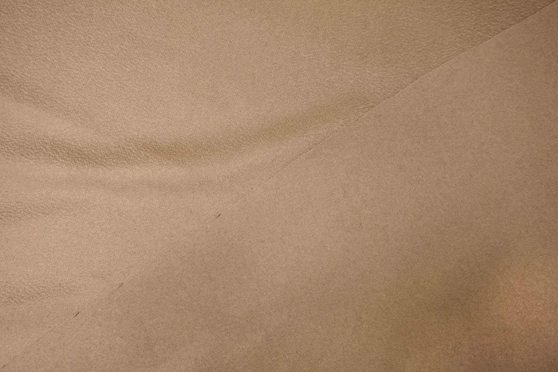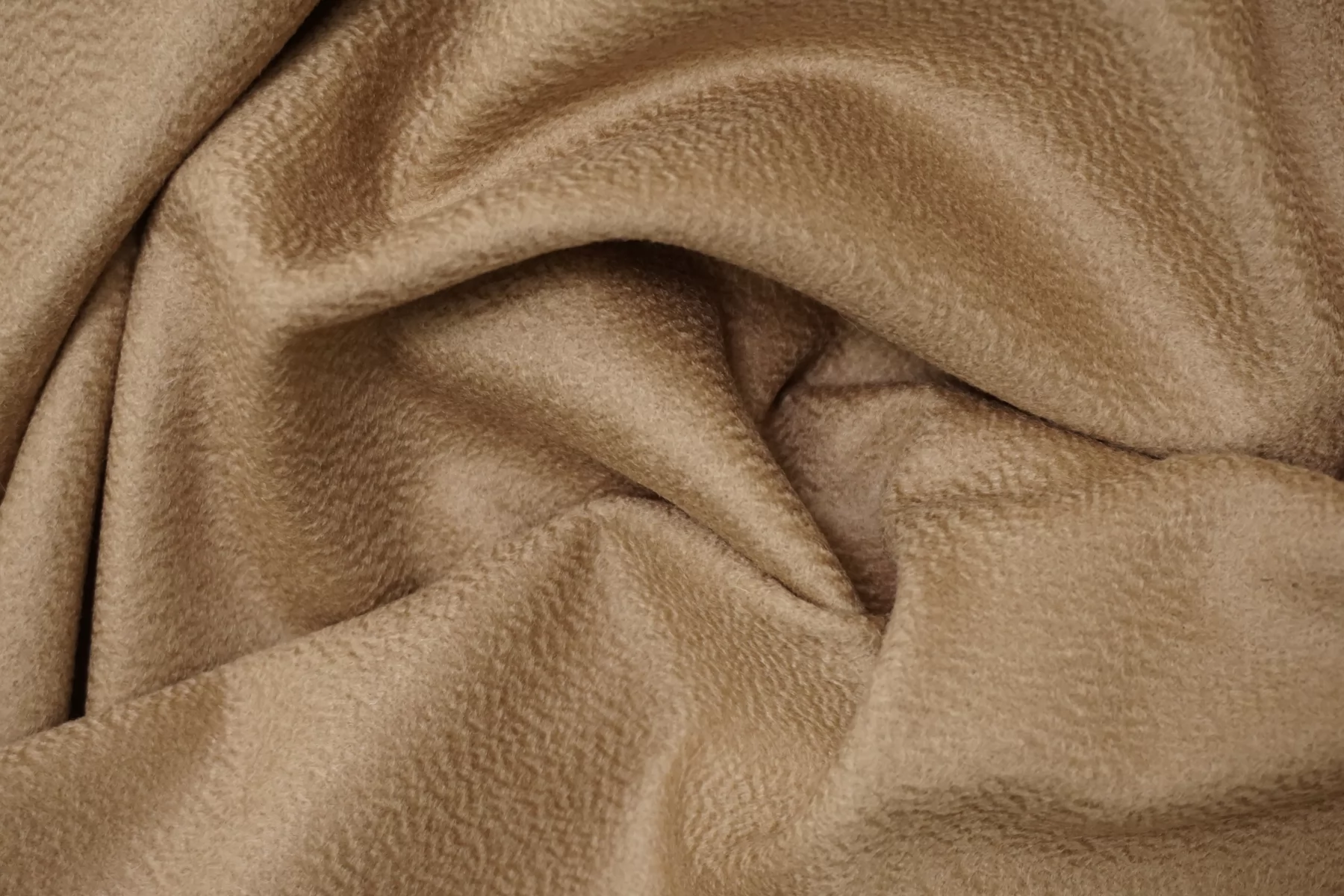 Прекрасный кашемир от Burberry, пальтово-костюмной плотности, в классическом песочно-бежевом оттенке. Очень мягкий и приятный наощупь. Имеет короткий, прижатый направленный ворс (около 2 мм). Характерная для zibeline красивая волна на поверхности. Не колется. Не толстый, около 1,5 мм толщиной. Пластичный, форму держит, не мнется. Шьем пальто-рубашки, тёплые жакеты, облегчённые пальто. Уход - деликатный.