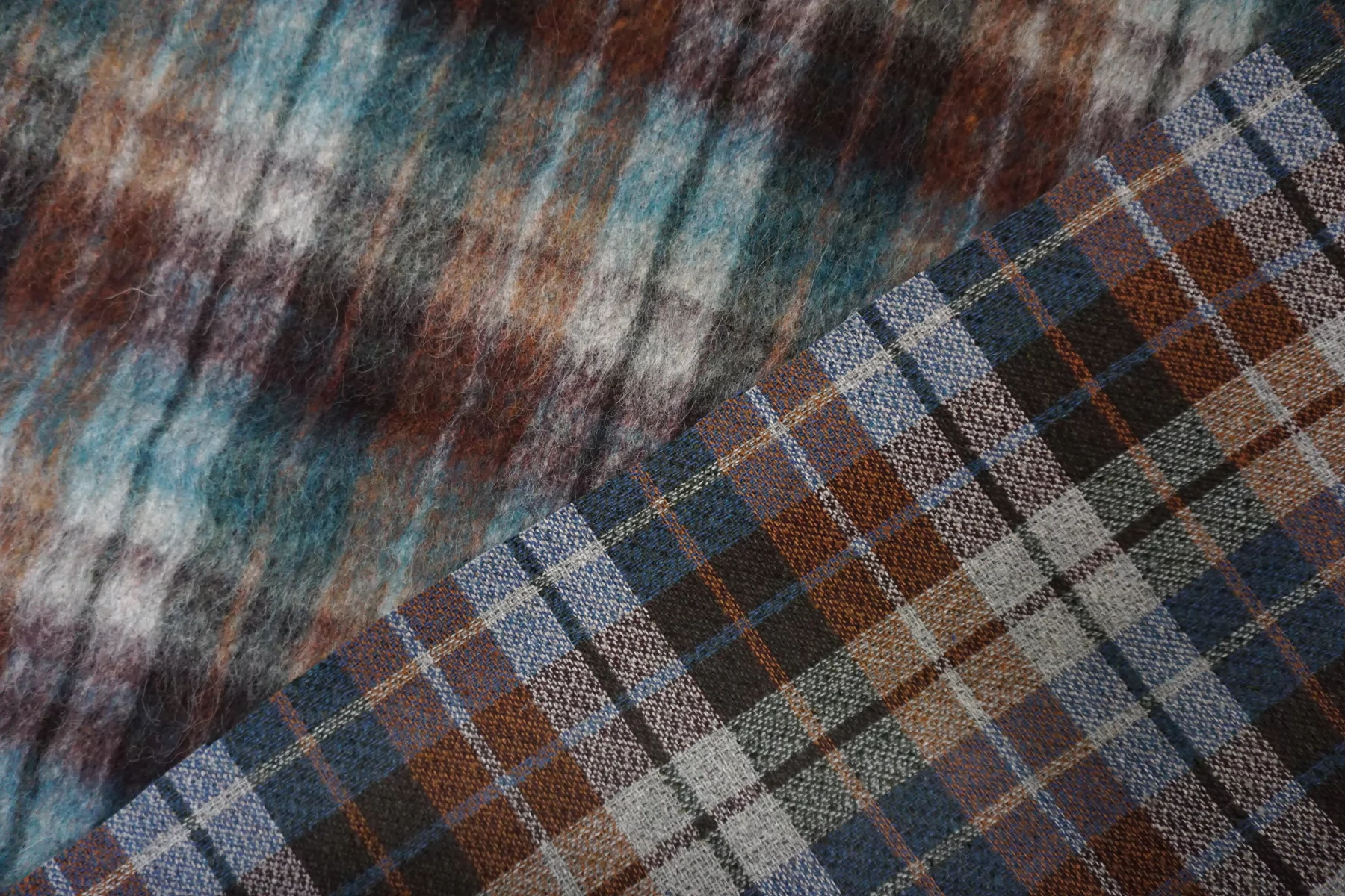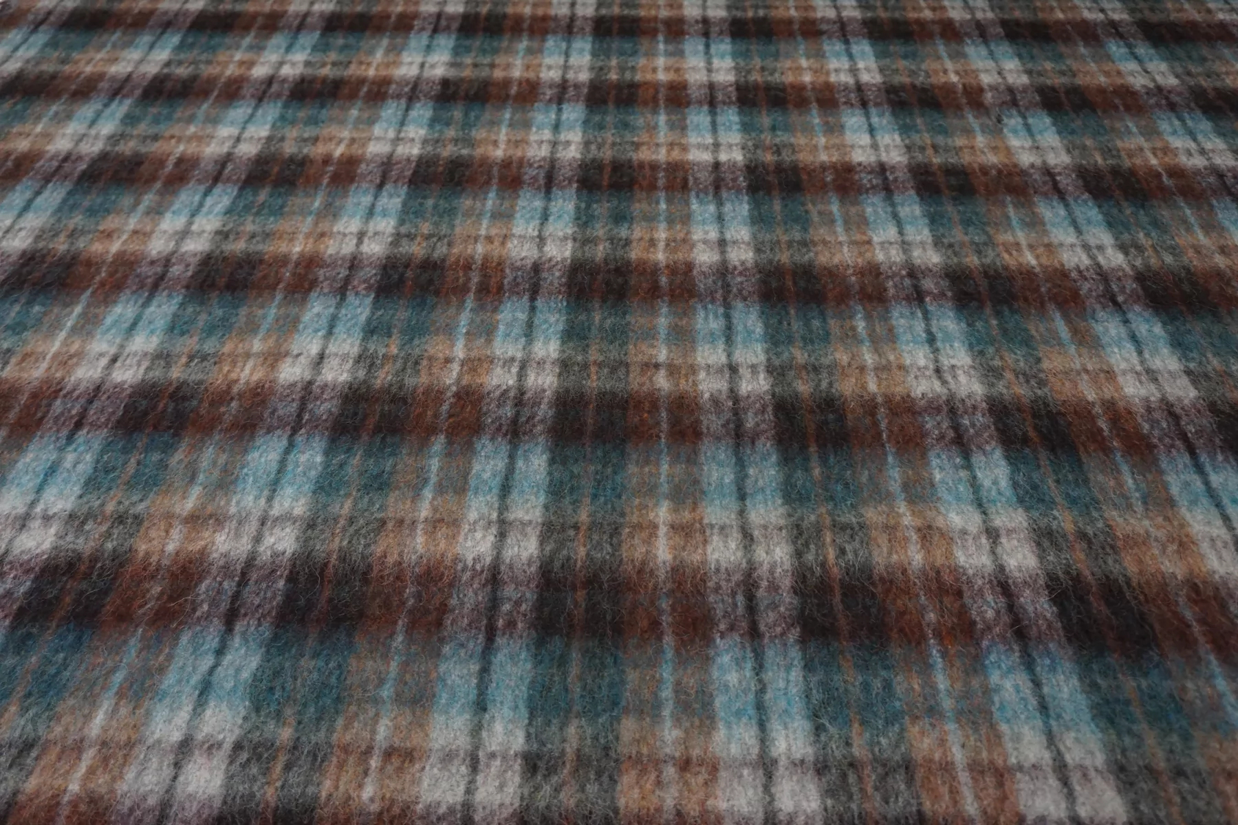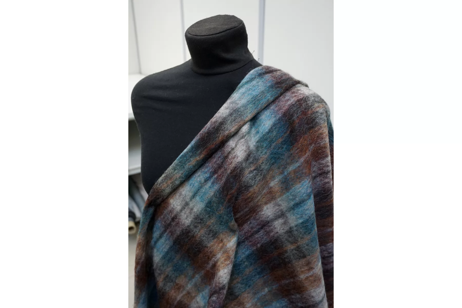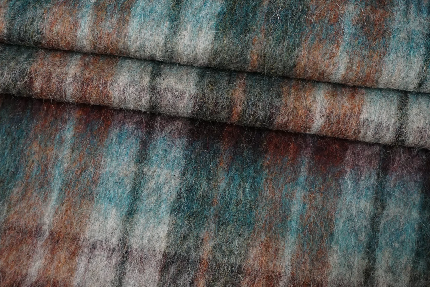 Интересная пальтовая ткань из мохера и шерсти, с небольшой добавкой акрила, в крупную клетку. Нити приглушённо-зелёного, сливового, серого цвета. Плетение не очень плотное. Ворс направленный, прижатый. Материал шероховатый наощупь, колется. Толщина примерно 1 мм. Не тянется. Форму держит. Не мнется. Подойдет для пошива пальто. Лучше утеплить, т.к. материал продувается. Уход деликатный.