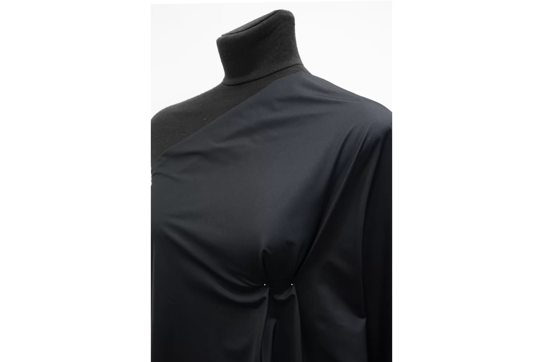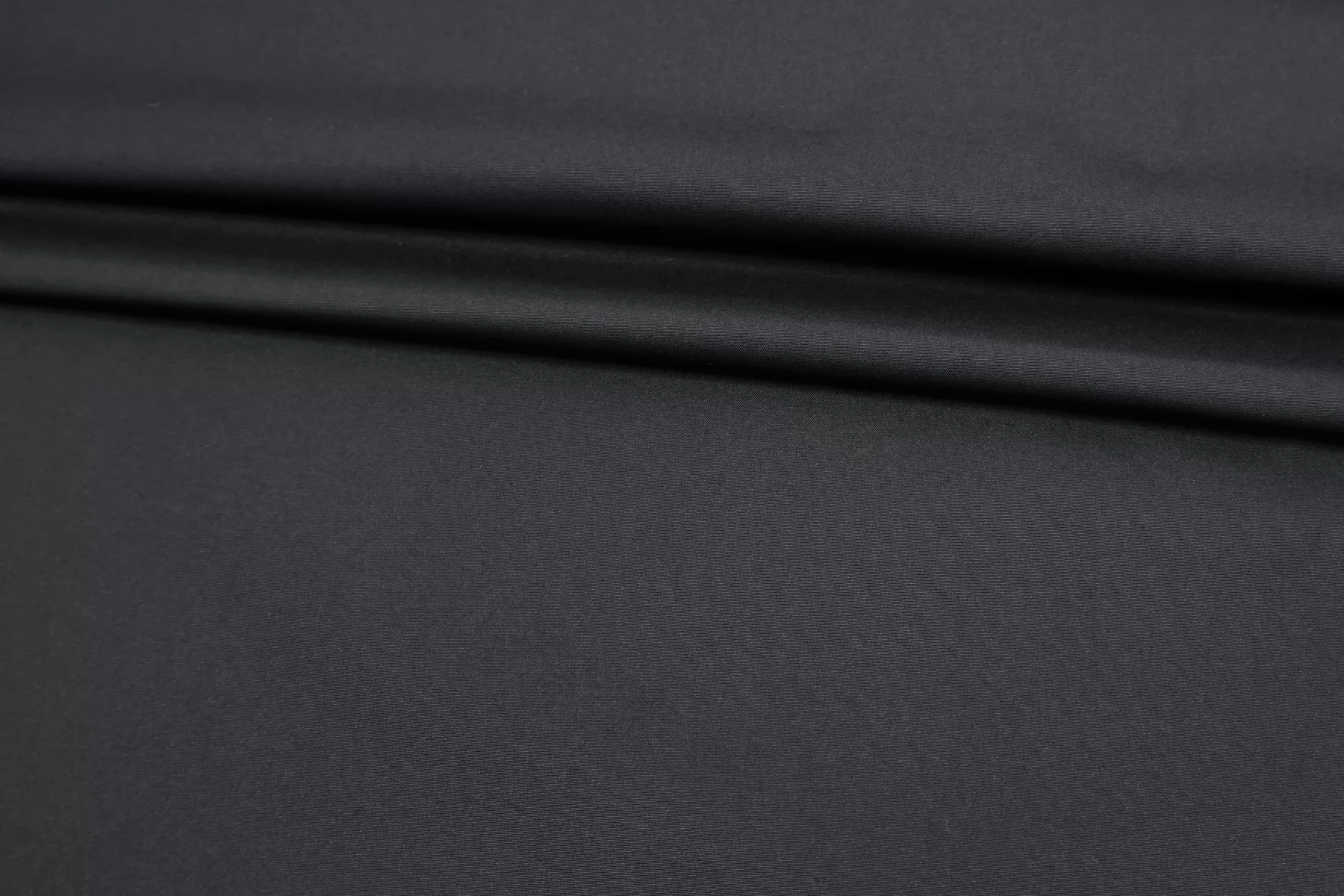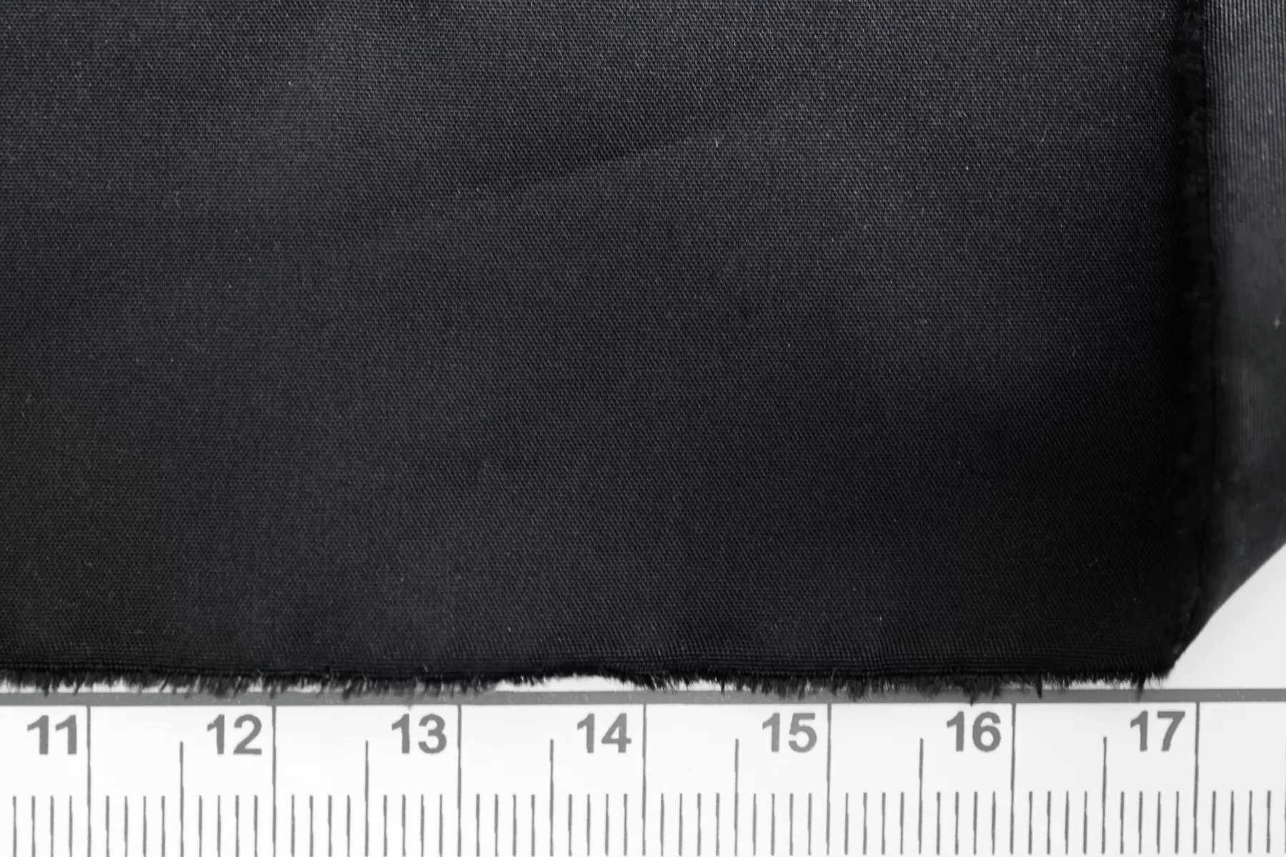 Плащевая ткань в чёрном цвете. Плащевка тактильно приятная, гладкая, довольно тонкая, с одной стороны есть отблеск, оборотная сторона матовая. Капли легко скатываются, не впитываясь даже с течением времени. Сминается (частично восстанавливается), слегка шуршит. Не тянется, не просвечивает. Форму не держит. Прекрасно подойдет на плащи (совсем тоненькие, типа дождевиков), куртки и пуховики (простегать с наполнителем и подкладкой).