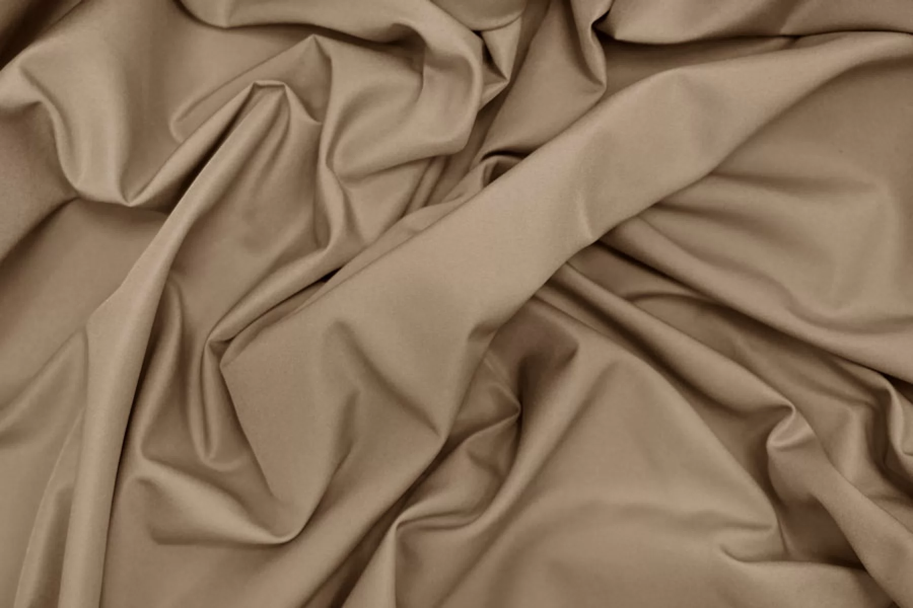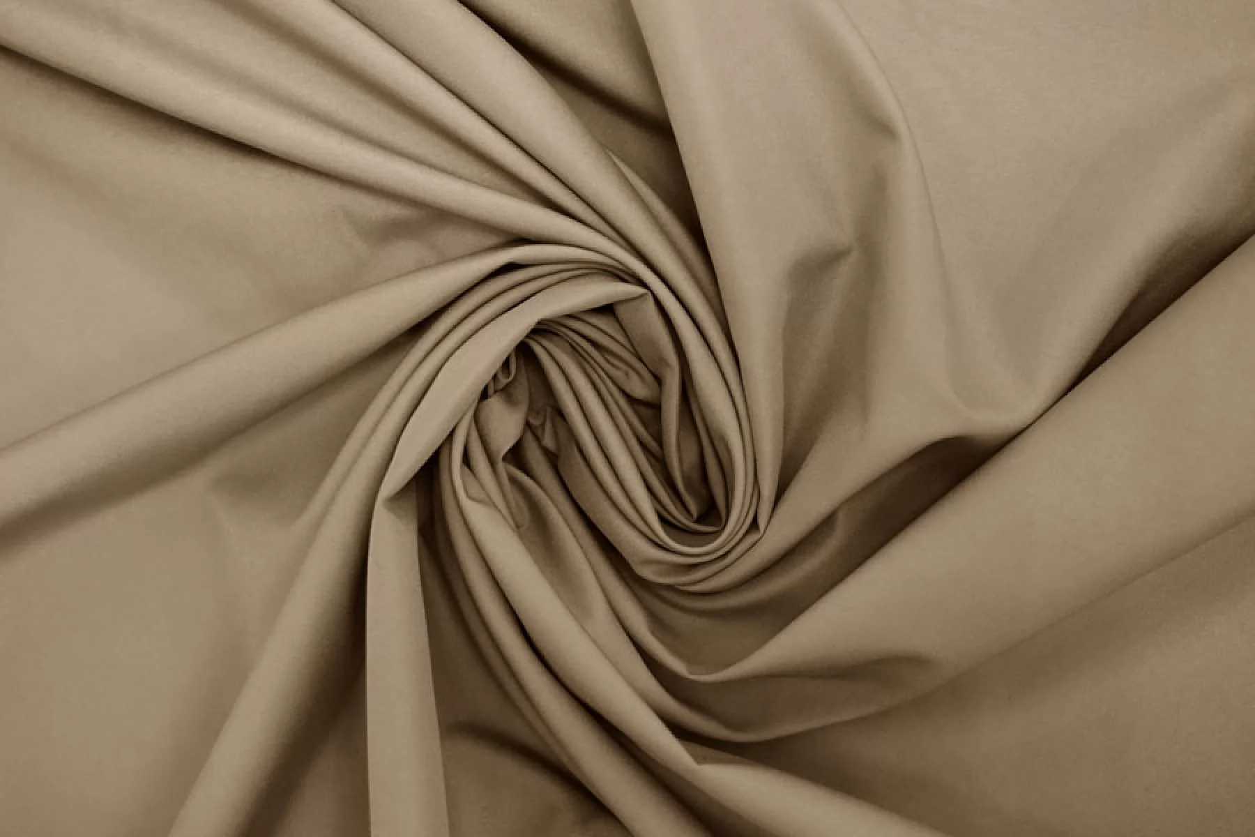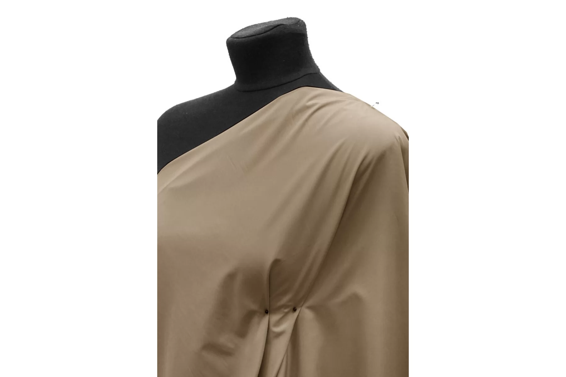 Плащевый нейлон в красивом бежевом оттенке. Плащевка тактильно приятная, гладкая, довольно тонкая, обе стороны с лоском. Капли легко скатываются, не впитываясь даже с течением времени. Сминается, шуршит. Не тянется, не просвечивает. Слегка держит форму. Прекрасно подойдет на плащи, куртки и пуховики (простегать с наполнителем и подкладкой).