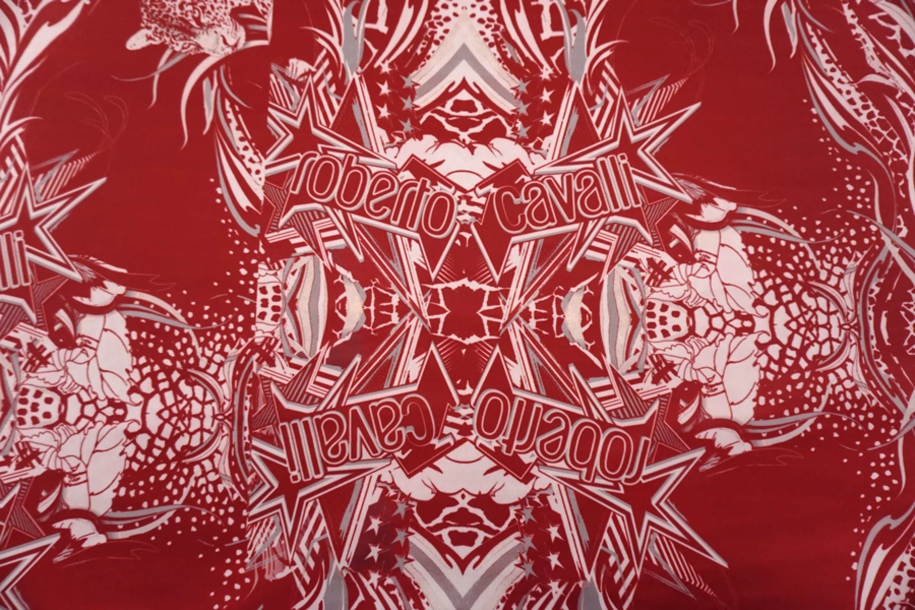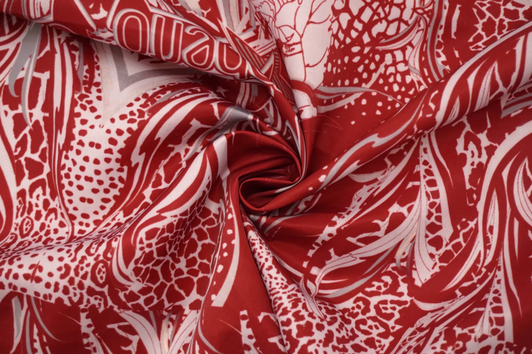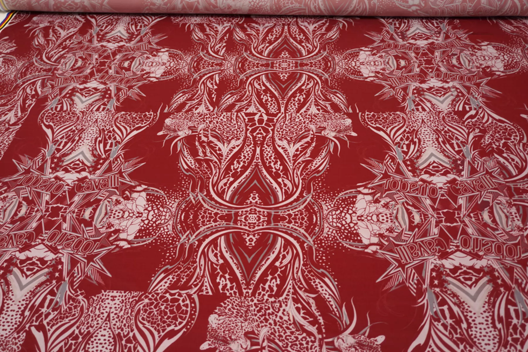 Плащевая ткань от Roberto Cavalli, в бордовом оттенке. Имеет сложный абстрактный принт с элементами леопарда. Достаточно матовая. Плотная, тонкая, легкая, вода хорошо стекает и немного впитывает, если долго держать, ветрозащитная. Подойдет для пошива куртки, плаща, пуховика (простегать с наполнителем и подкладкой).