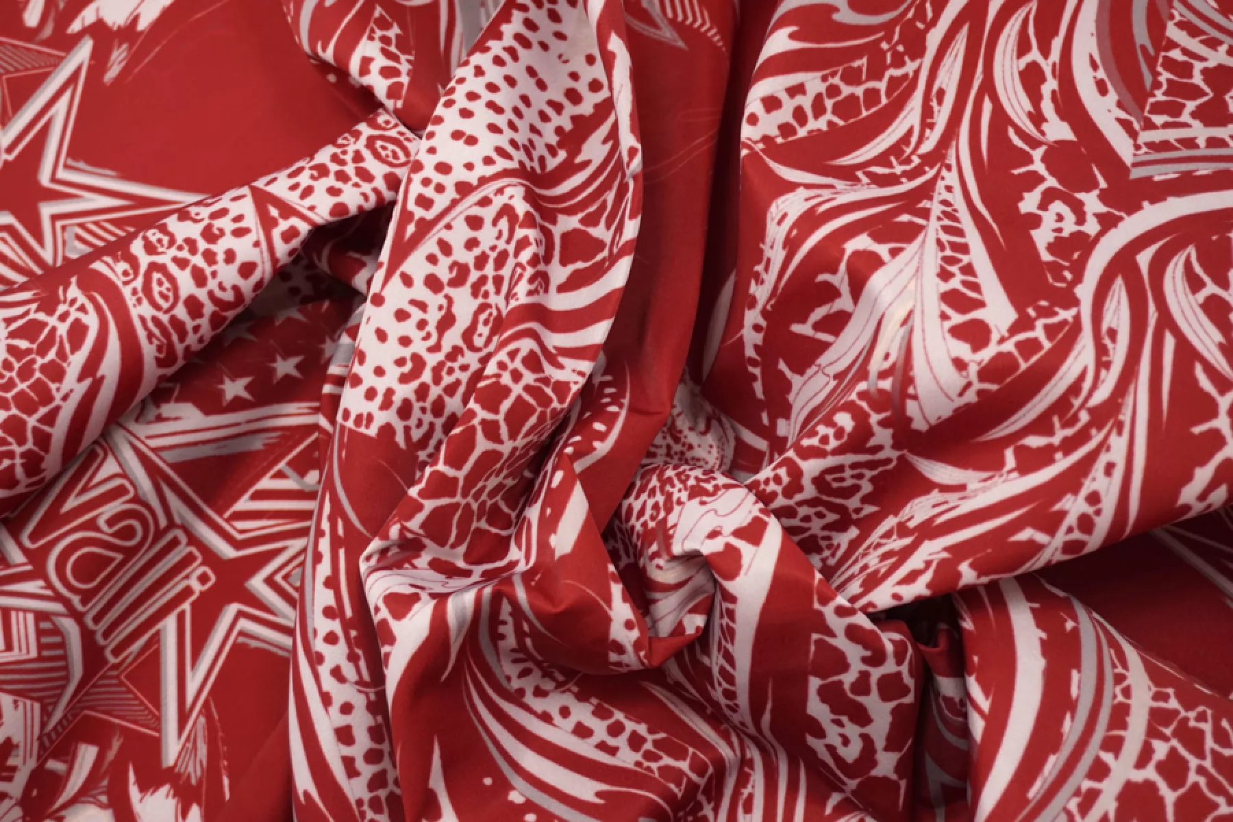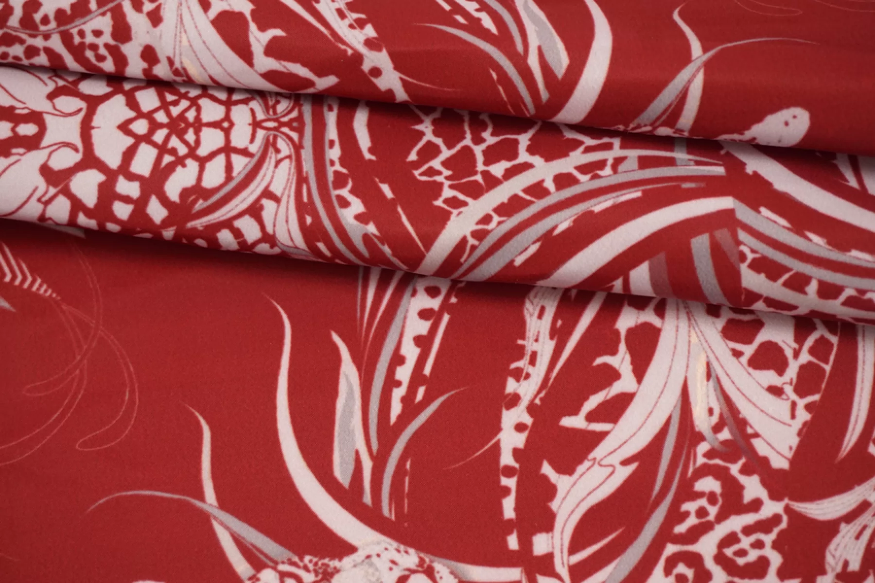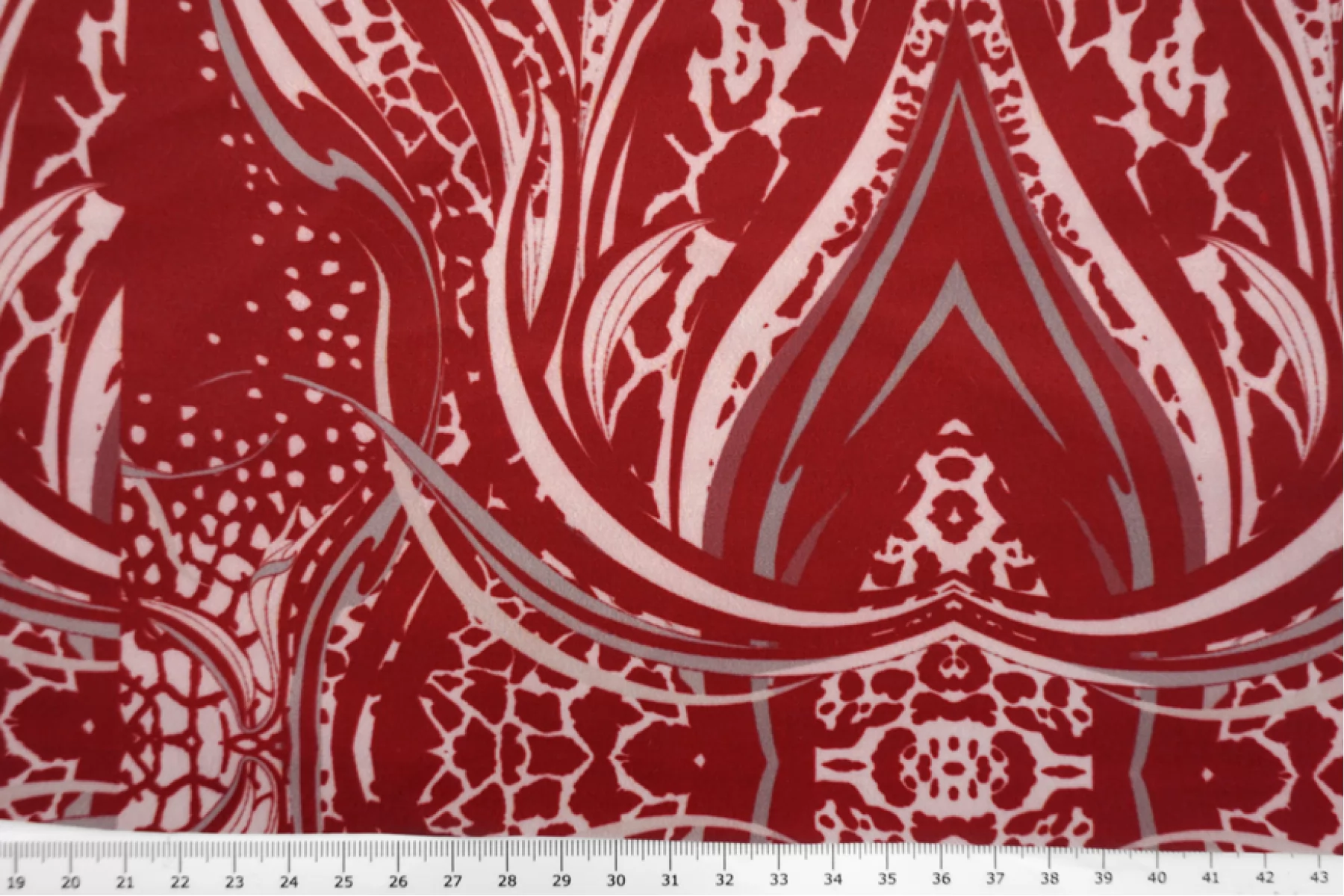 Плащевая ткань от Roberto Cavalli, в бордовом оттенке. Имеет сложный абстрактный принт с элементами леопарда. Достаточно матовая. Плотная, тонкая, легкая, вода хорошо стекает и немного впитывает, если долго держать, ветрозащитная. Подойдет для пошива куртки, плаща, пуховика (простегать с наполнителем и подкладкой).