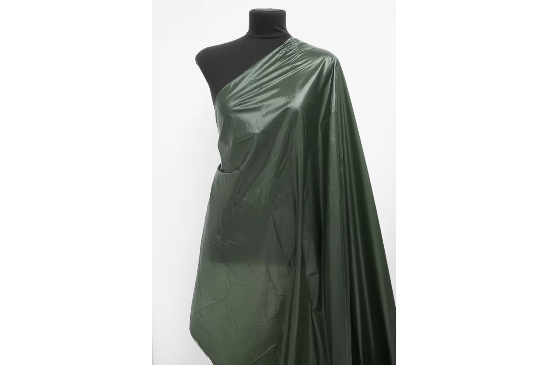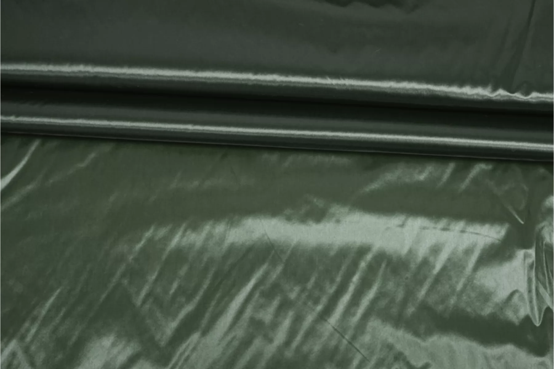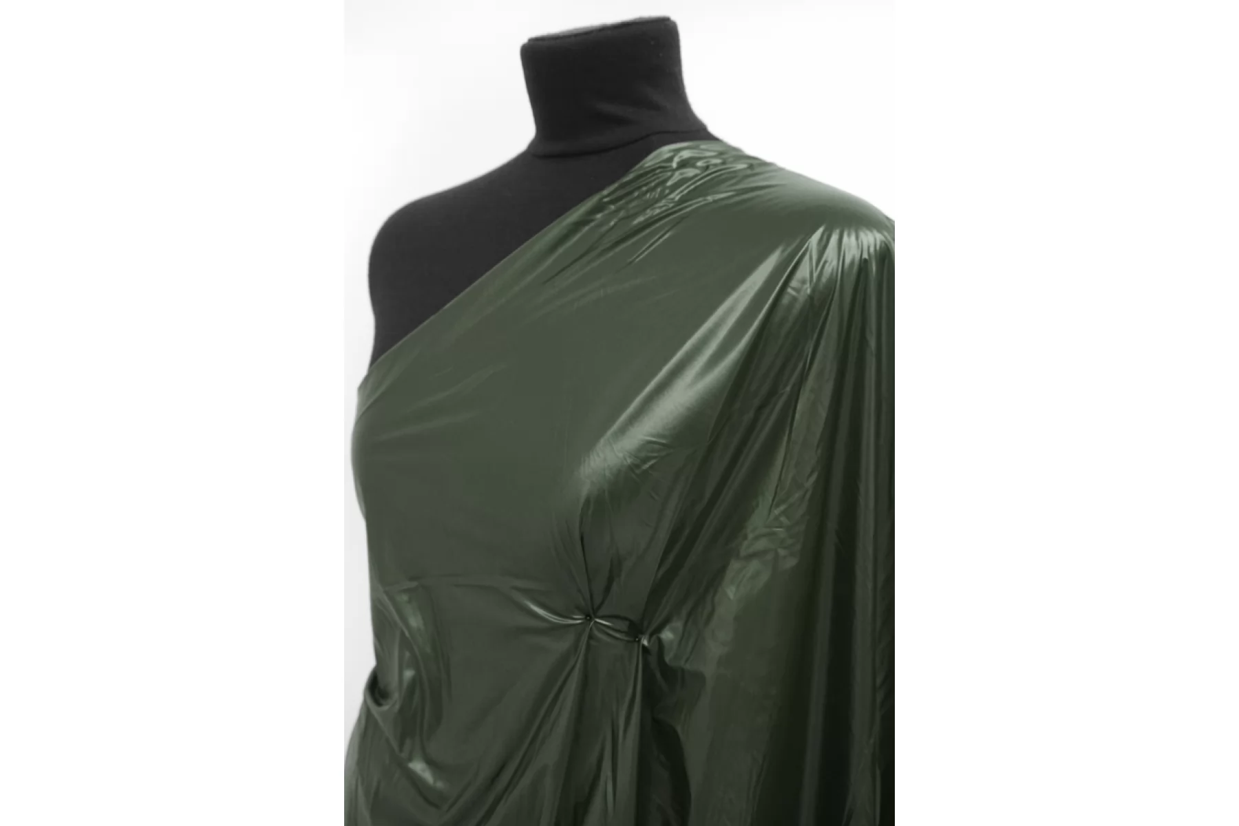 Плащевая тонкая ткань красивого темно-зеленого оттенка от MAX MARA. Обладает глянцевым блеском. Тактильно очень приятная, мягкая. Плотная, легкая. Ветрозащитная, вода скатывается с поверхности. Сминается. Прекрасно подойдет для пошива куртки, плаща(простегать с наполнителем и подкладкой).