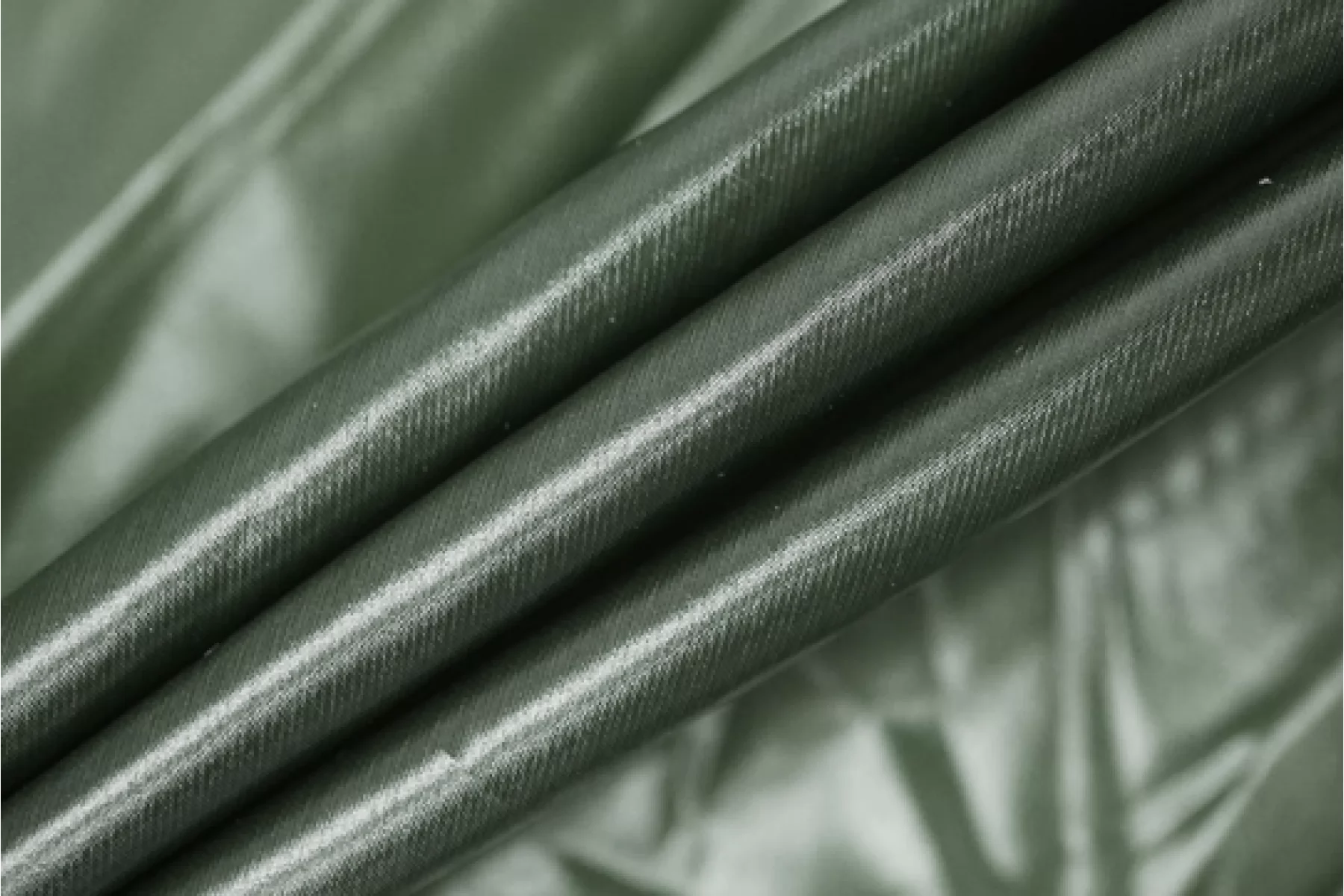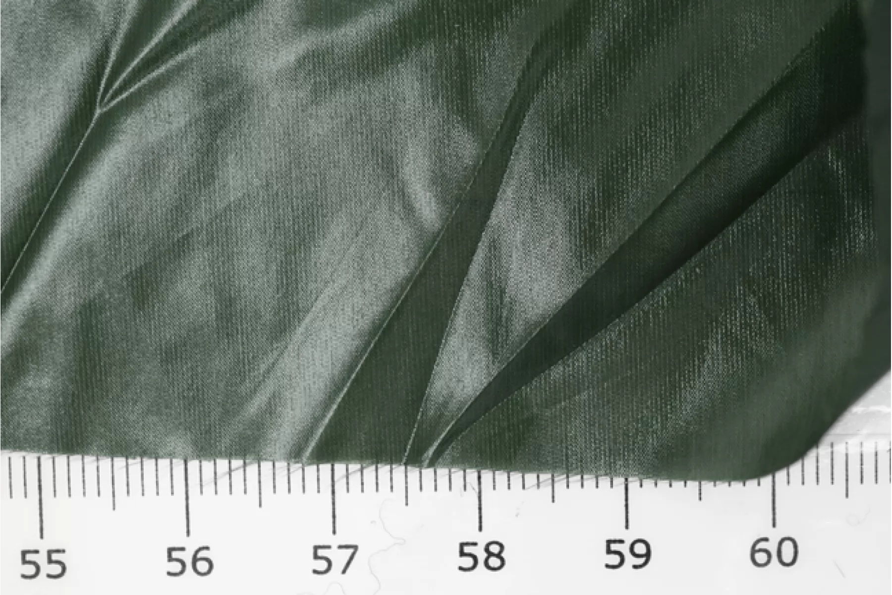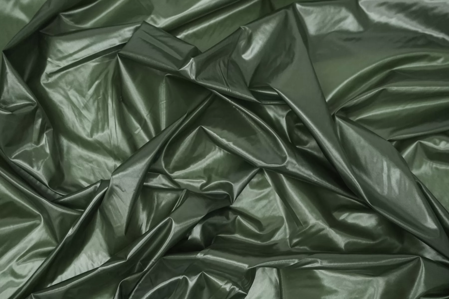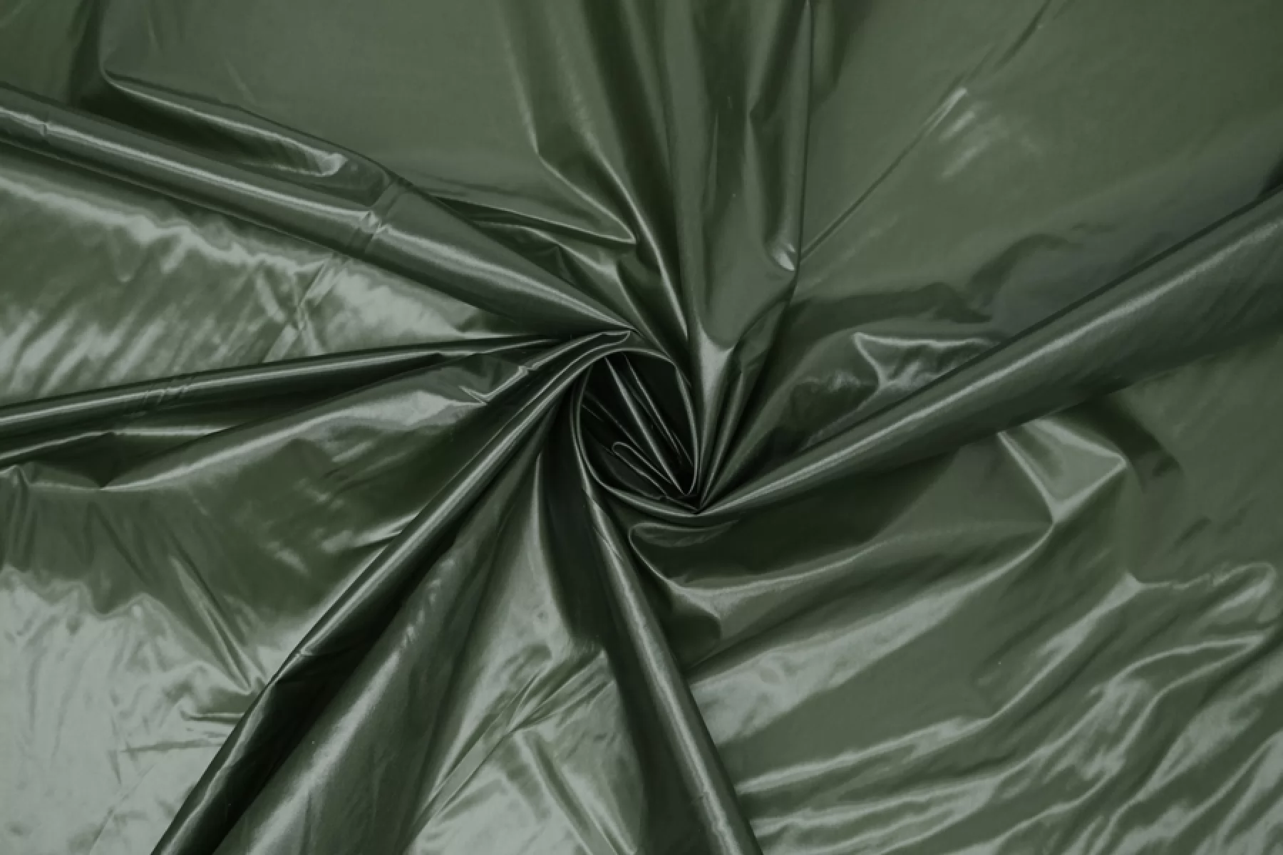 Плащевая тонкая ткань красивого темно-зеленого оттенка от MAX MARA. Обладает глянцевым блеском. Тактильно очень приятная, мягкая. Плотная, легкая. Ветрозащитная, вода скатывается с поверхности. Сминается. Прекрасно подойдет для пошива куртки, плаща(простегать с наполнителем и подкладкой).