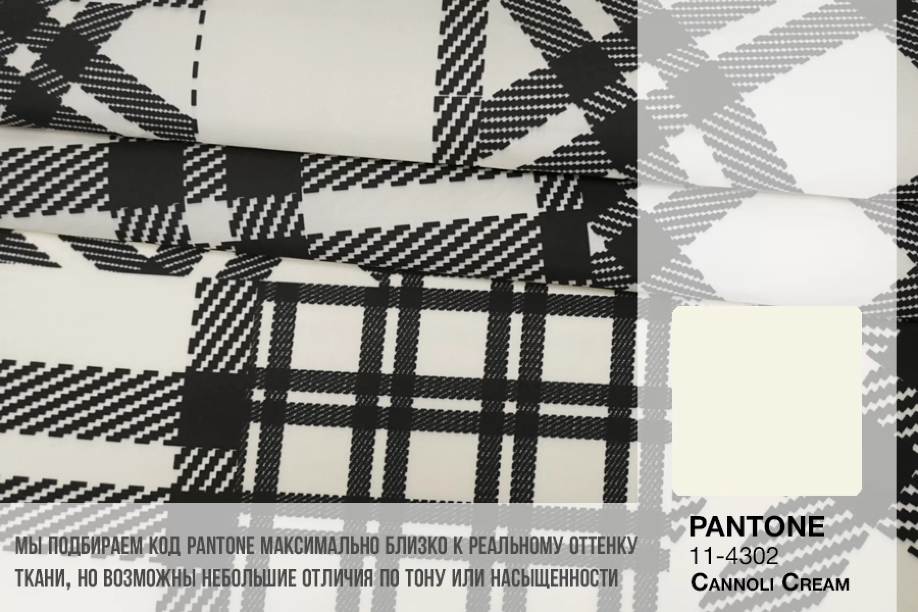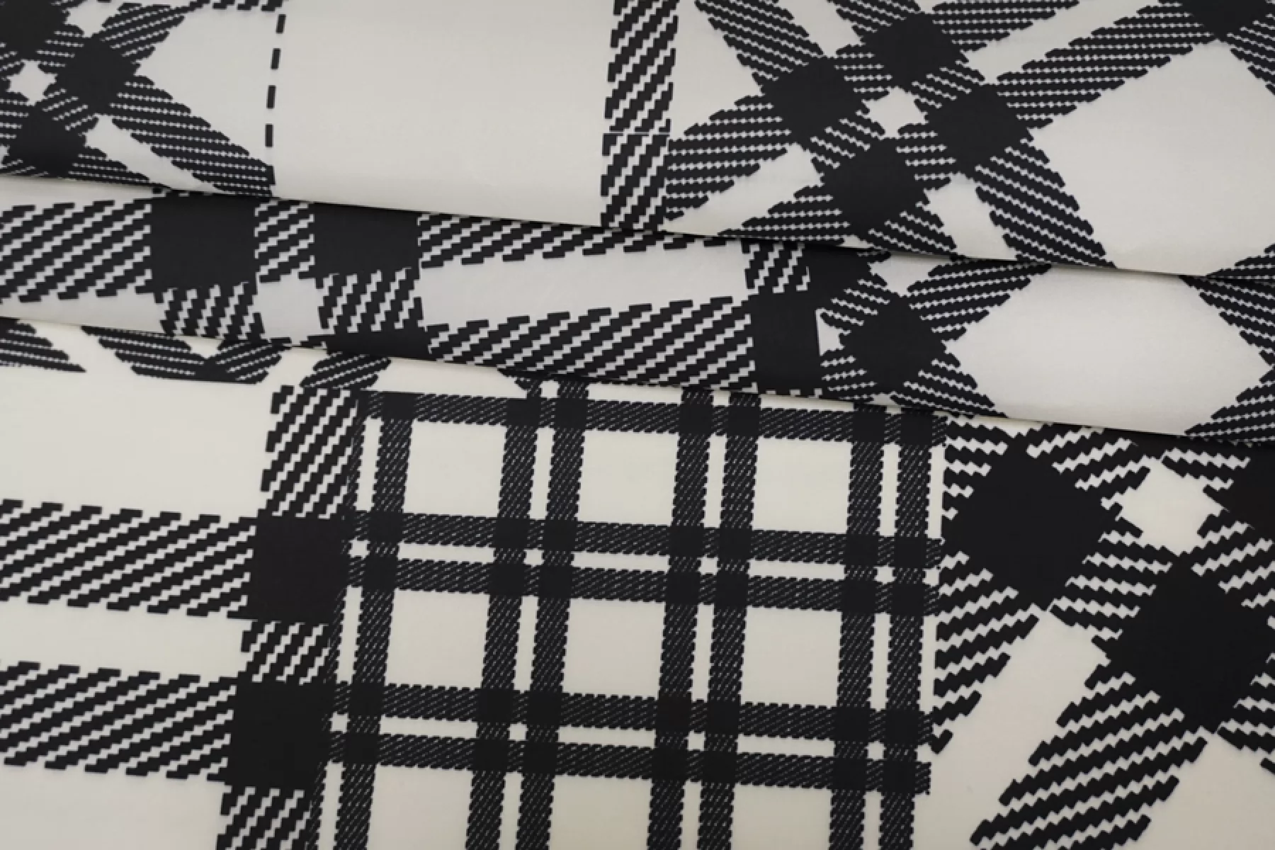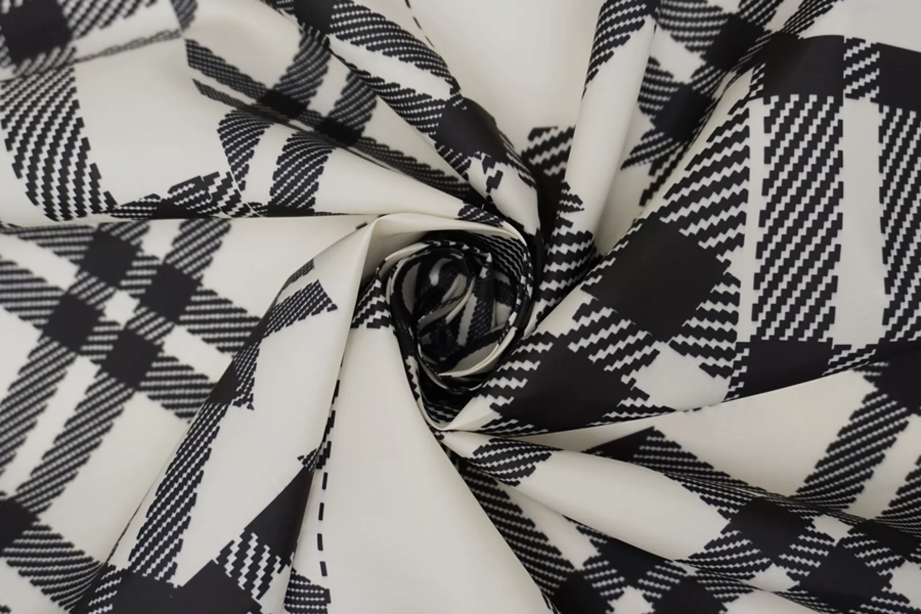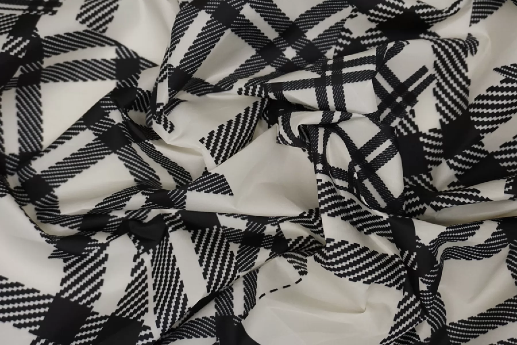 Плащевая ткань молочного и черного оттенка с принтом клетки в абстрактном пэчворке. Матовая, с легким лоском. Плотная, легкая, вода стекает и не впитывается ветрозащитная. Не тянется. Слегка заметен силуэт. Сминается, после чего остаются небольшие, слегка заметные следы "заломов". Отличный и необычный вариант для пошива куртки, плаща, пуховика (простегать с наполнителем и подкладкой).