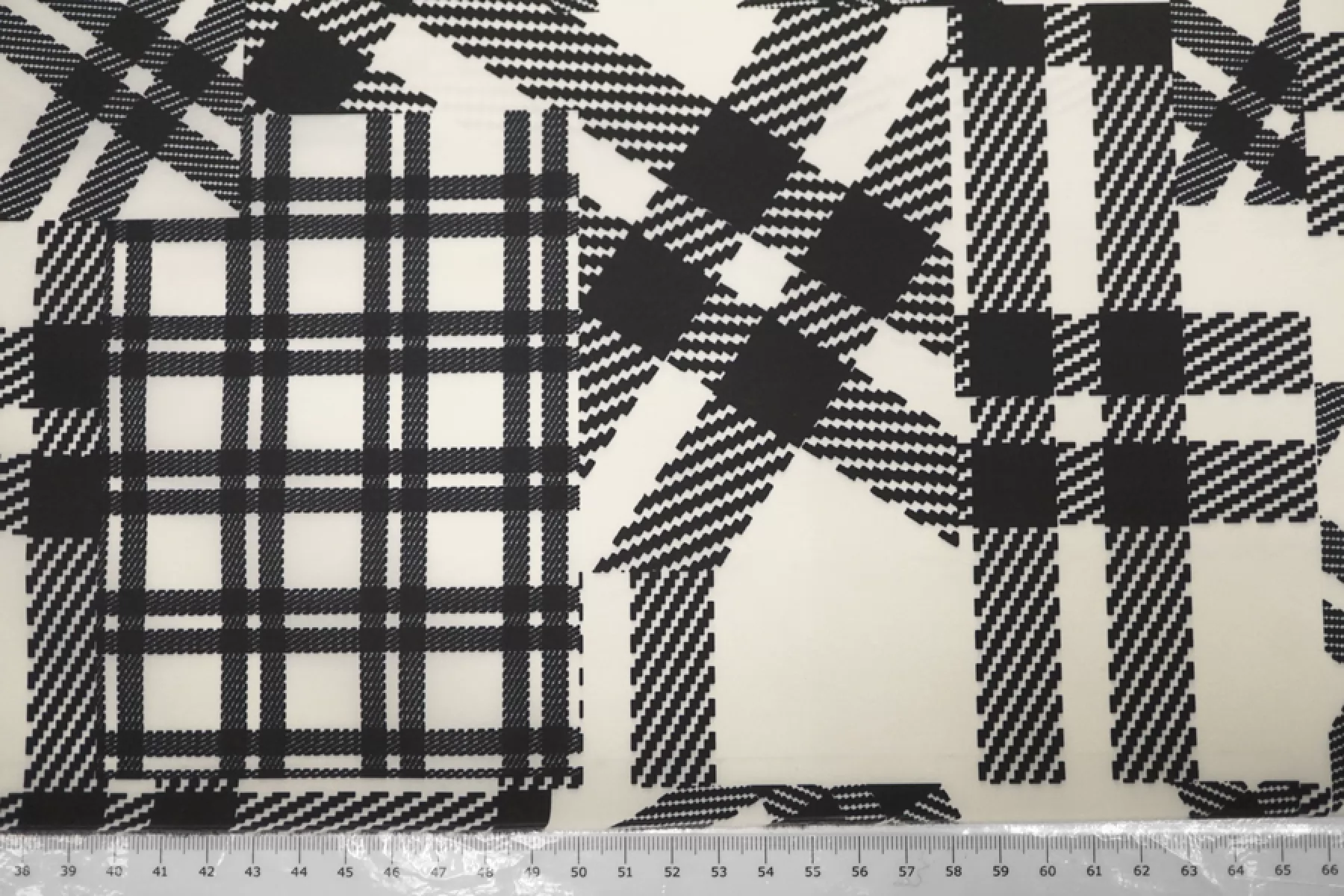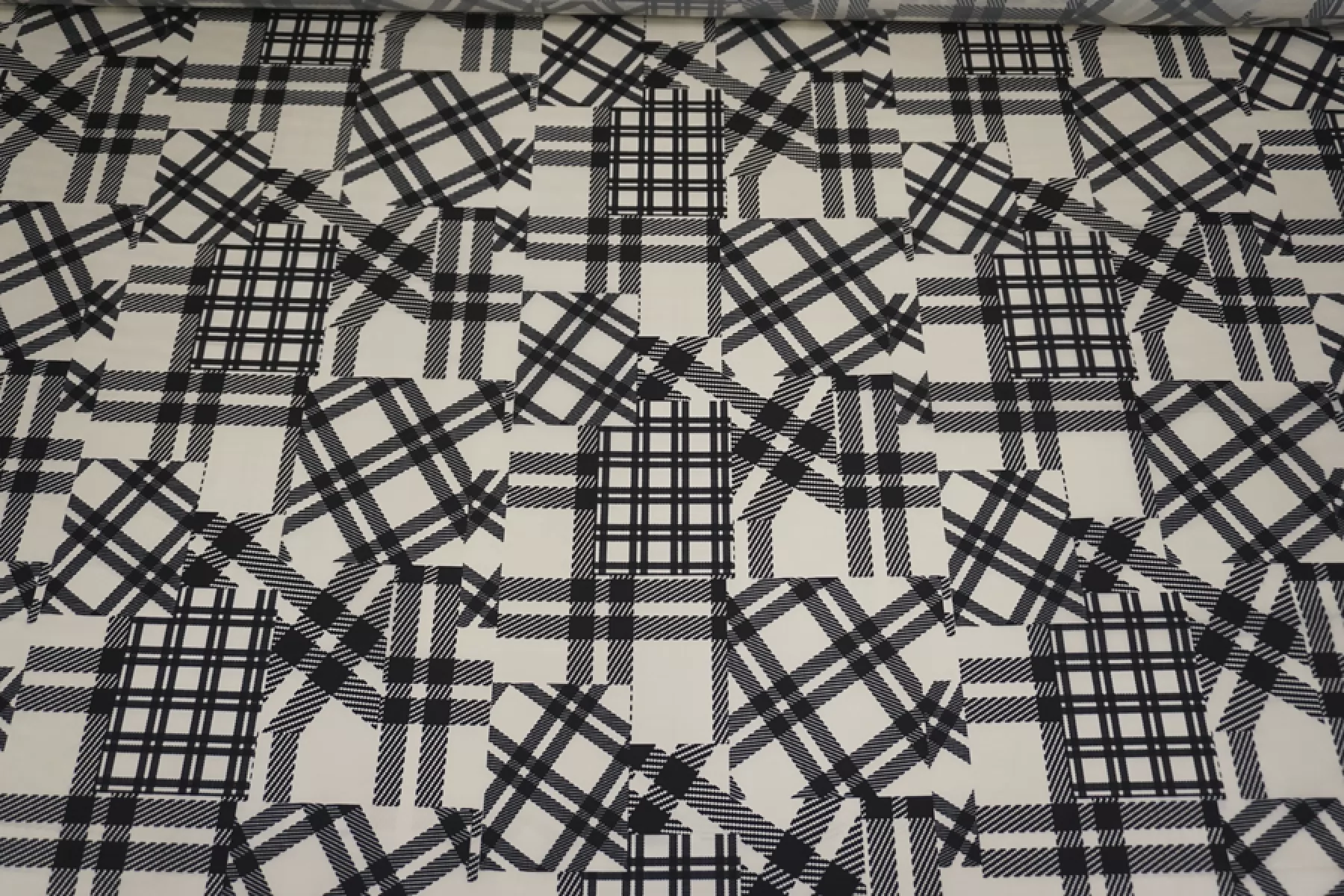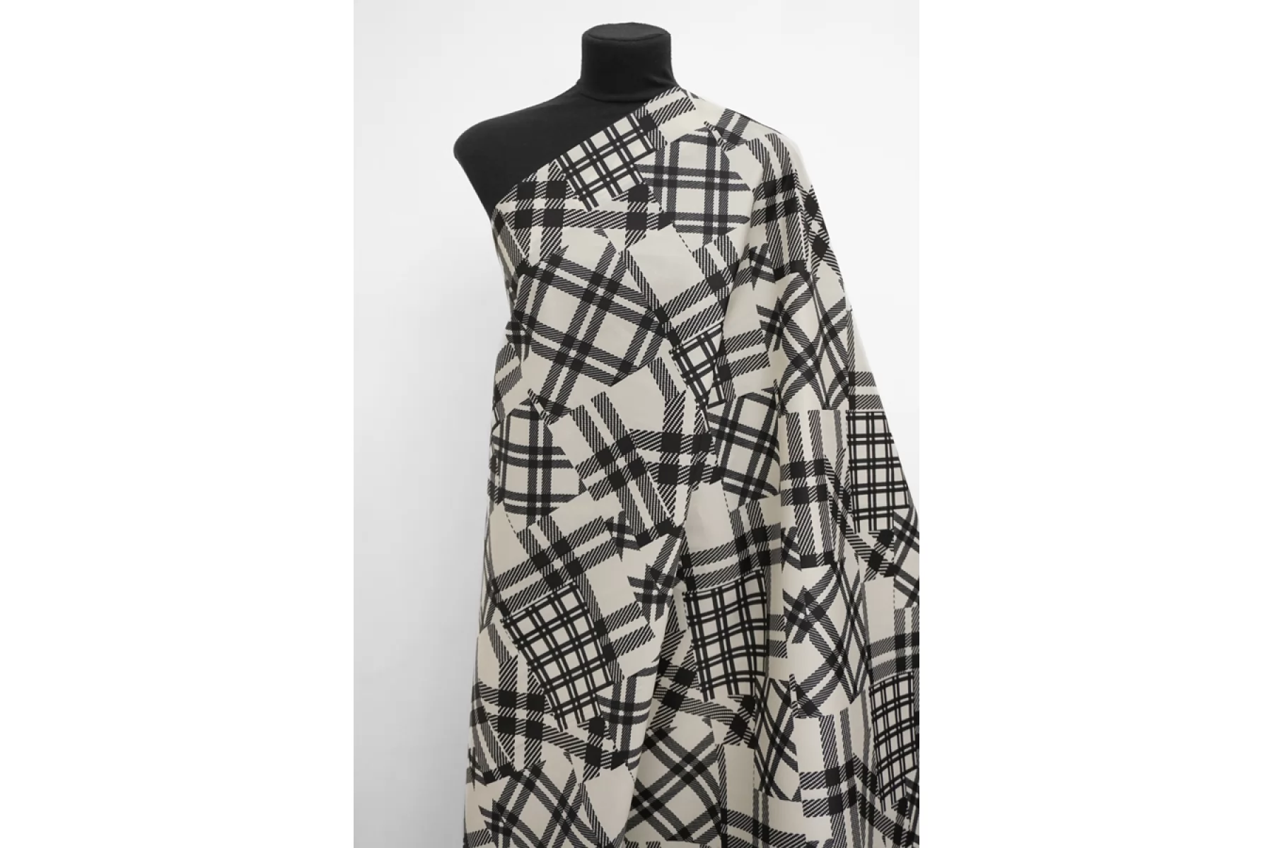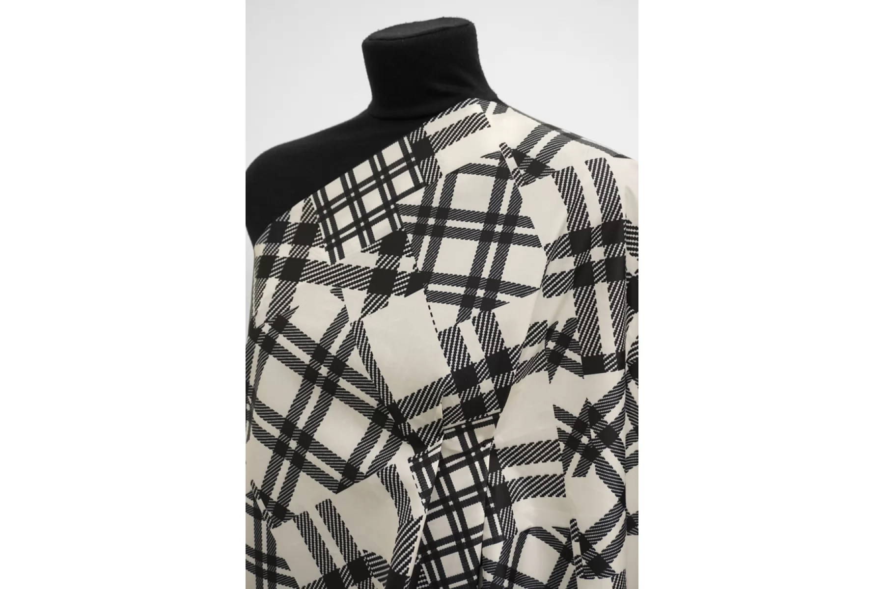 Плащевая ткань молочного и черного оттенка с принтом клетки в абстрактном пэчворке. Матовая, с легким лоском. Плотная, легкая, вода стекает и не впитывается ветрозащитная. Не тянется. Слегка заметен силуэт. Сминается, после чего остаются небольшие, слегка заметные следы "заломов". Отличный и необычный вариант для пошива куртки, плаща, пуховика (простегать с наполнителем и подкладкой).