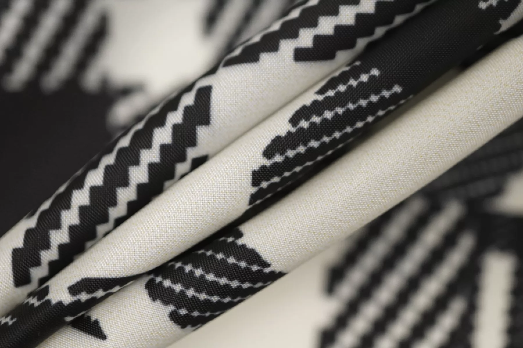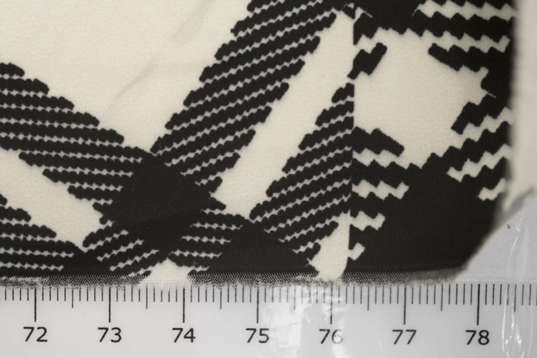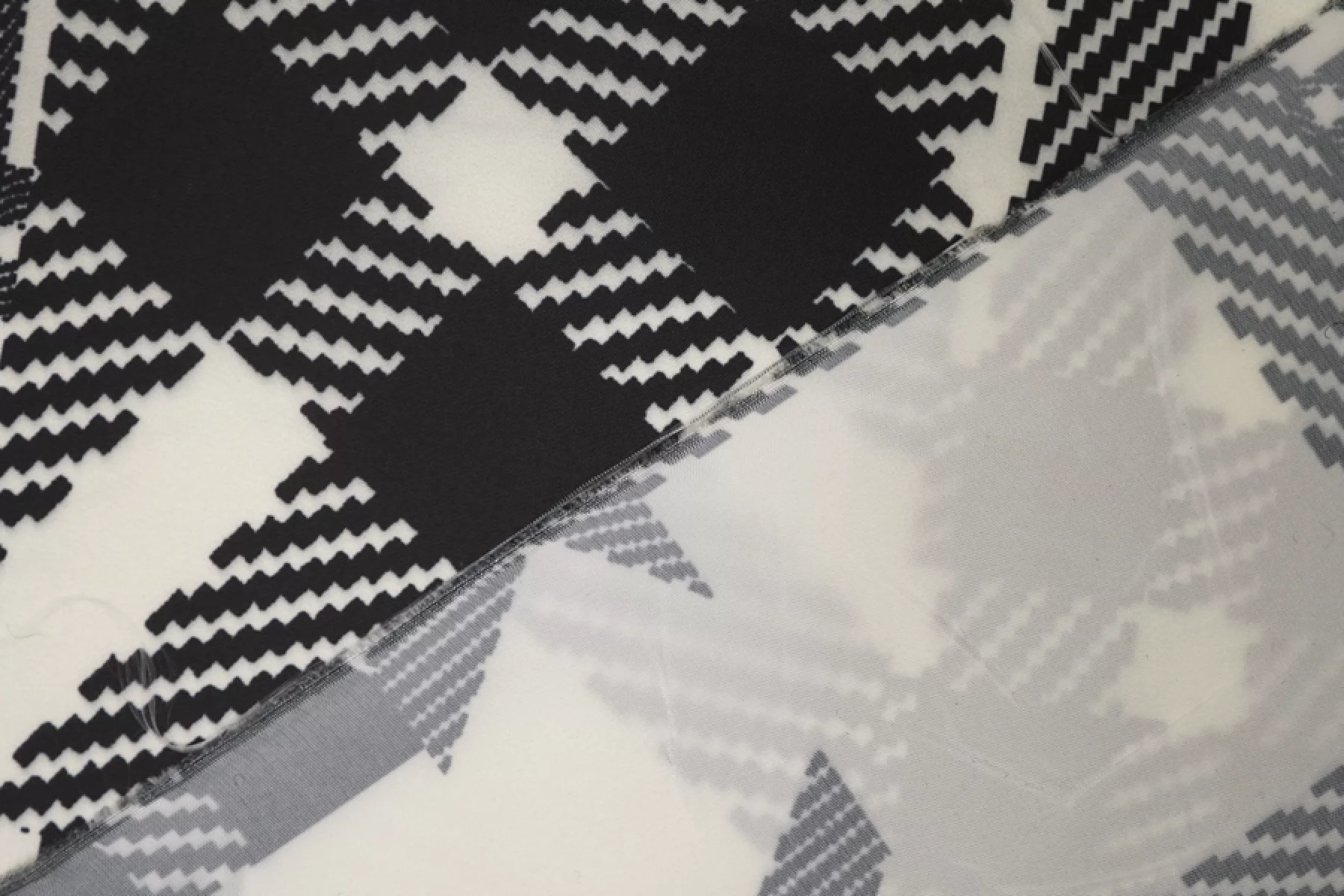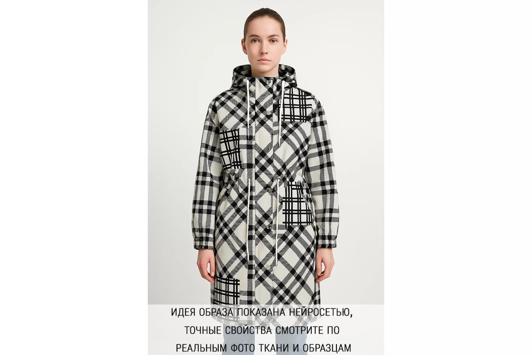 Плащевая ткань молочного и черного оттенка с принтом клетки в абстрактном пэчворке. Матовая, с легким лоском. Плотная, легкая, вода стекает и не впитывается ветрозащитная. Не тянется. Слегка заметен силуэт. Сминается, после чего остаются небольшие, слегка заметные следы "заломов". Отличный и необычный вариант для пошива куртки, плаща, пуховика (простегать с наполнителем и подкладкой).