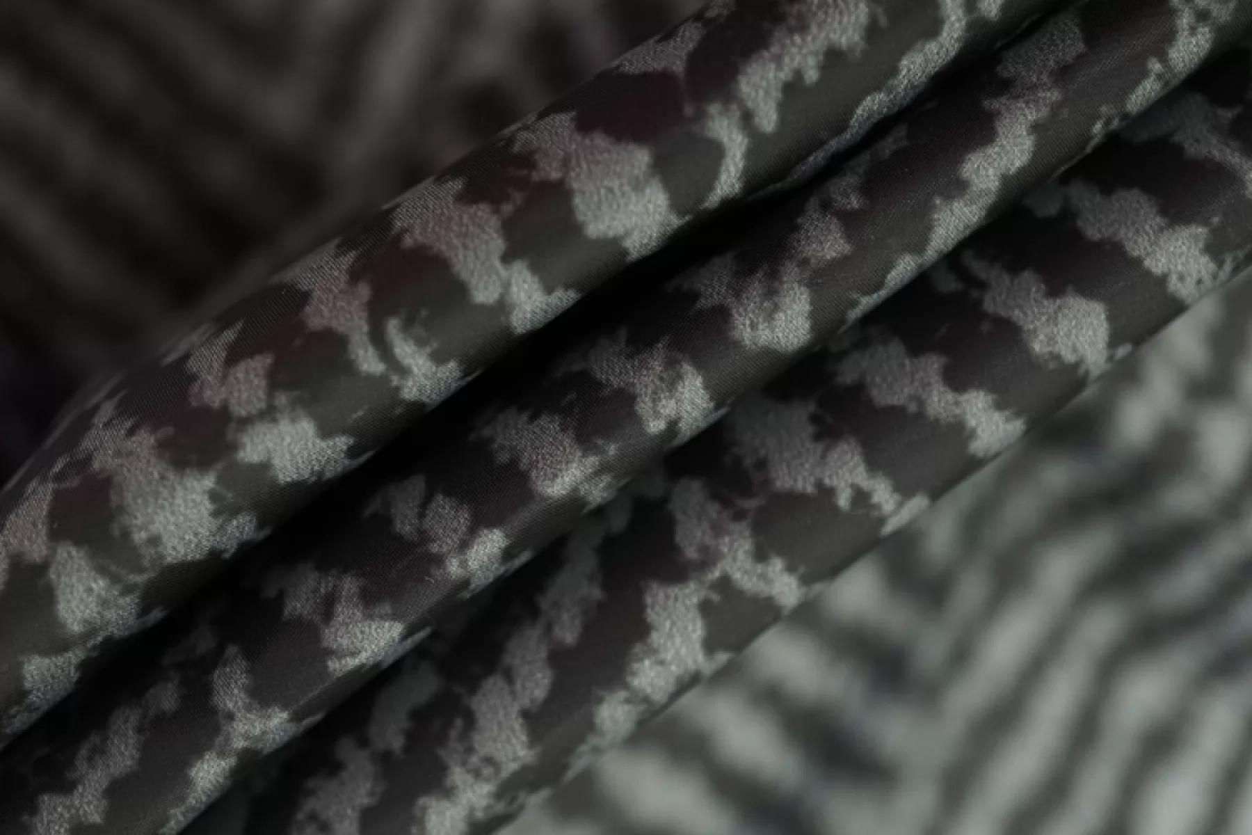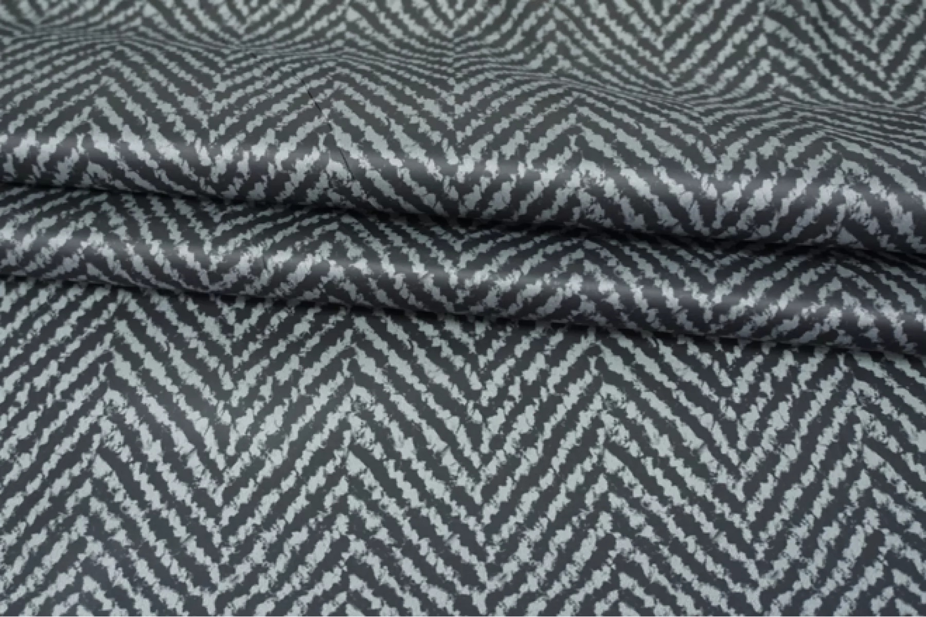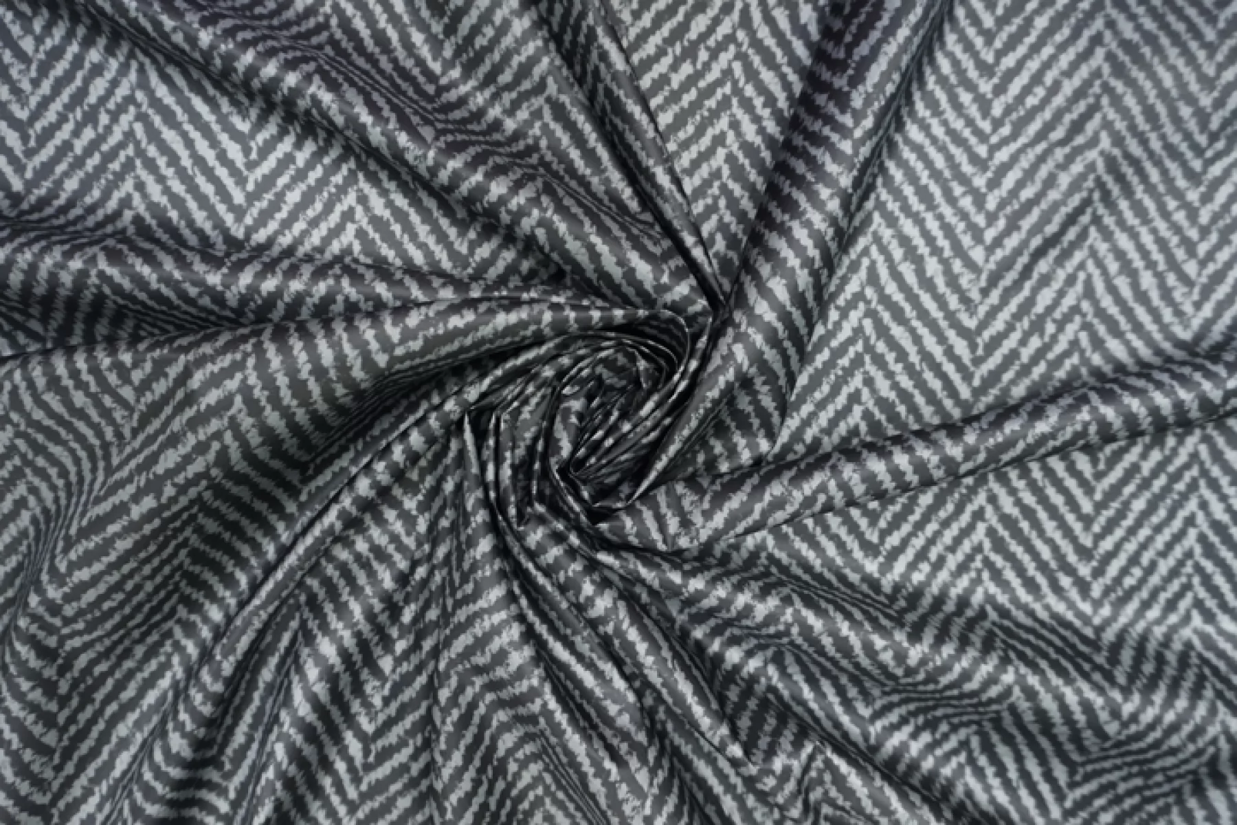 Плащевый плотный и тонкий нейлон с узором елочки крупного размера в оттенках серого и черного. Ткань с матовымлоском, гладкая, мягкая. Ветрозащитная, капли легко скатываются, через минут 20 вода начинает немного впитываться. Слегка сминается. На просвет заметен контур силуэта. Подойдет на жилеты, куртки и плащи (простегать с наполнителем и подкладкой).