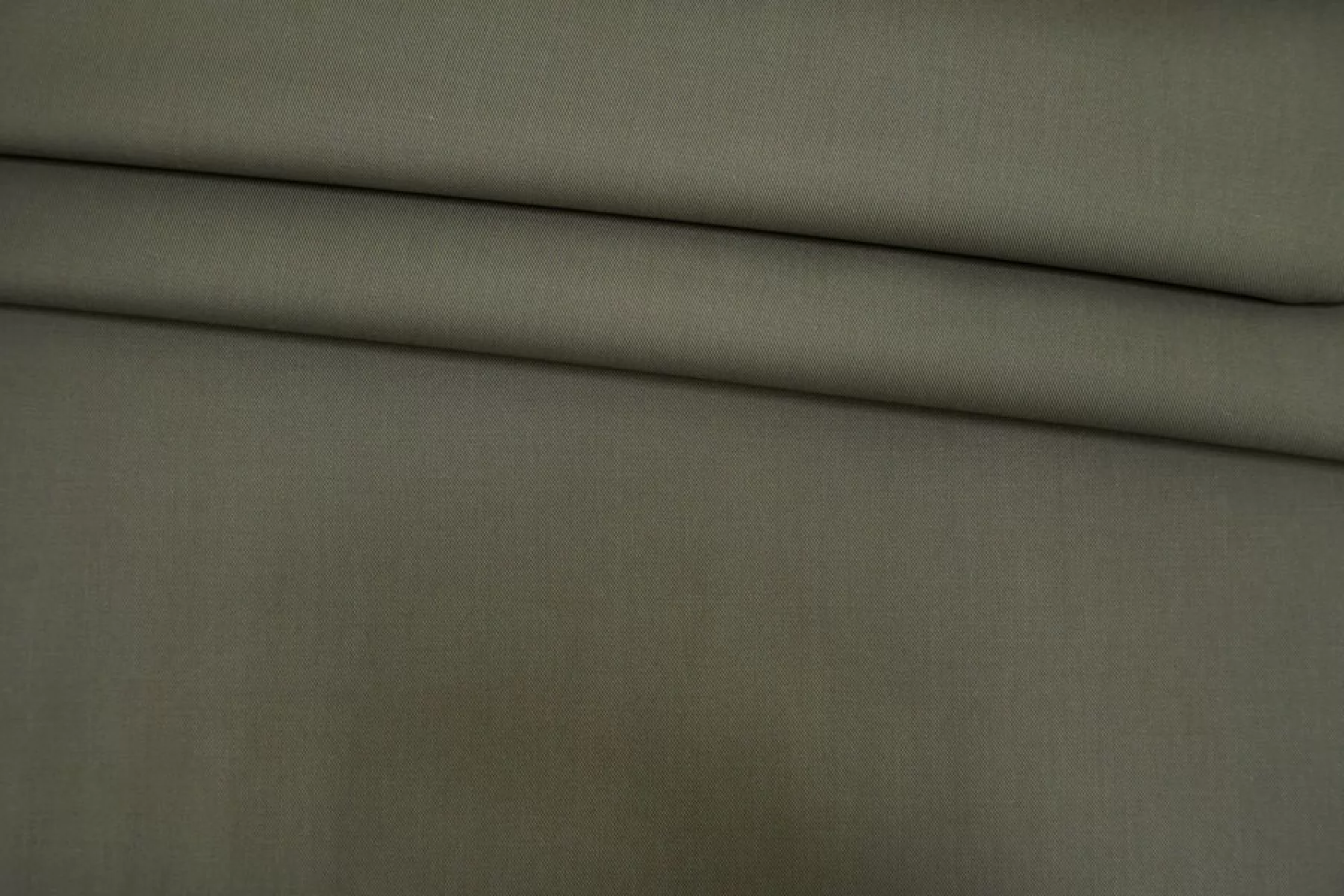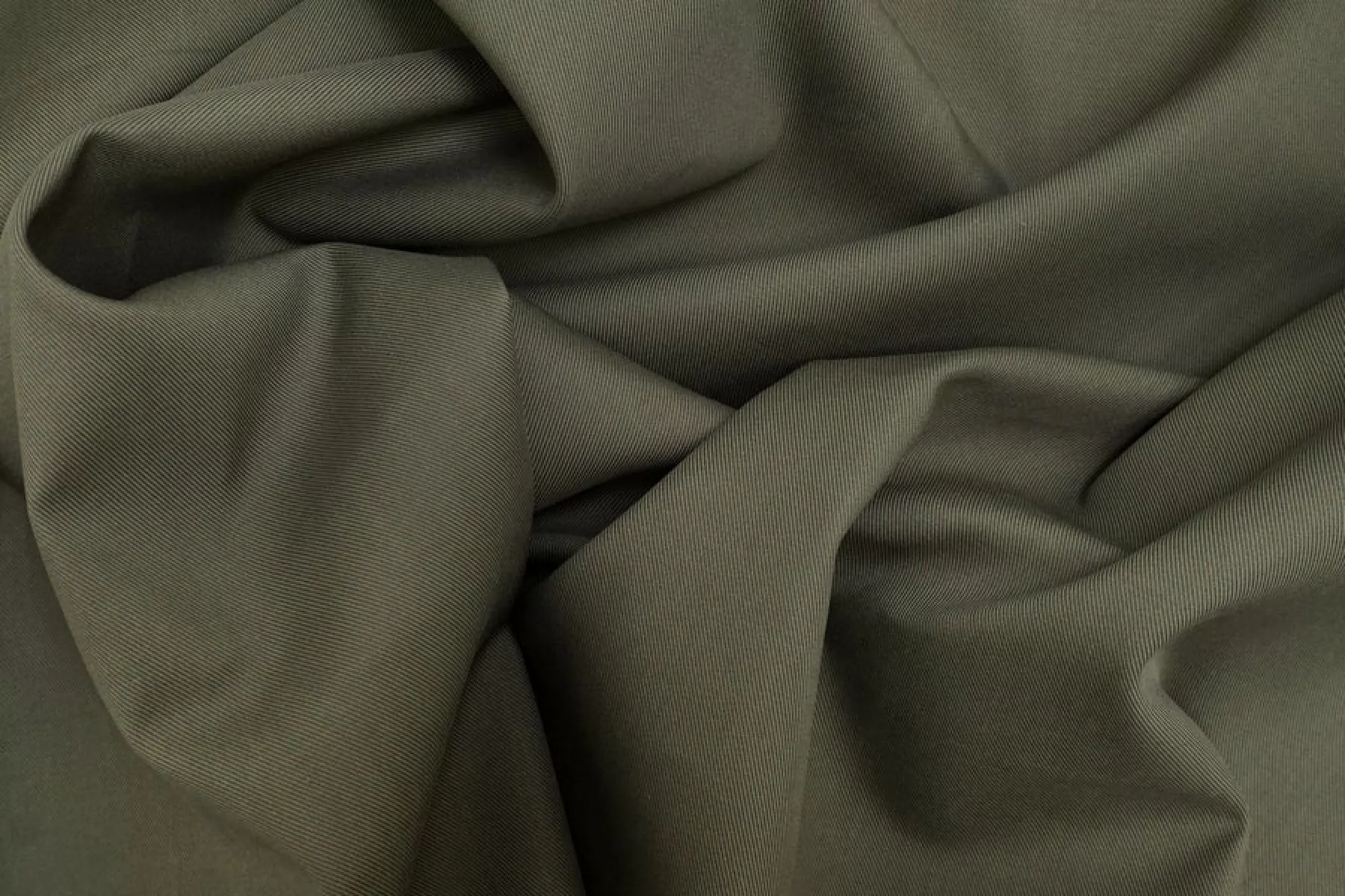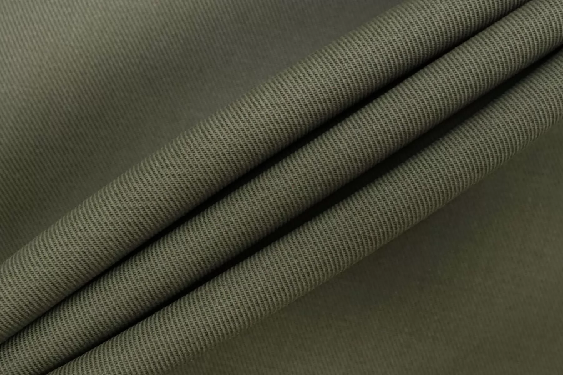 Итальянский плащевый хлопок от BURBERRY диагонального плетения в ненасыщенном, защитном зелёном оттенке. Вода легко стекает с поверхности, не впитывается. Под длительным воздействием воды может немного промокнуть. Тактильно приятный, мягкий. Хорошей плотности. Сминается. Держит форму, не тянется и не просвечивает. Прекрасен для пошива тренча, куртки, парки и плащей.