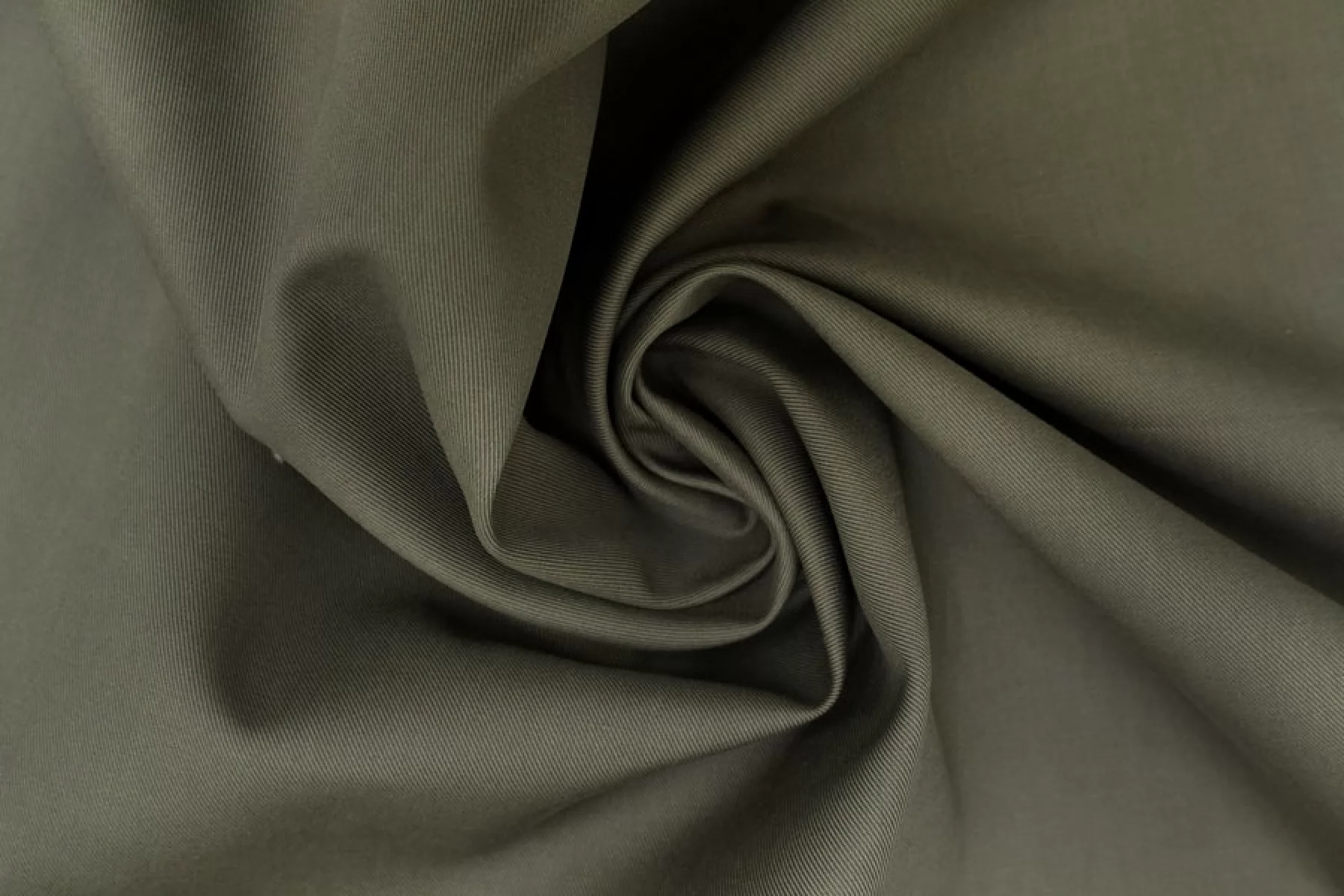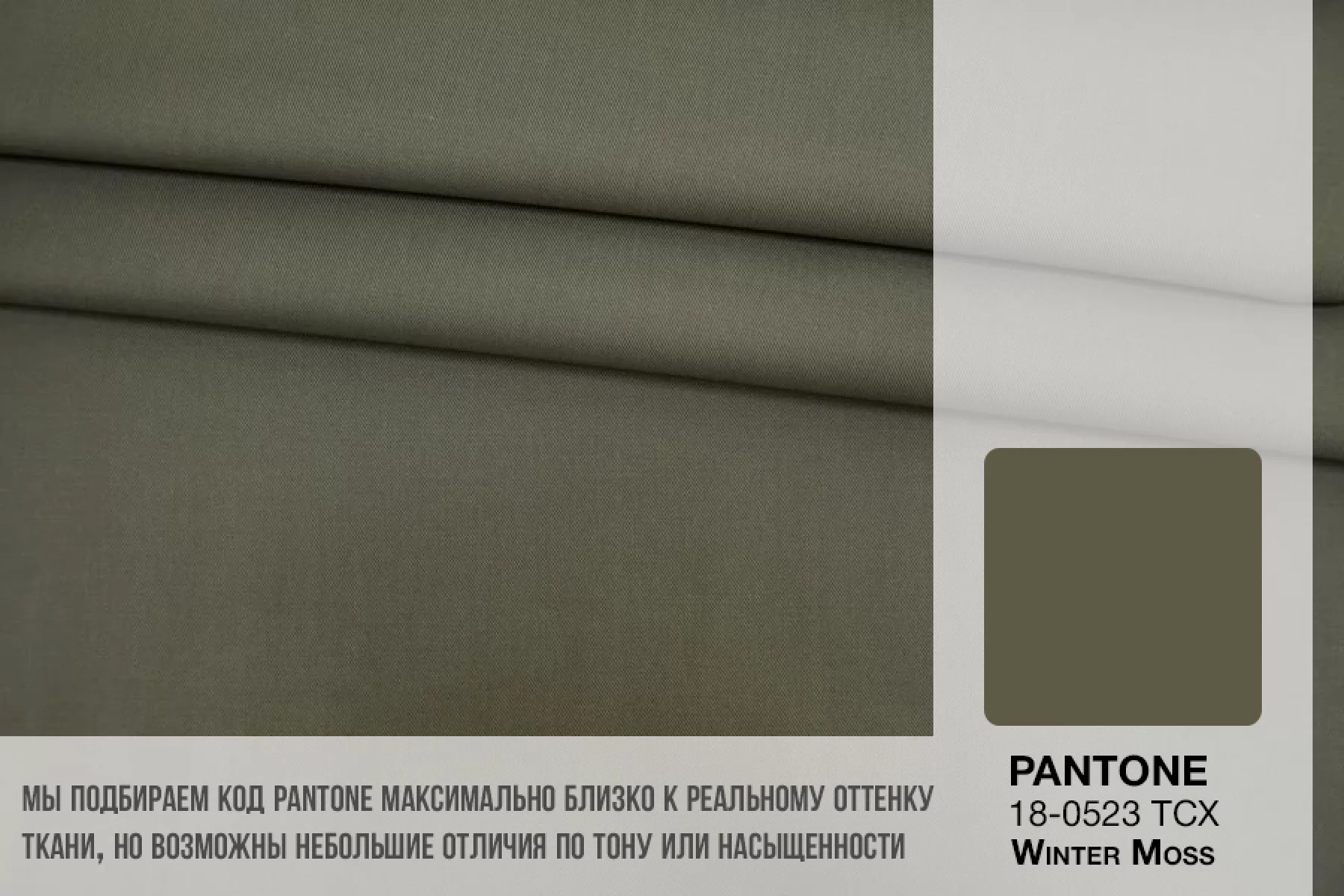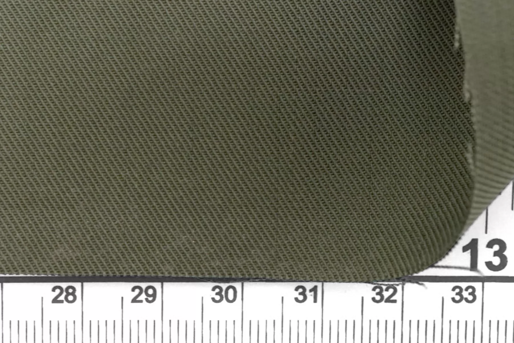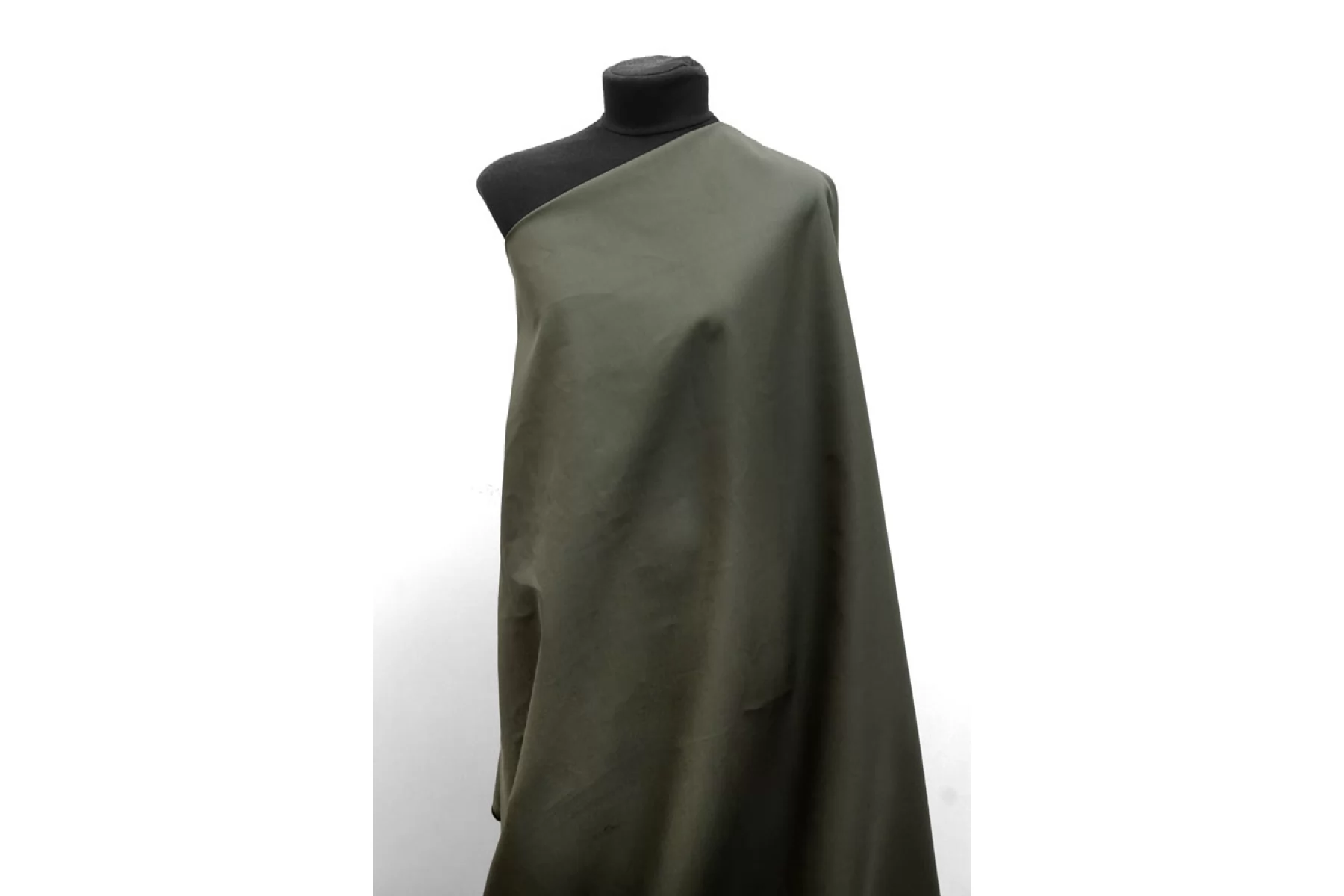 Итальянский плащевый хлопок от BURBERRY диагонального плетения в ненасыщенном, защитном зелёном оттенке. Вода легко стекает с поверхности, не впитывается. Под длительным воздействием воды может немного промокнуть. Тактильно приятный, мягкий. Хорошей плотности. Сминается. Держит форму, не тянется и не просвечивает. Прекрасен для пошива тренча, куртки, парки и плащей.