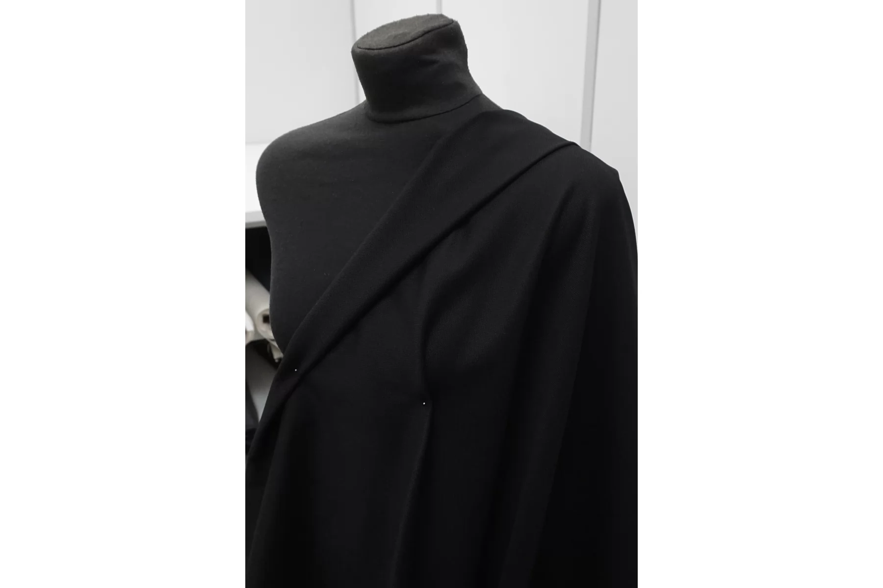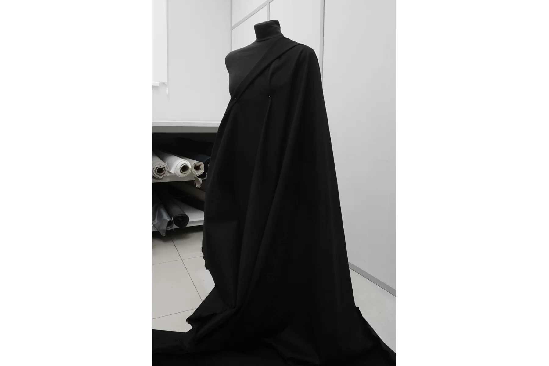 Чёрный фактурный хлопок от Burberry. Тактильно материал приятный, не грубый. Не просвечивает, немного тянется. Мнется средне, хорошо держит форму. При попадании воды намокает. Шьем формодержащие костюмы, куртки и юбки в джинсовом стиле, можно использовать для пошива парки, тренча (учитывайте, что материал сразу промокает).