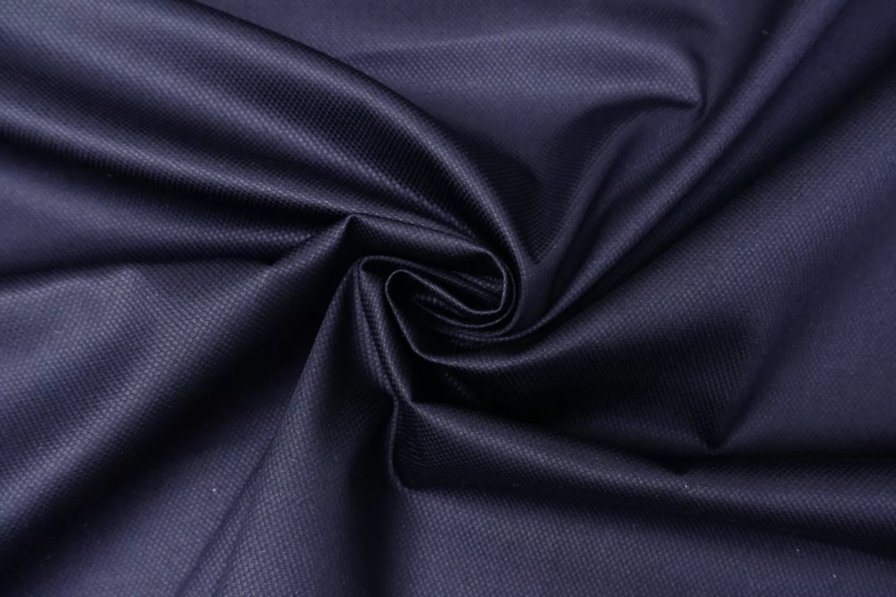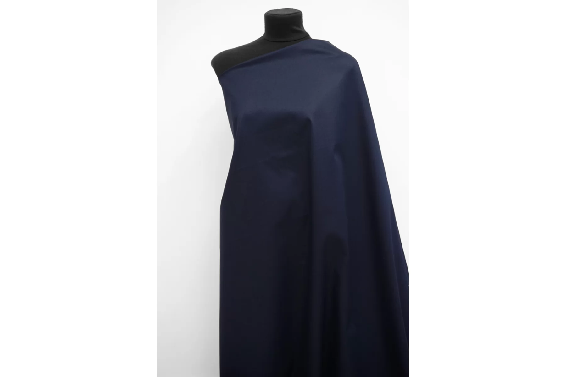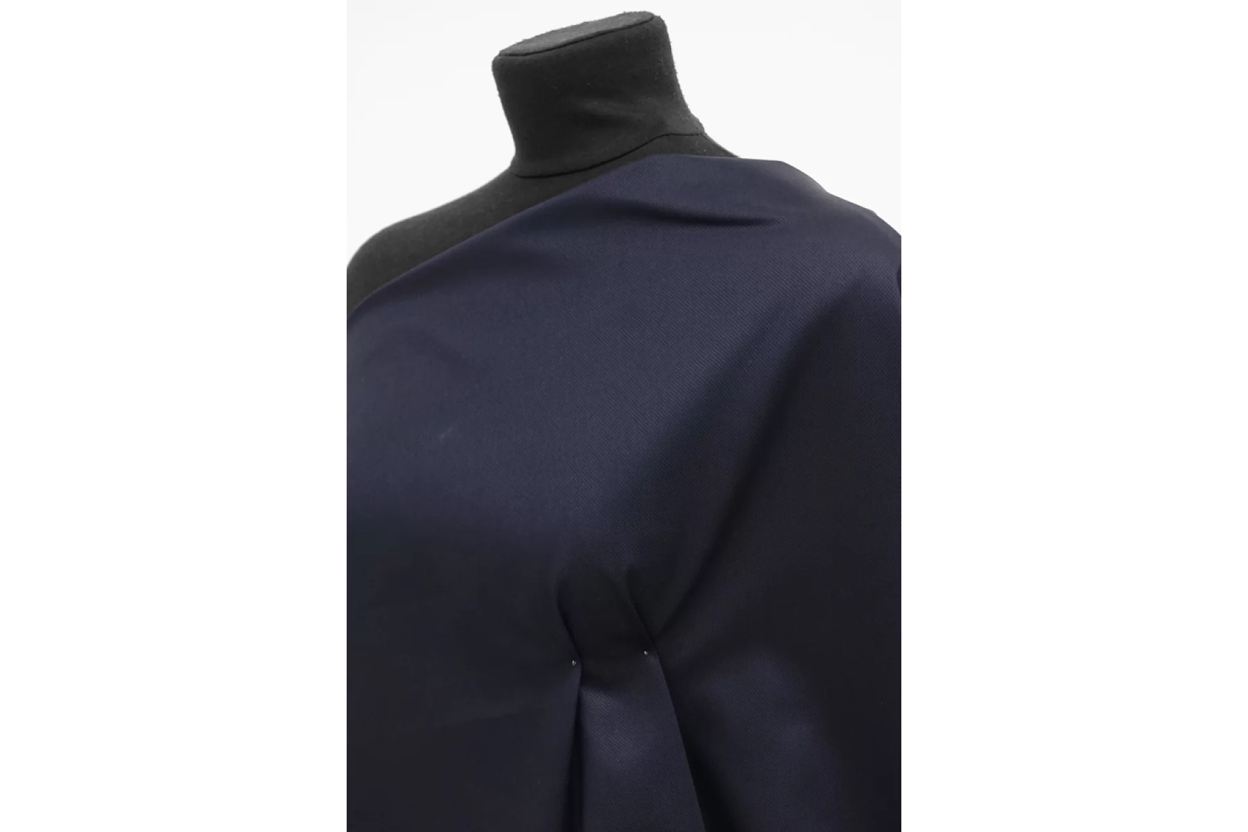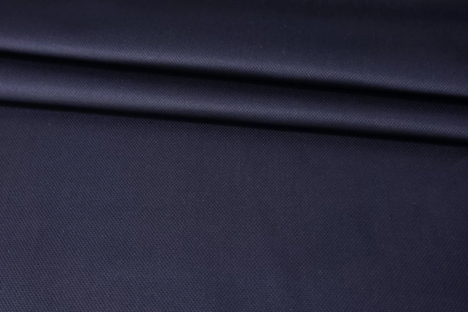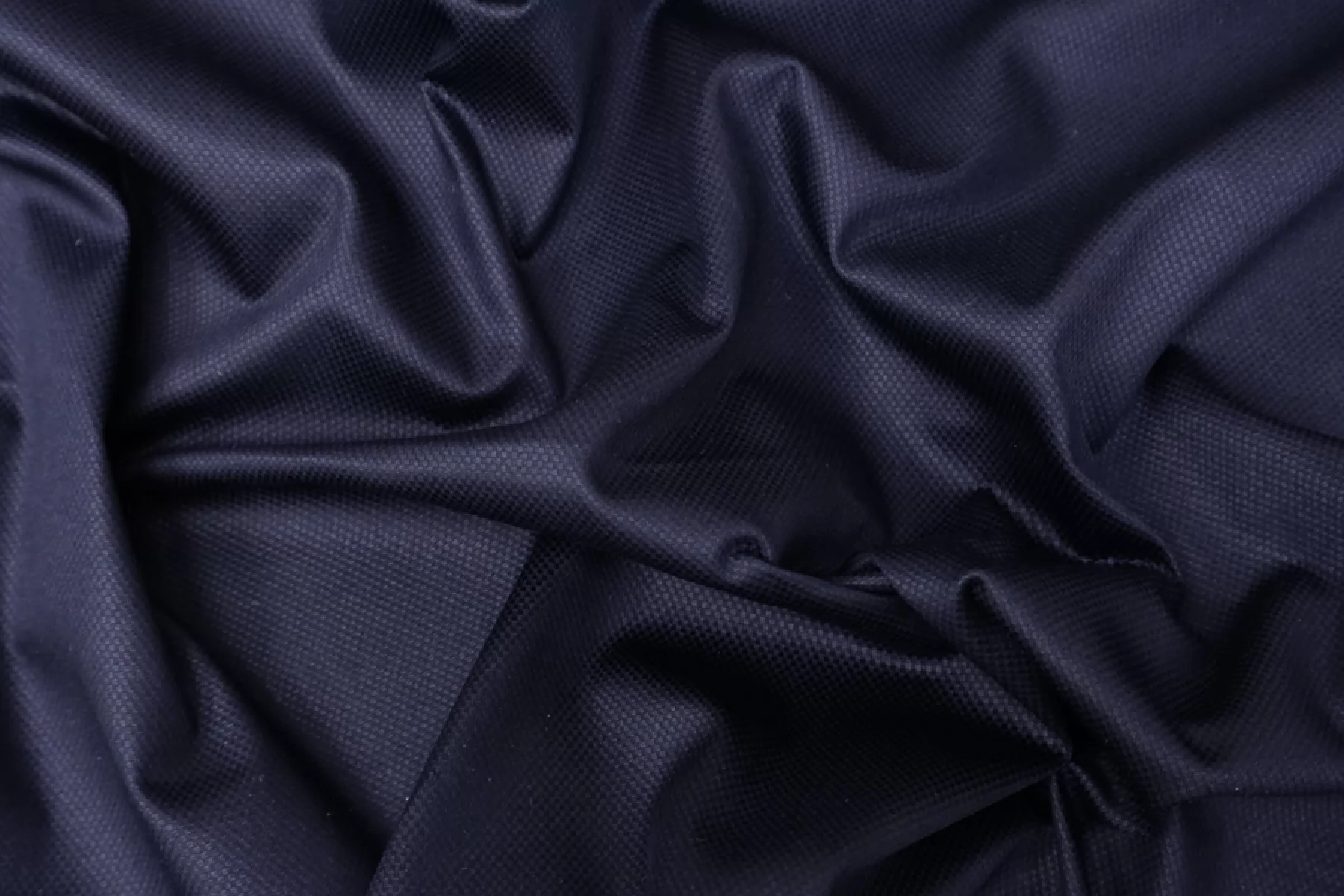 Итальянский фактурный плащевый хлопок от BURBERRY в темно-синем, водонепроницаемый. Вода легко стекает с поверхности, не впитывается. Плетение фактурное. Материал гладкий, приятный наощупь, чувствуется плетение, немного жестковатый. Достаточно пластичный, не тянется. Форму держит хороошо, сминается. Подойдет для пошива тренча, куртки, парки, плаща и т.д.