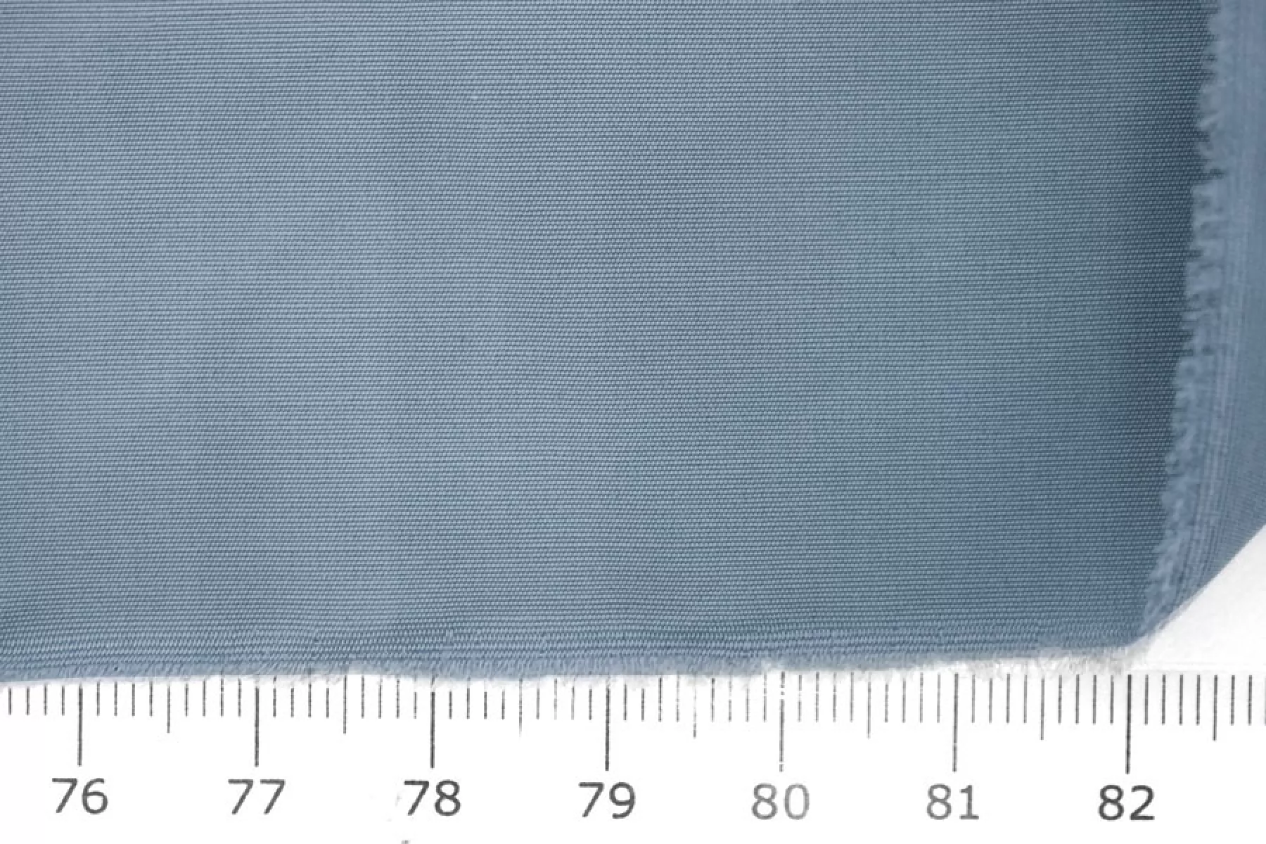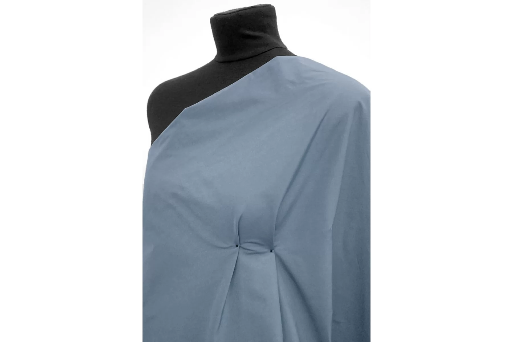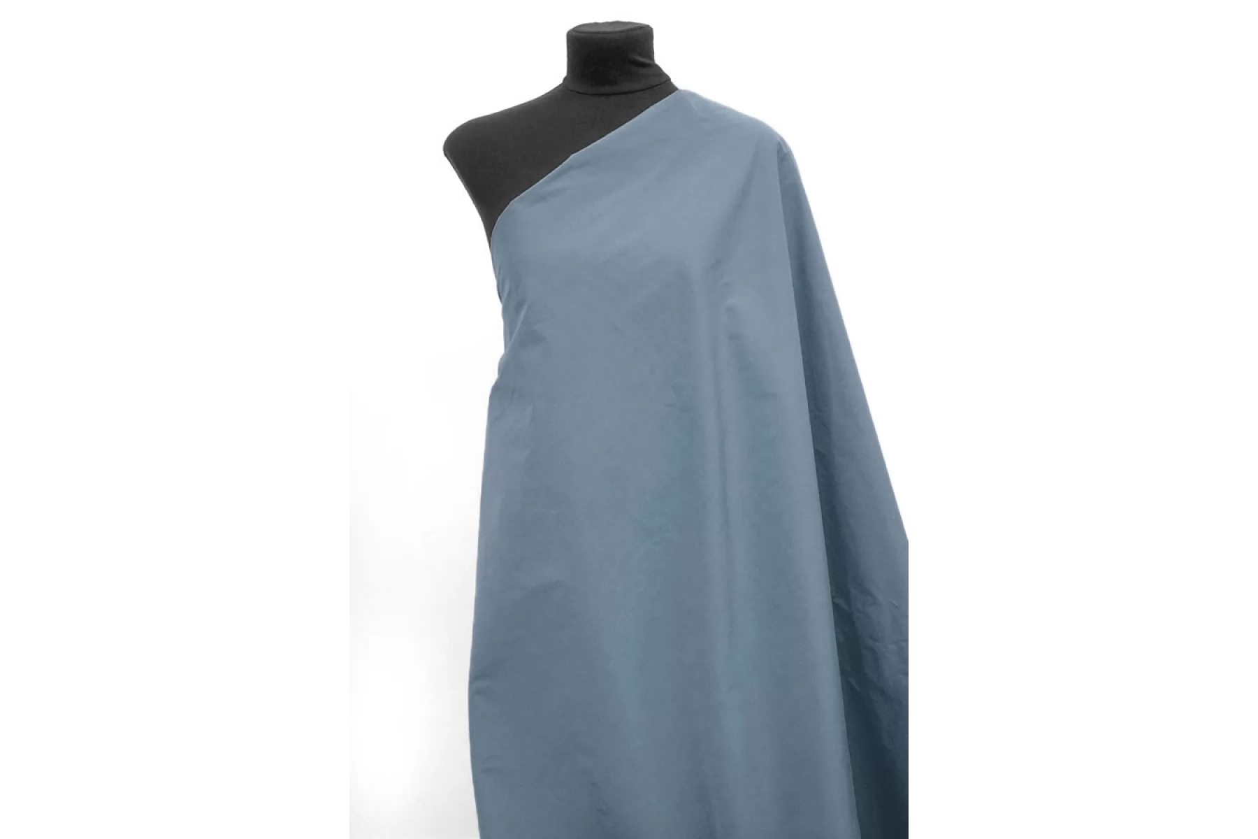 Плащевый водоотталкивающий хлопок мелкого репсового плетения в слегка приглушенном голубом оттенке. Тактильно приятный, мягкий, шуршащий, немного напоминает тафту. Капли не держит, но достаточно быстро впитывает в поверхность материала. Сминается, частично восстанавливается. Обладает приятным лоском. Не просвечивает. Хорошо драпируется и держит форму. Вариант на плащи, тренчи, жакеты, бомберы, куртки и не только.
