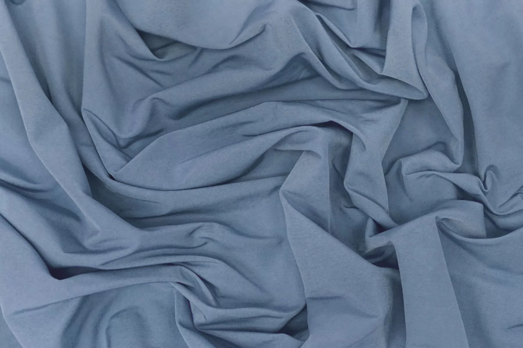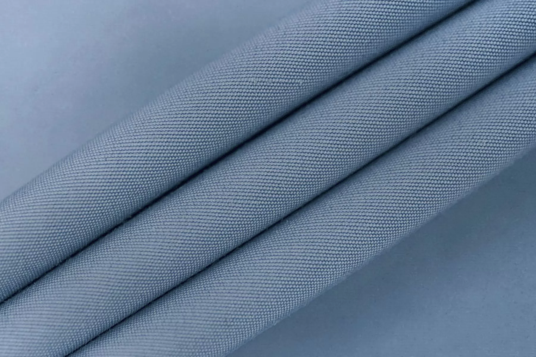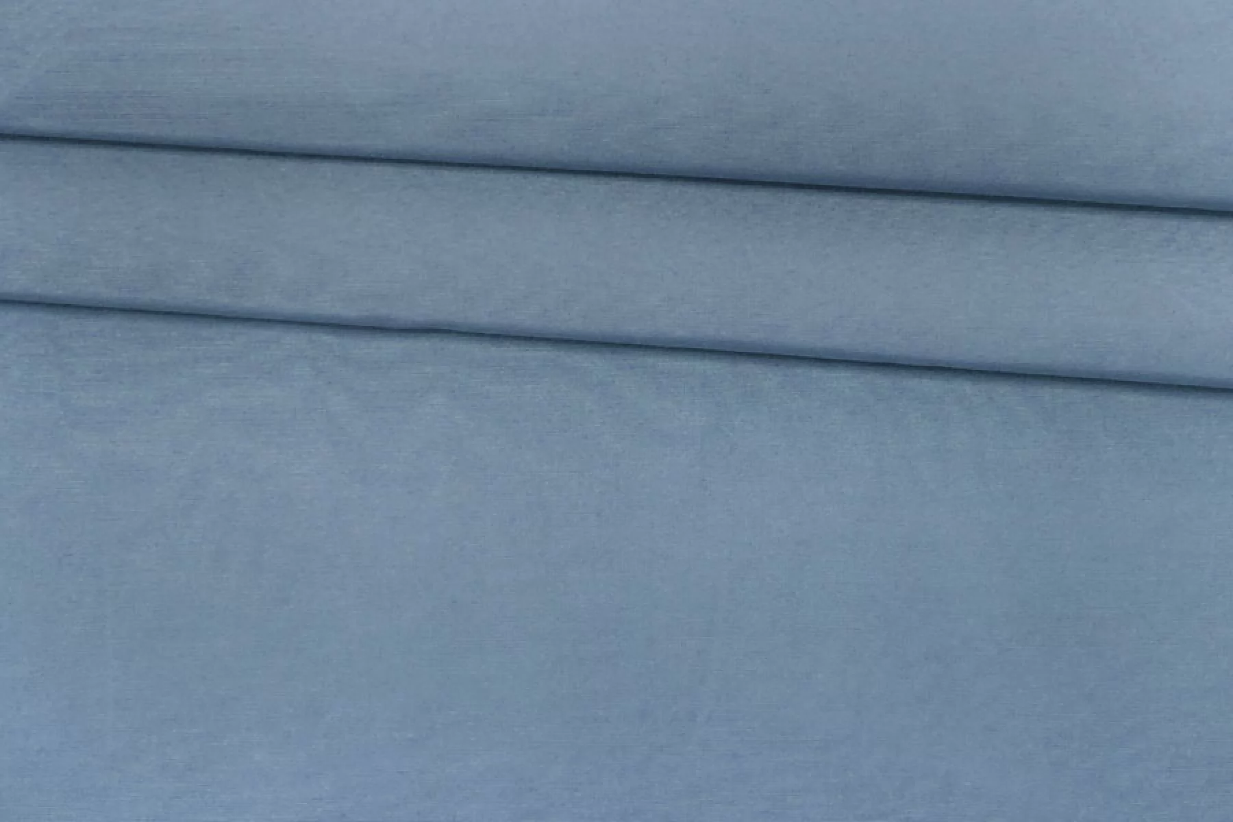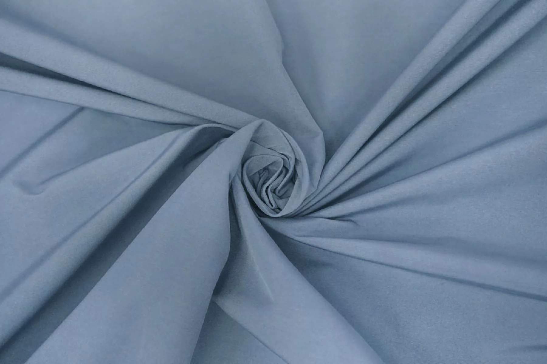 Плащевый водоотталкивающий хлопок мелкого репсового плетения в слегка приглушенном голубом оттенке. Тактильно приятный, мягкий, шуршащий, немного напоминает тафту. Капли не держит, но достаточно быстро впитывает в поверхность материала. Сминается, частично восстанавливается. Обладает приятным лоском. Не просвечивает. Хорошо драпируется и держит форму. Вариант на плащи, тренчи, жакеты, бомберы, куртки и не только.