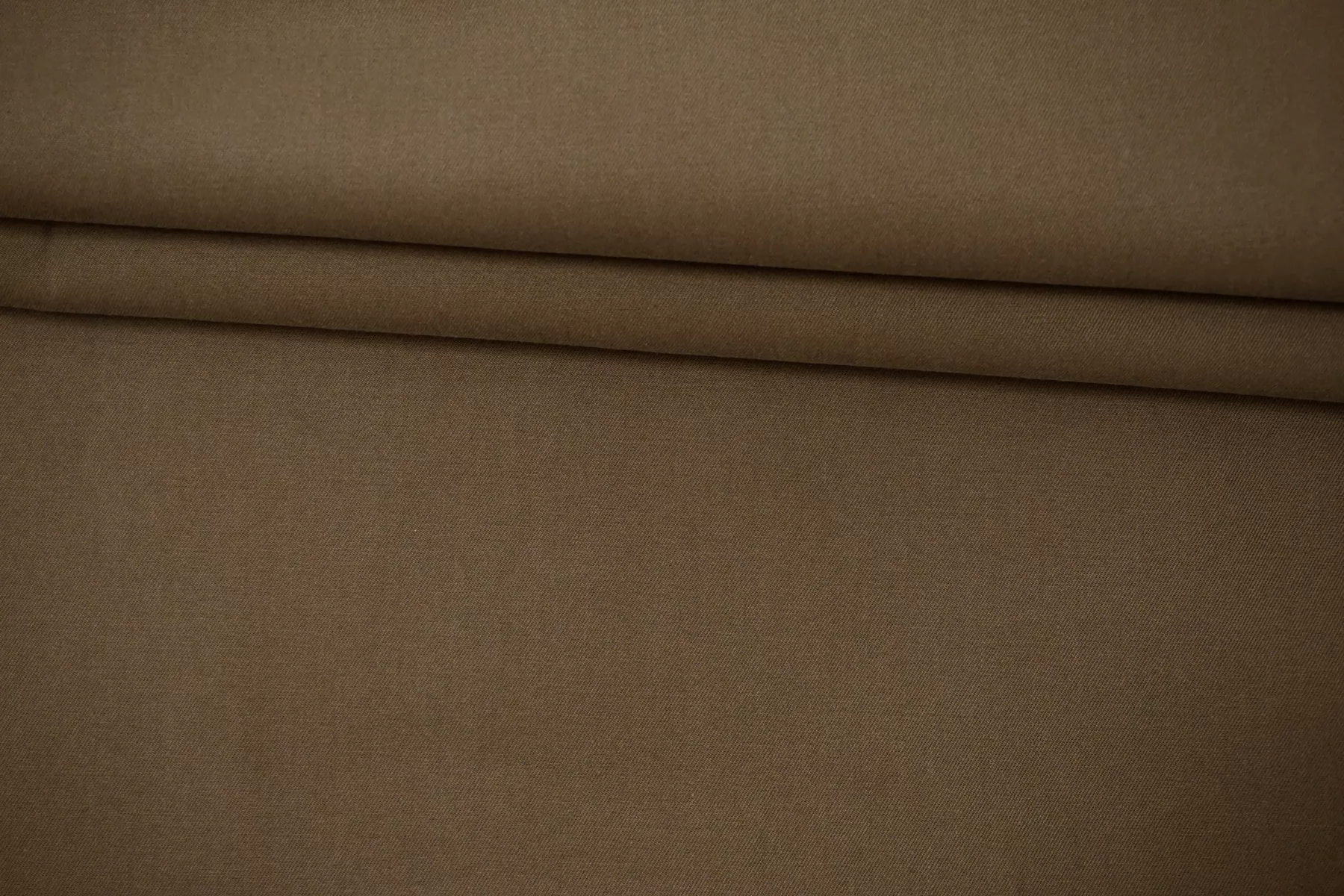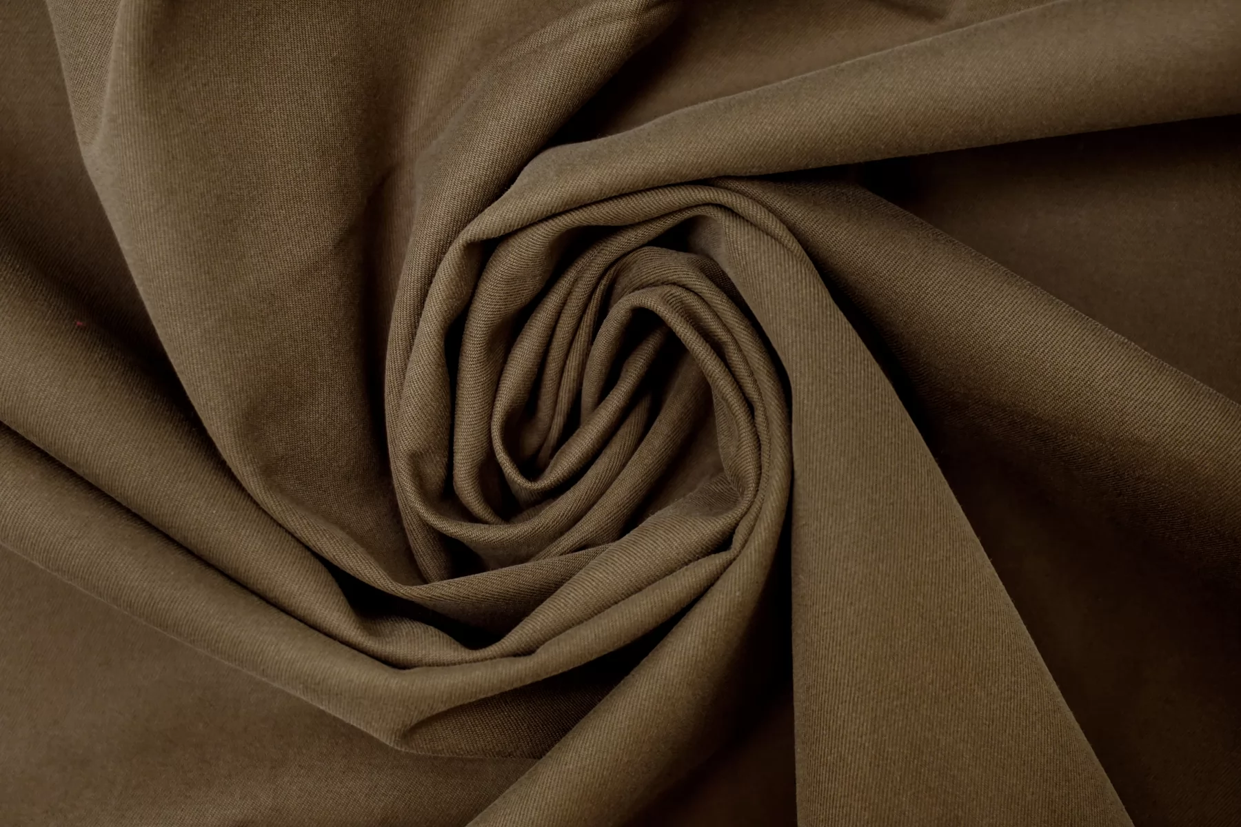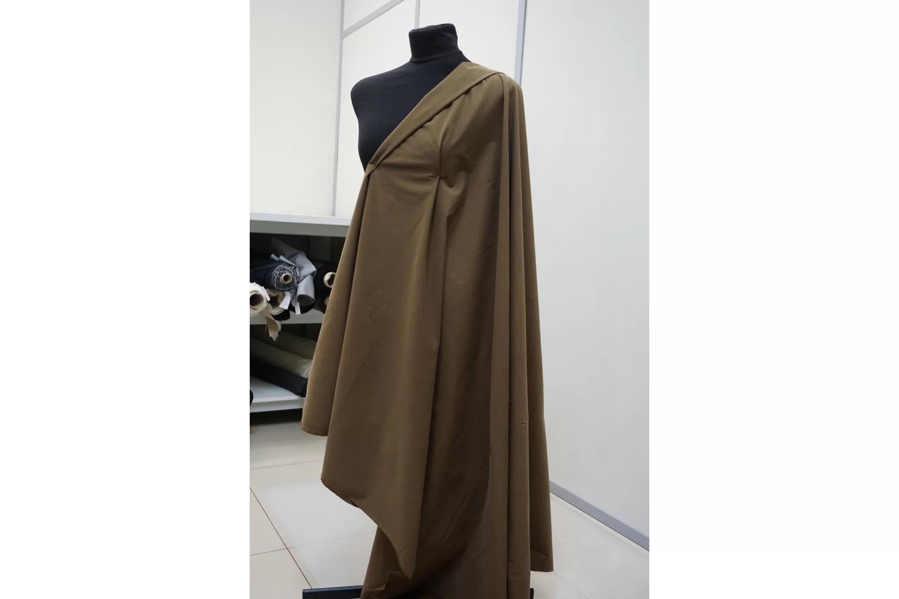 Прекрасный плащевый хлопок, водоотталкивающий (вода впитывается только спустя некоторое время) в коричневом цвете. С эффектом peach touch, бархатистый и мягкий наощупь как шкурка персика. Плетение диагональное. Вода легко стекает с поверхности. Плотный. Пластичный, но при этом держит форму, не тянется. Подойдет для пошива тренча, куртки, парки, плаща и т.д.