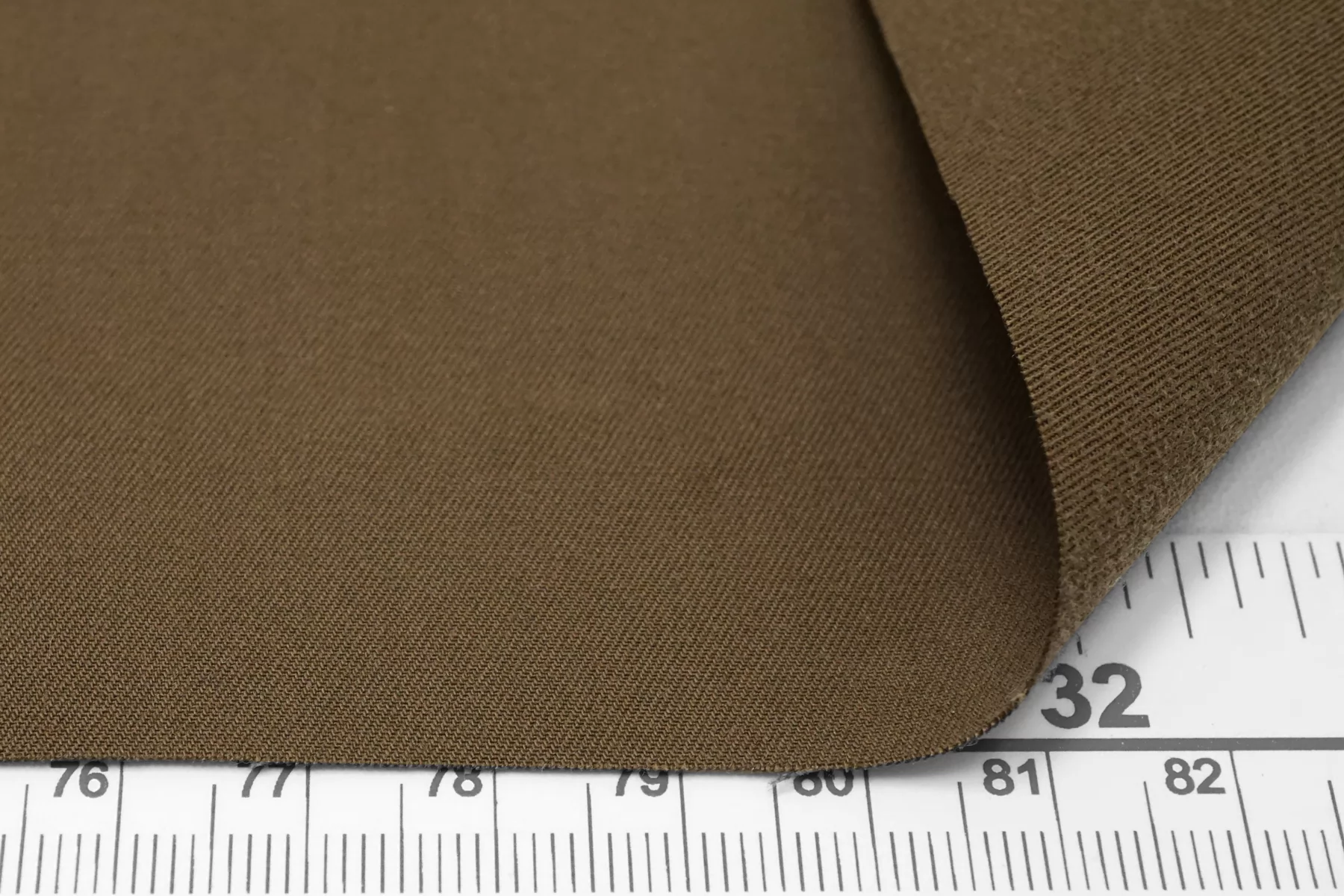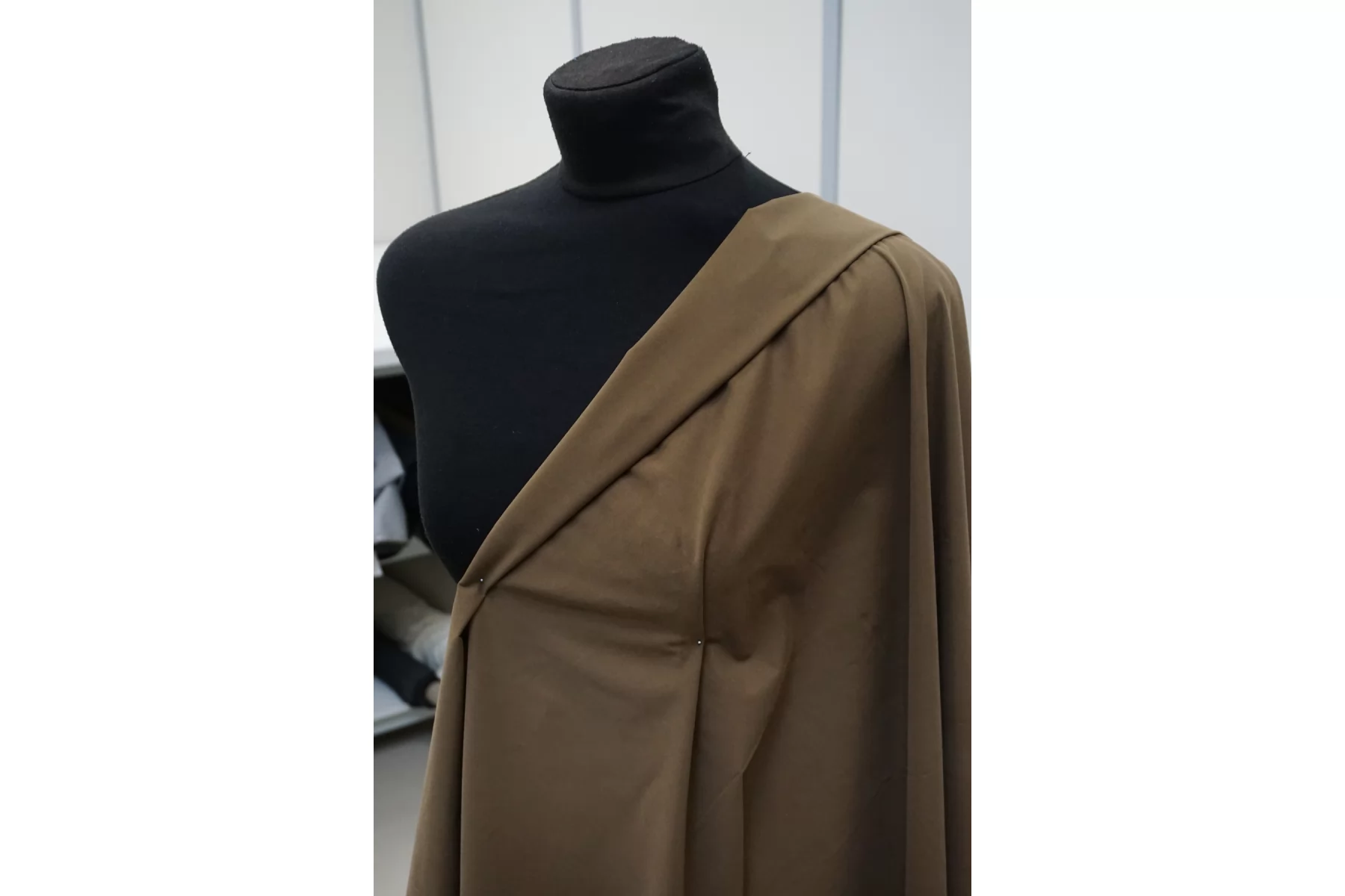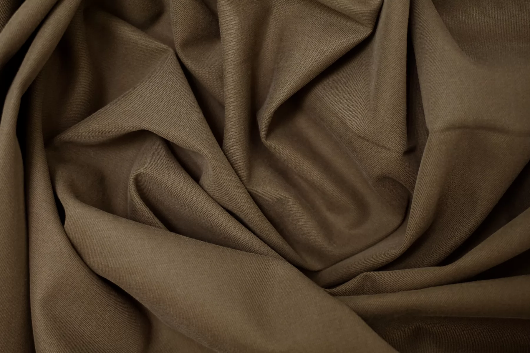 Прекрасный плащевый хлопок, водоотталкивающий (вода впитывается только спустя некоторое время) в коричневом цвете. С эффектом peach touch, бархатистый и мягкий наощупь как шкурка персика. Плетение диагональное. Вода легко стекает с поверхности. Плотный. Пластичный, но при этом держит форму, не тянется. Подойдет для пошива тренча, куртки, парки, плаща и т.д.