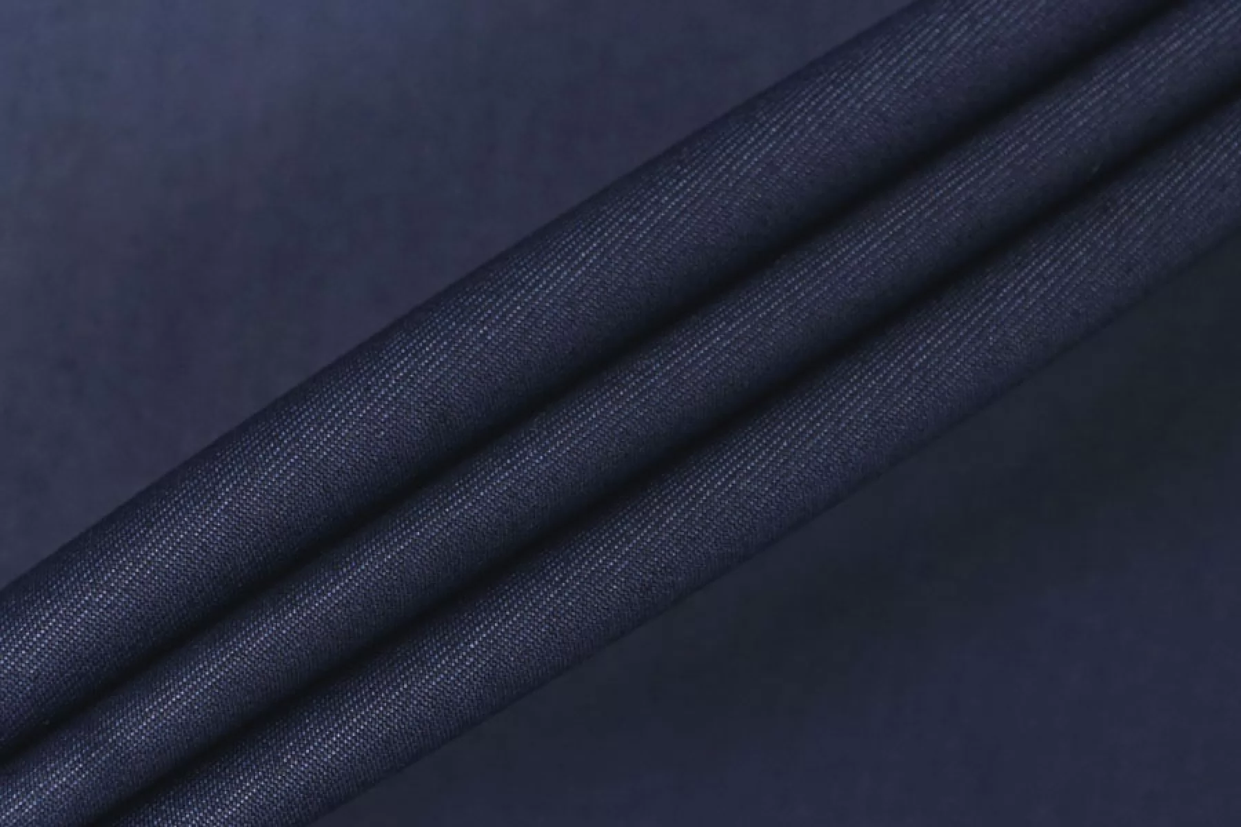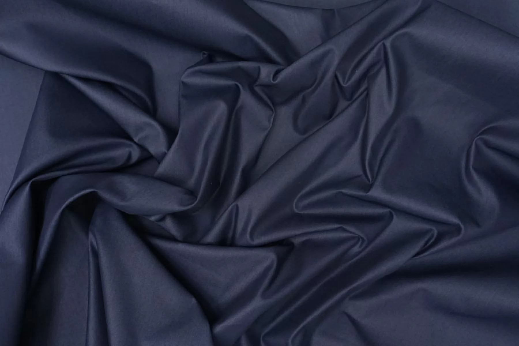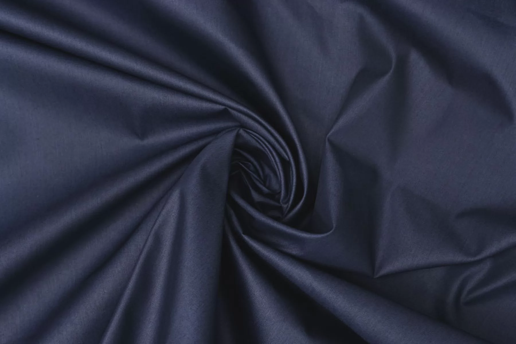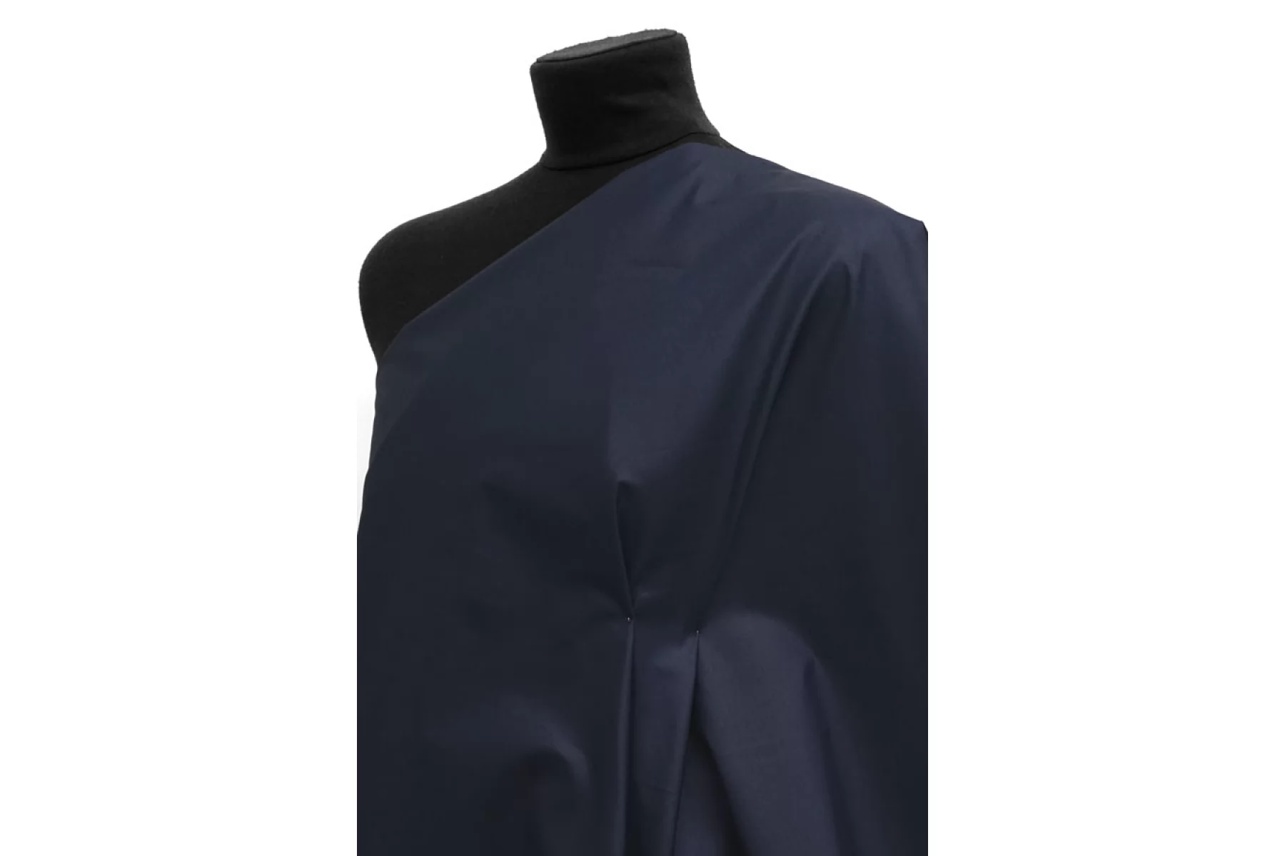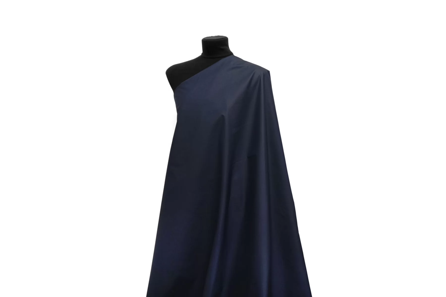 Итальянский плащевый хлопок от BURBERRY в припыленном темно-синем оттенке, водоотталкивающий. Вода легко стекает с поверхности, но через какое-то время впитывается. Плетение диагональное мелкое. Материал приятный и шуршащий наощупь. Тонкий. С красивым лоском, не тянется. Формодержащий, сминается. Подойдет для пошива тренча, куртки, парки, плаща и т.д.