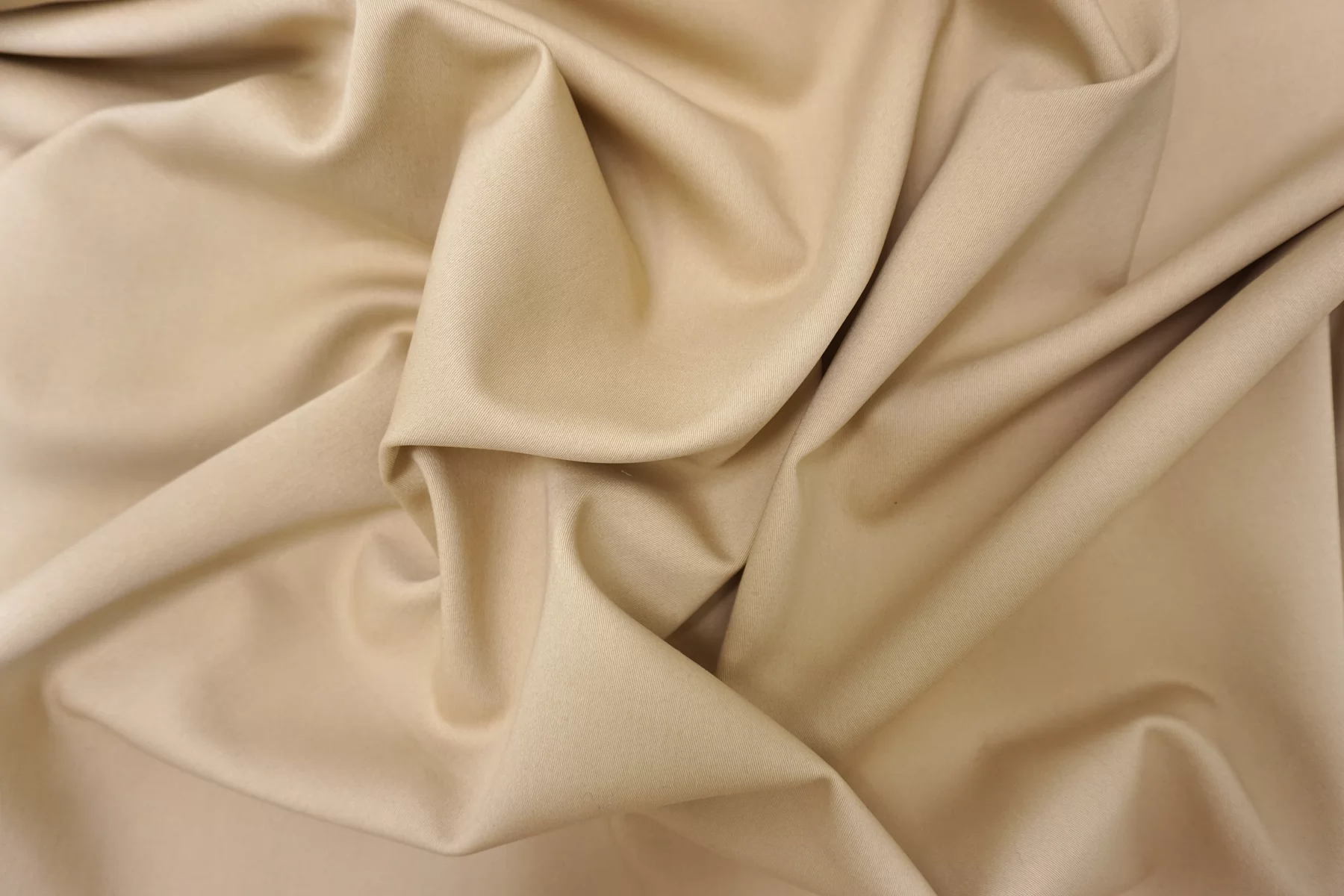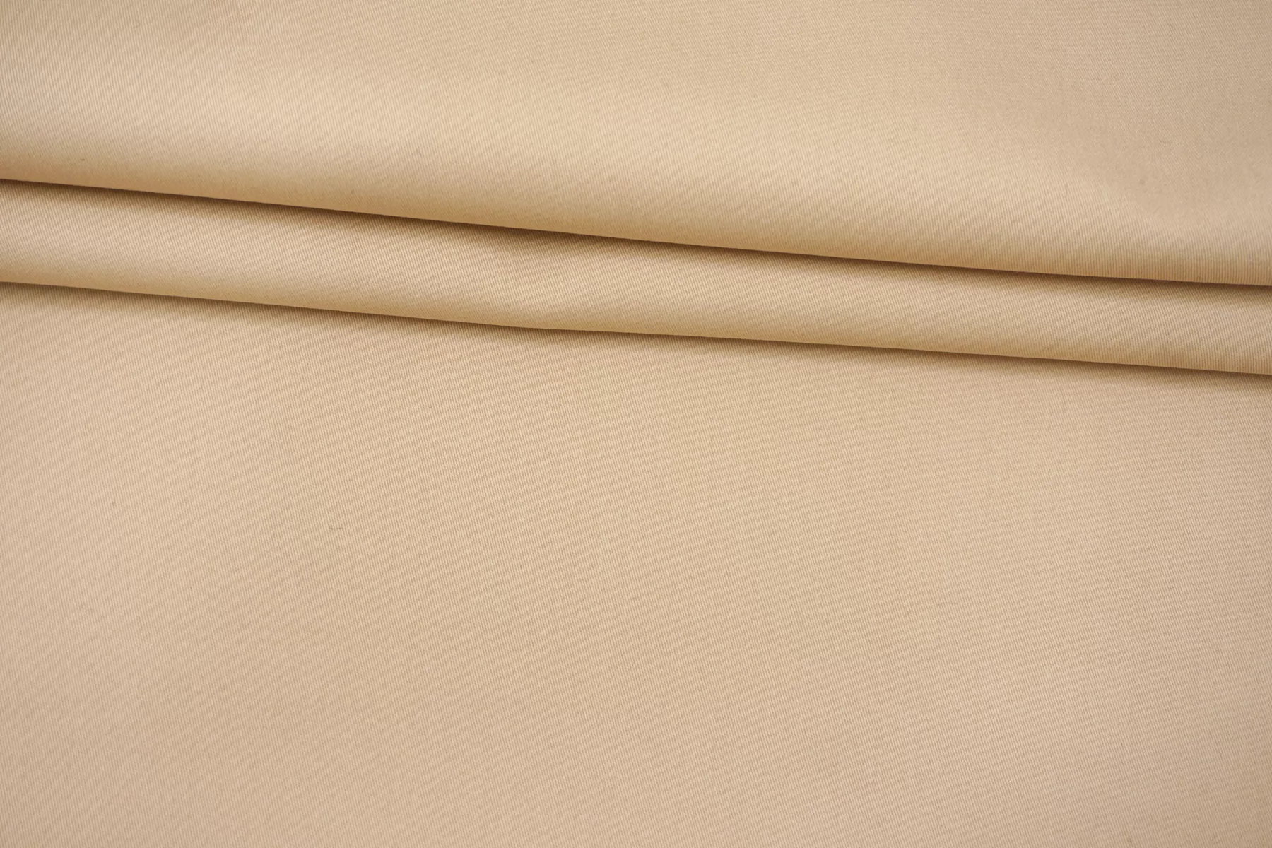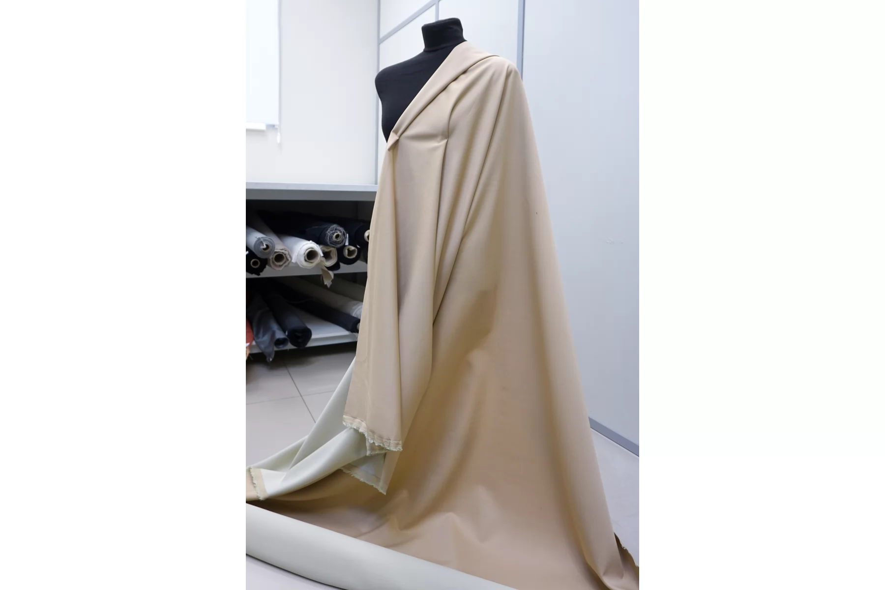 Необычная плащевая ткань от BURBERRY: лицевая сторона бежевого цвета из хлопка, водоотталкивающая, изнаночная сторона из шёлка, в светлом желтовато-бежевом цвете. Вода легко стекает с хлопковой стороны, но через какое-то время впитывается. Плетение диагональное. Материал гладкий, скользящий, шёлковая изнанка безумно приятная к телу. Не тянется. Держит форму, сминается умеренно. Подойдет для пошива тренча, куртки, парки, плаща и т.д.