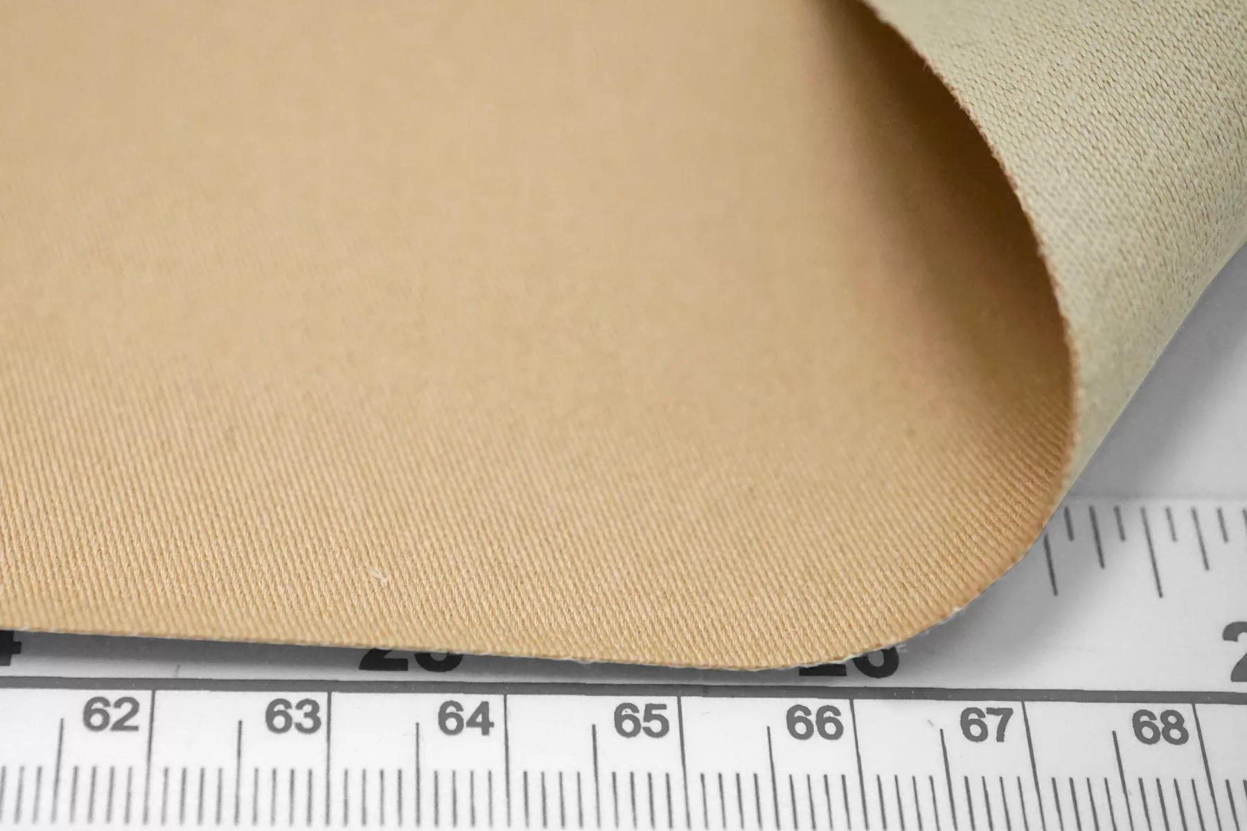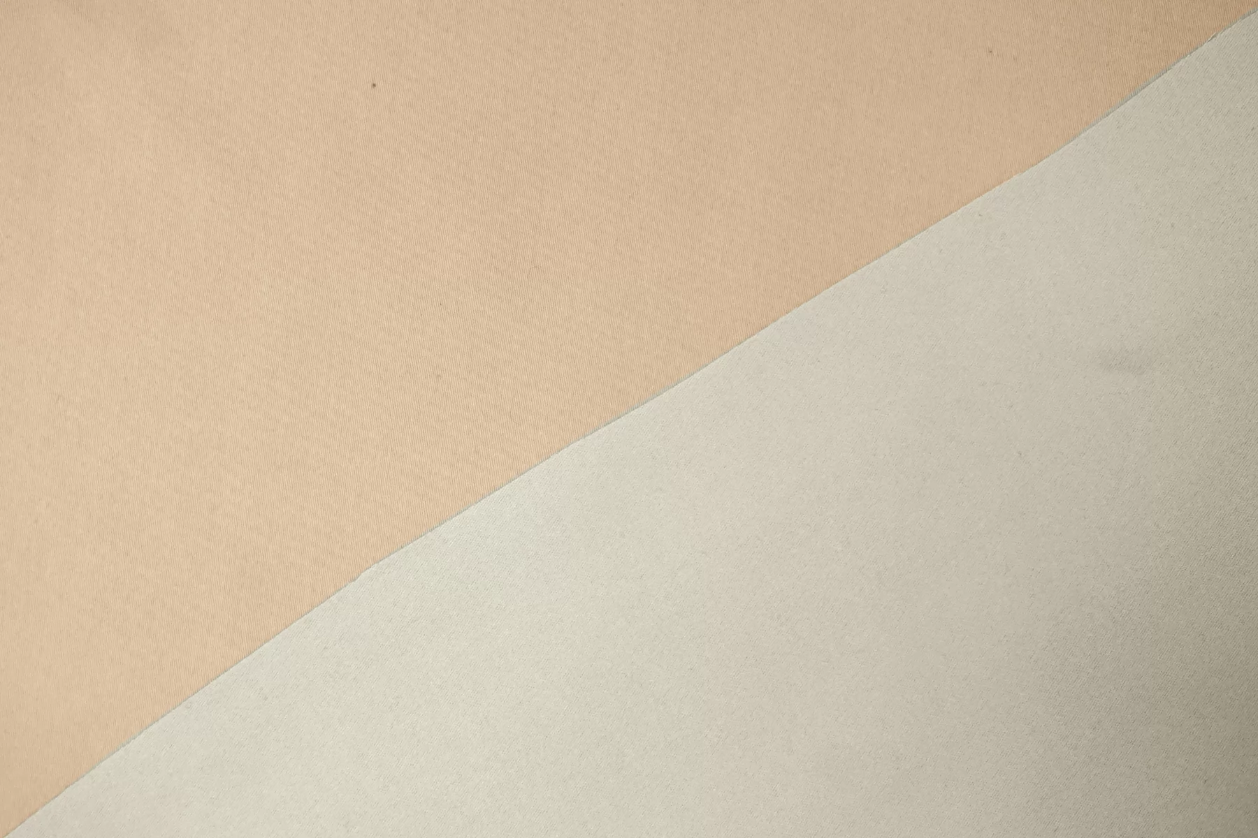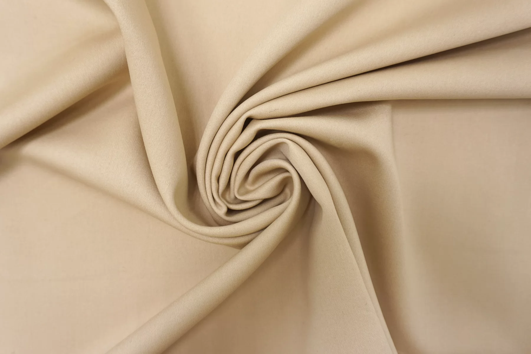 Необычная плащевая ткань от BURBERRY: лицевая сторона бежевого цвета из хлопка, водоотталкивающая, изнаночная сторона из шёлка, в светлом желтовато-бежевом цвете. Вода легко стекает с хлопковой стороны, но через какое-то время впитывается. Плетение диагональное. Материал гладкий, скользящий, шёлковая изнанка безумно приятная к телу. Не тянется. Держит форму, сминается умеренно. Подойдет для пошива тренча, куртки, парки, плаща и т.д.